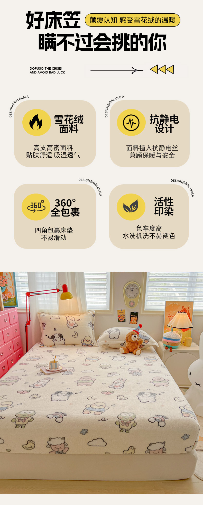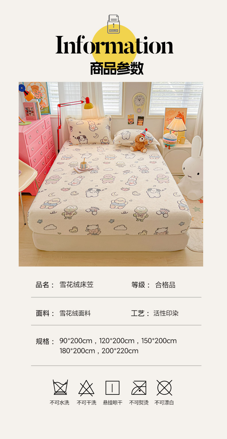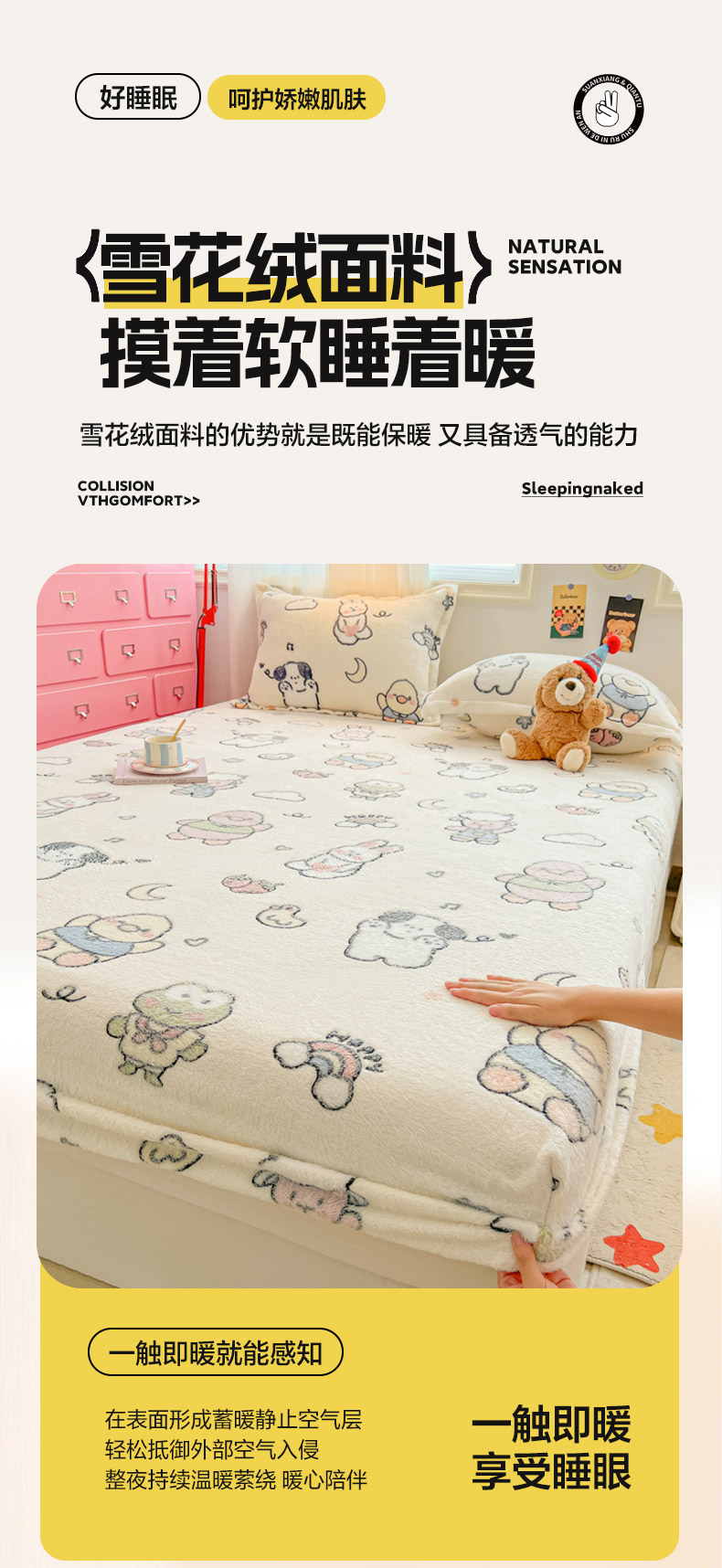 • 91家纺网 家纺一手货源 找家纺 韩巢家纺 2024新款加厚雪花绒卡通印花保暖床笠三件套 小伙伴