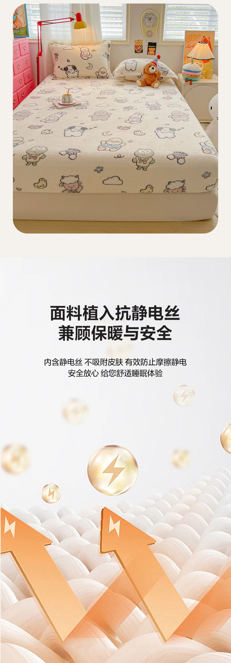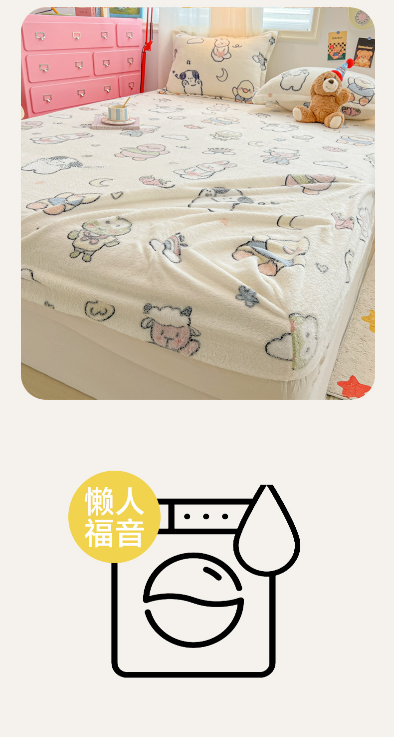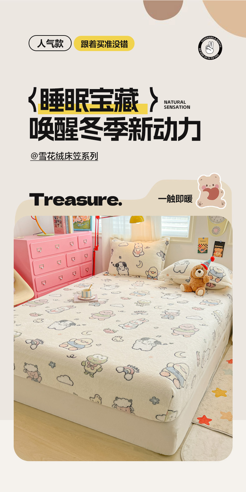 • 91家纺网 家纺一手货源 找家纺 韩巢家纺 2024新款加厚雪花绒卡通印花保暖床笠三件套 小伙伴