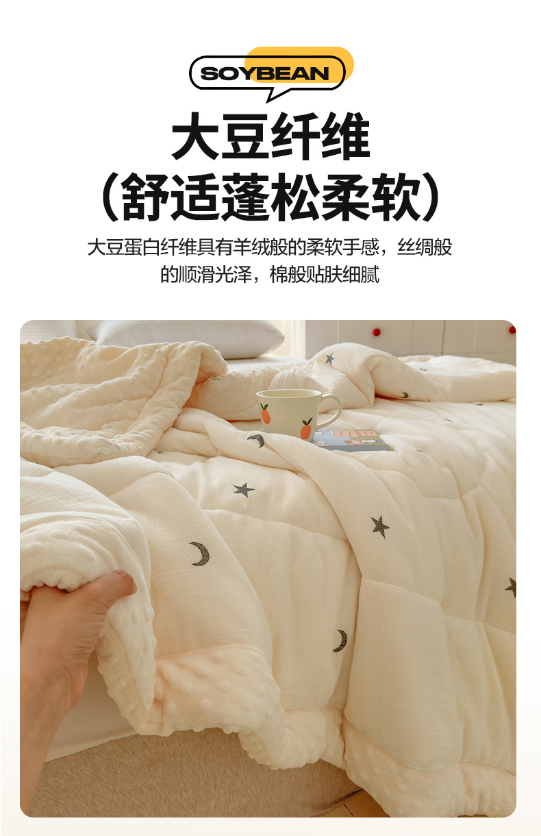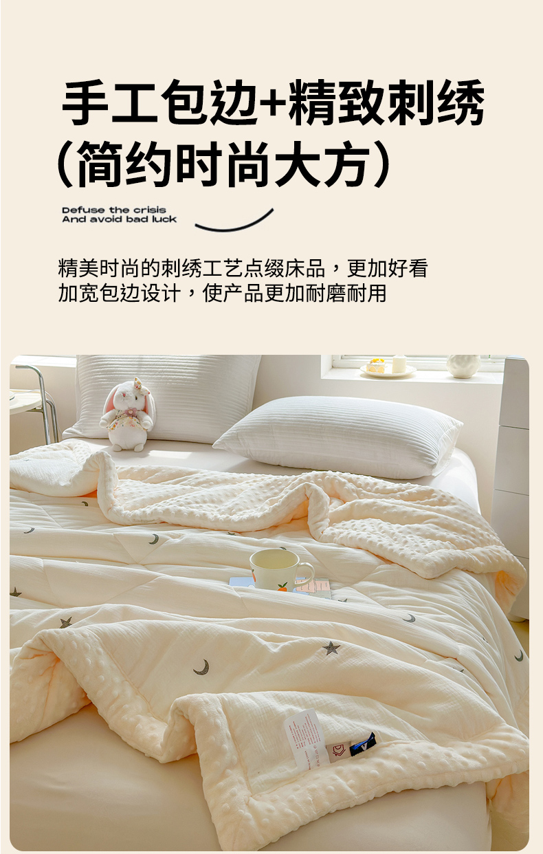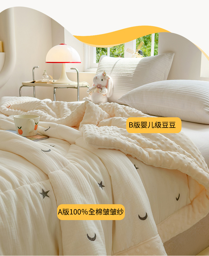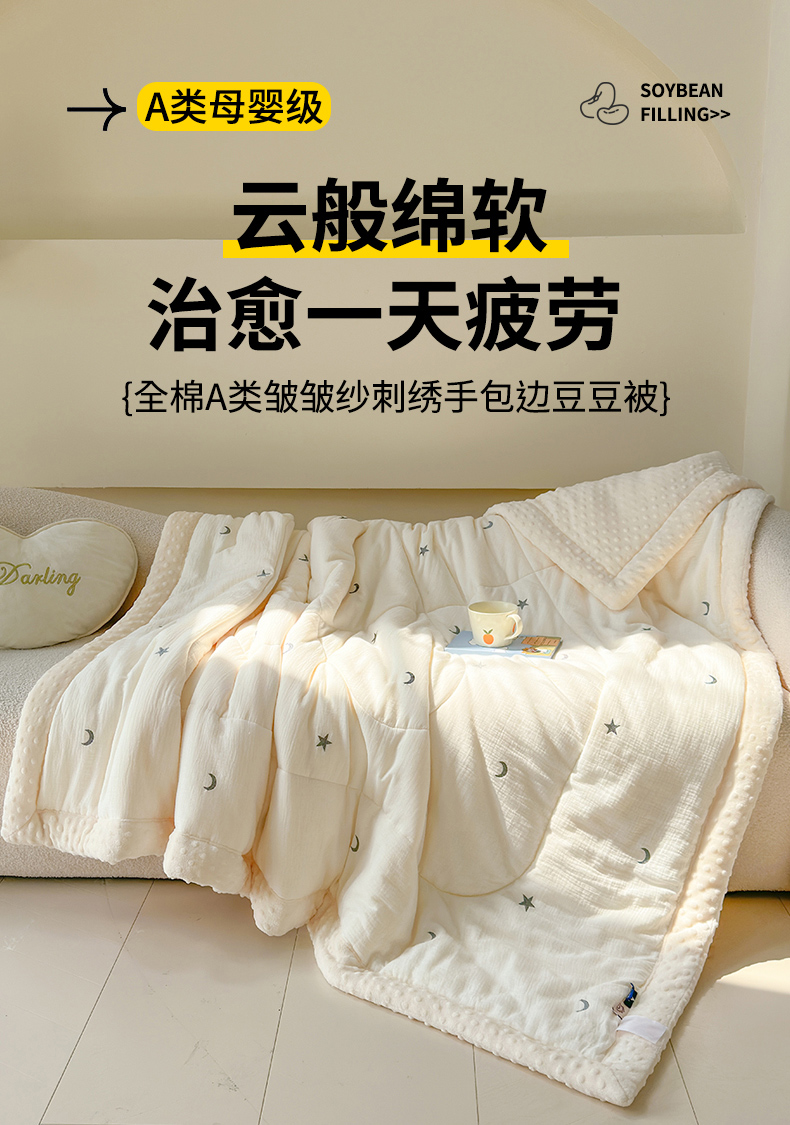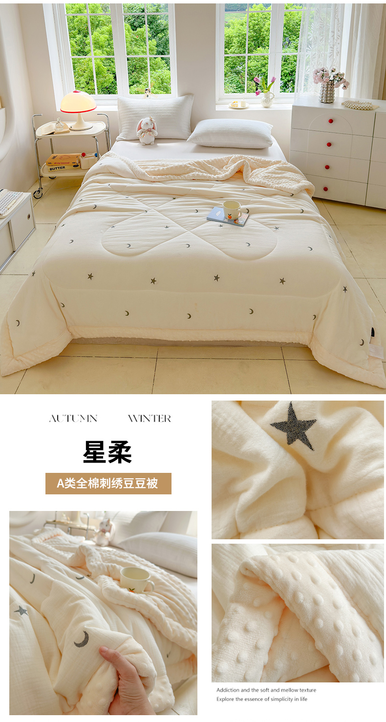 商品名称:木楌家居 2025新款全棉A类皱皱纱刺绣手包边豆豆被 星柔