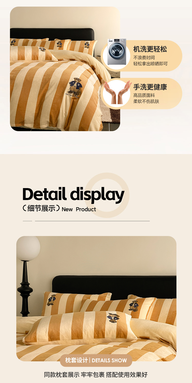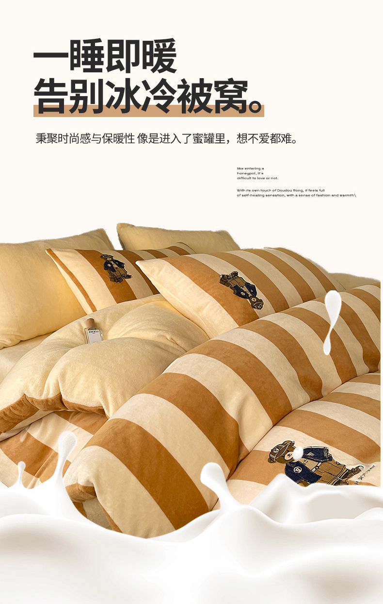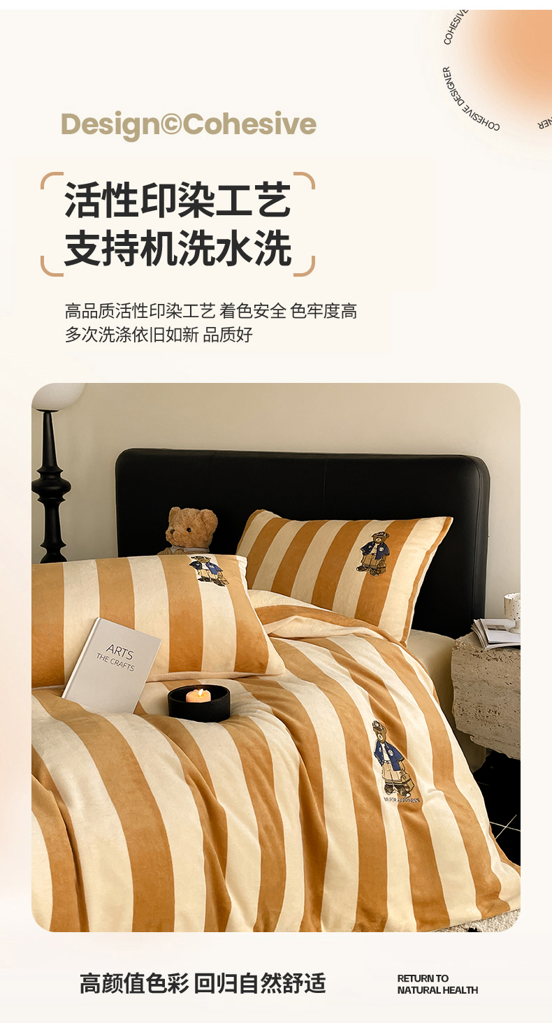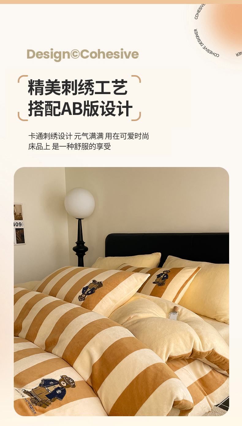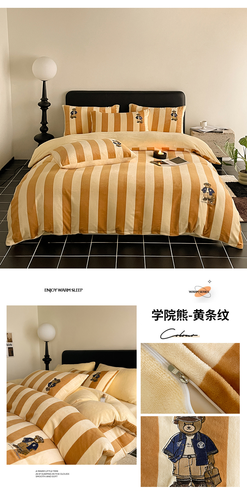 商品名称:红嘴企鹅 2025新款A类加厚牛奶绒刺绣四件套 学院熊-黄条纹