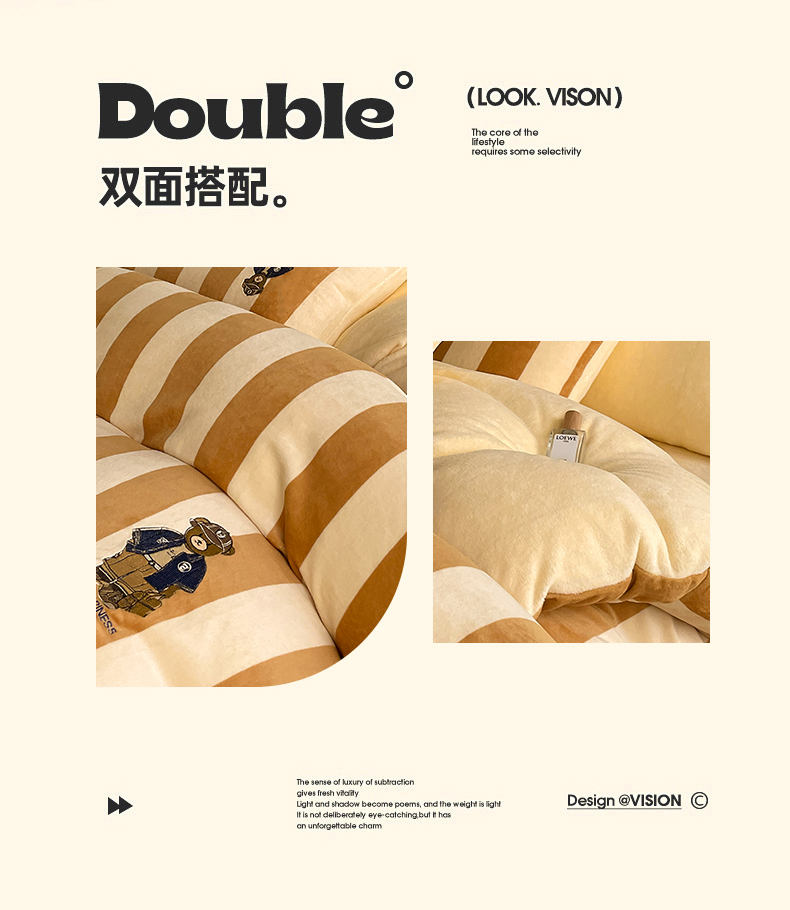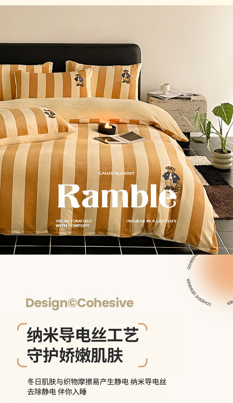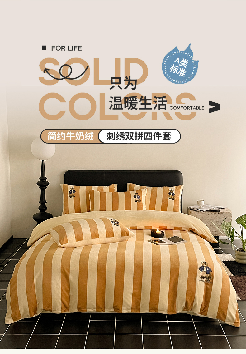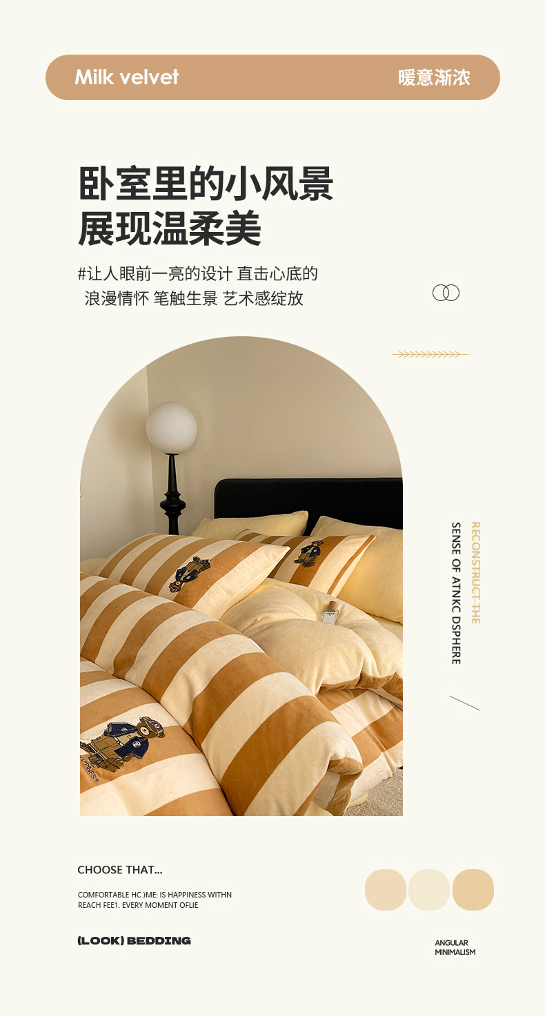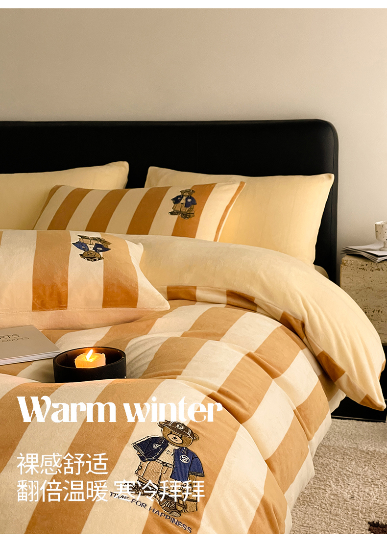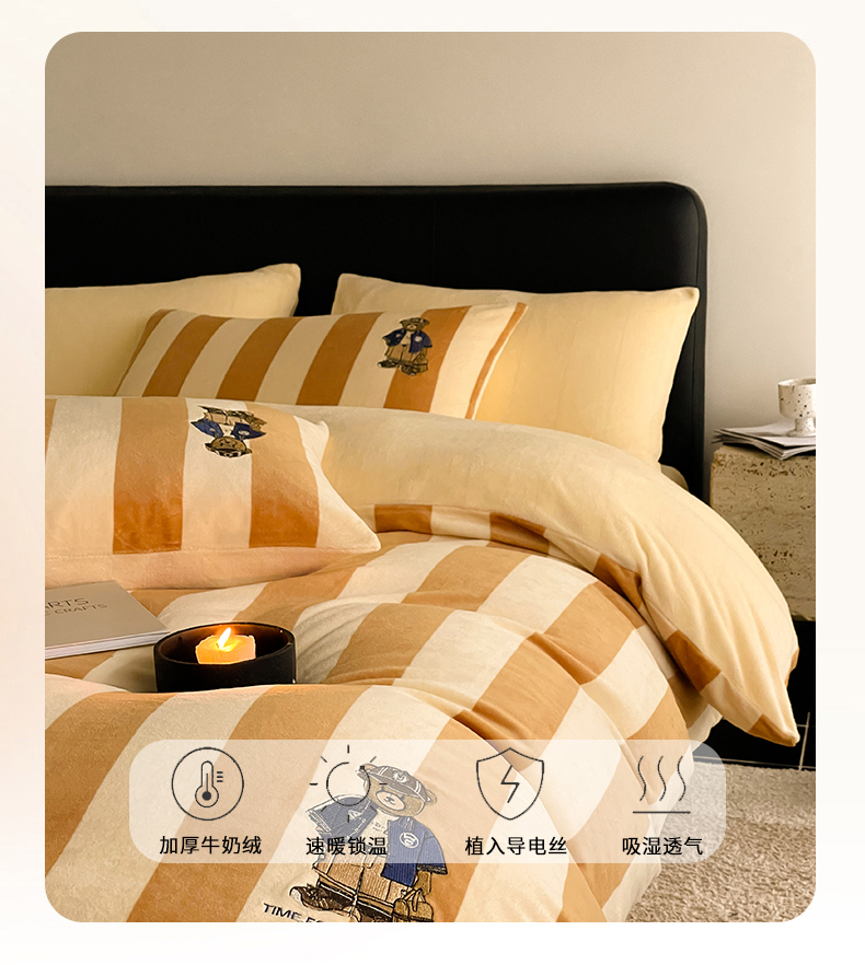 商品名称:红嘴企鹅 2025新款A类加厚牛奶绒刺绣四件套 学院熊-黄条纹