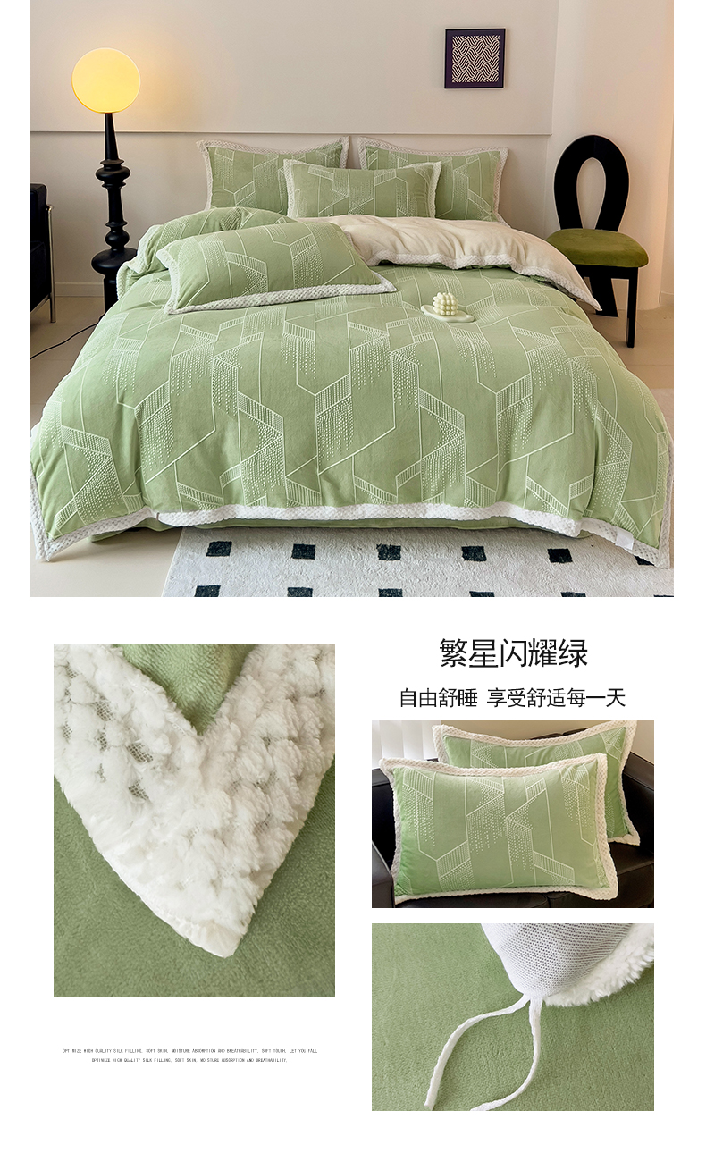 商品名称:2024新款简约包边全消光雕花牛奶绒兔兔绒四件套 包边绒 繁星闪耀绿