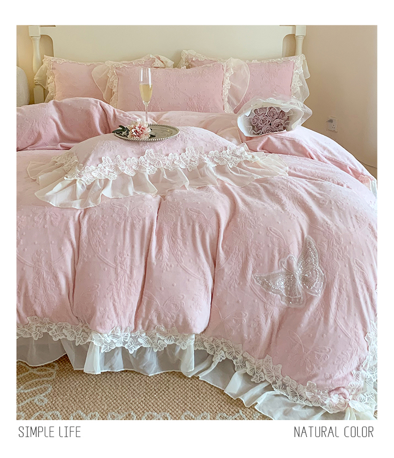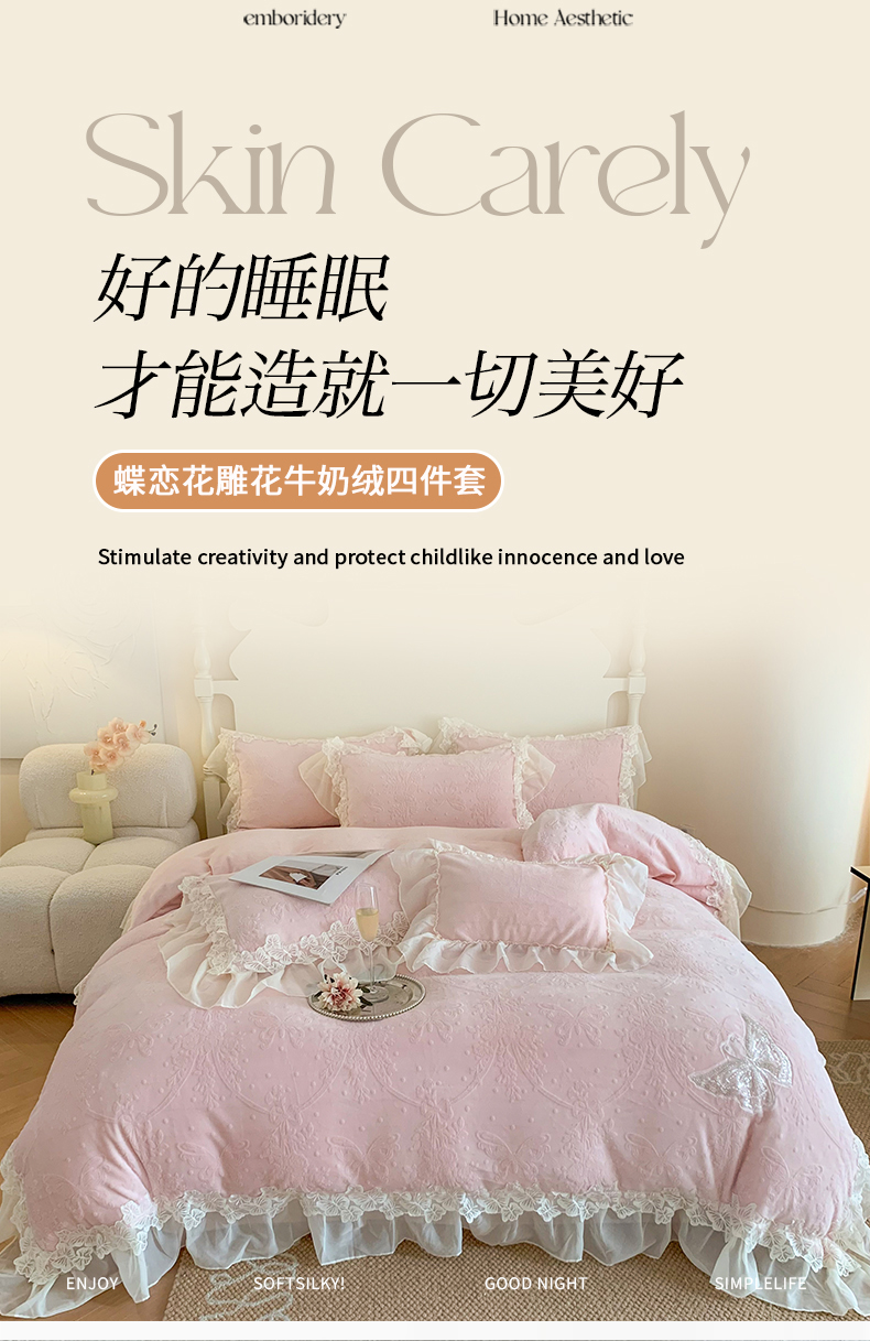 商品名称:吾欢心 2024新款蝶恋花高品质立体雕花绒加厚牛奶绒四件套床单款床盖款 绒蝶恋花粉
