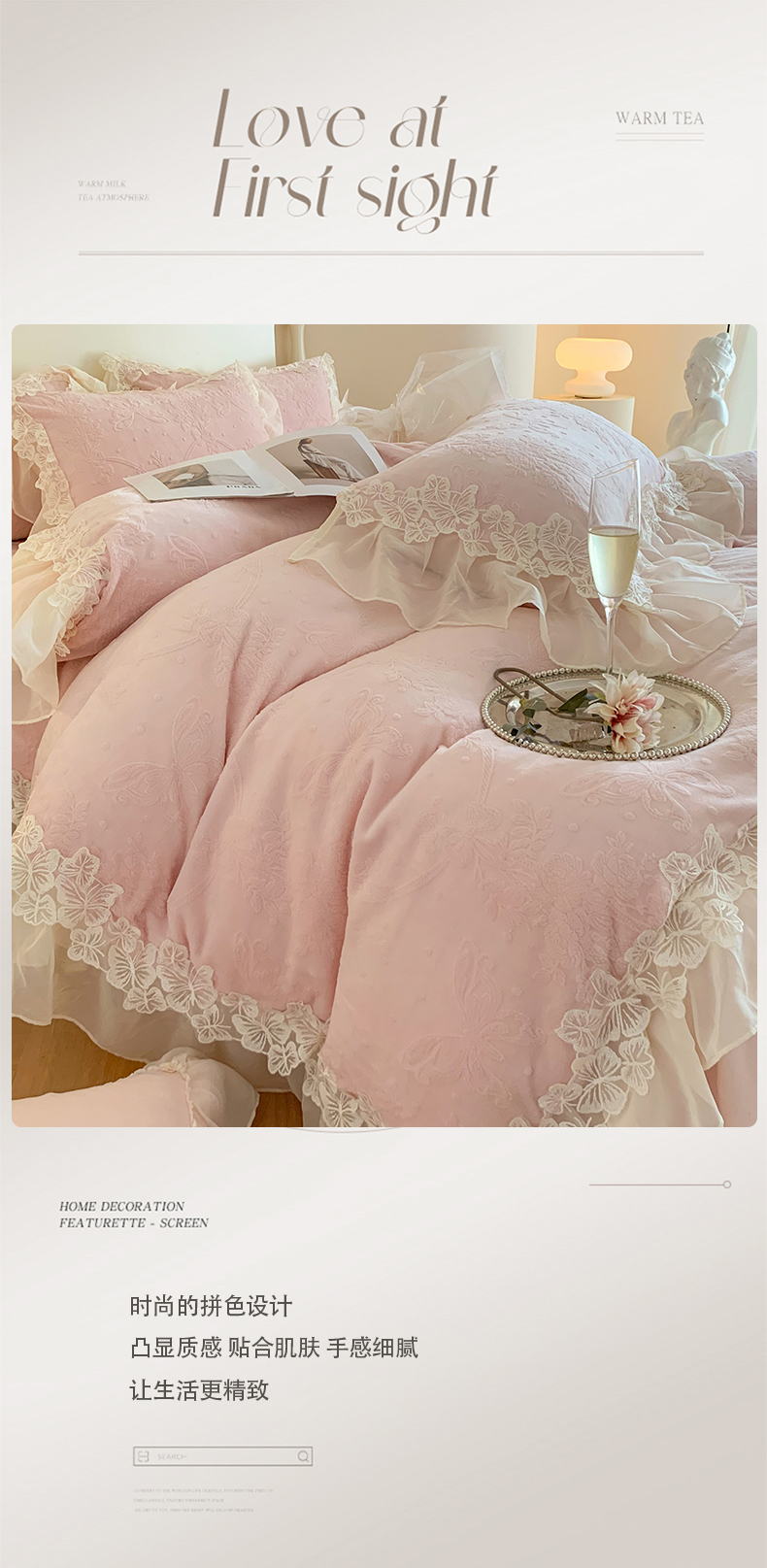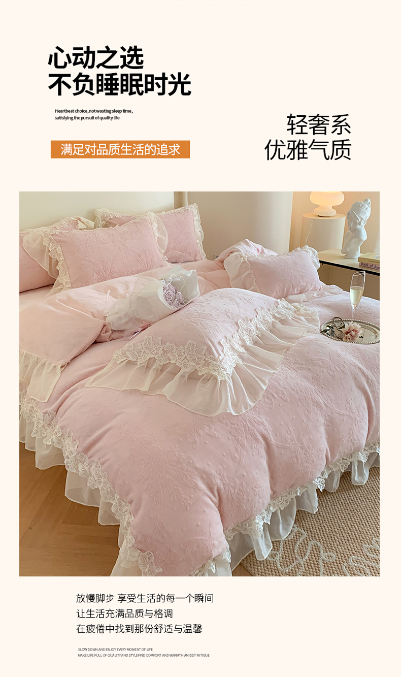 (总)吾欢心 2025秋冬新款加厚雕花绒婴儿绒安娜贝尔系列法式双层花边四件套,安娜贝尔白,安娜贝尔粉,安娜贝尔咖,安娜贝尔蓝,安娜贝尔绿,安娜贝尔紫