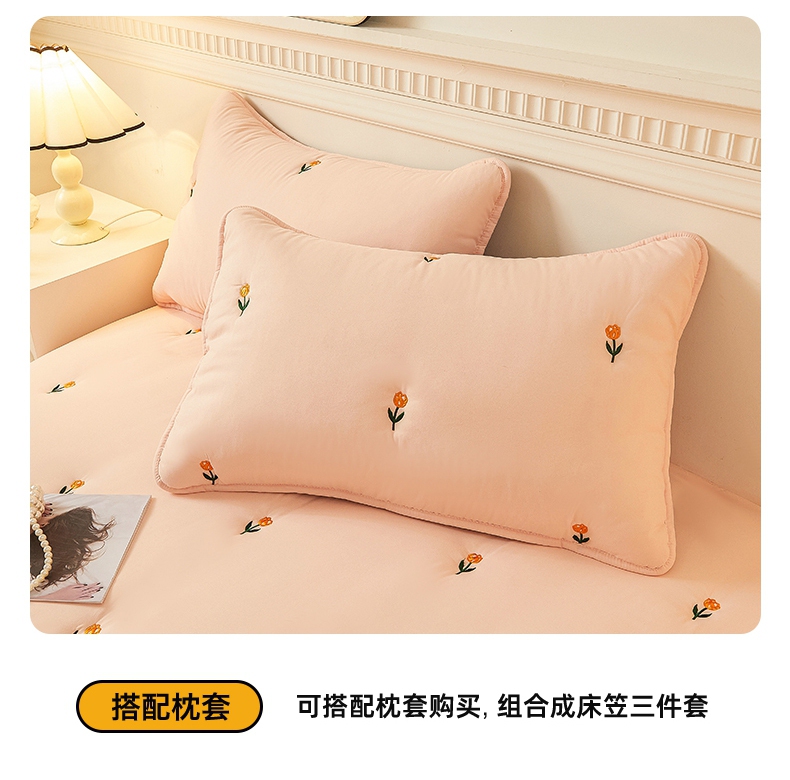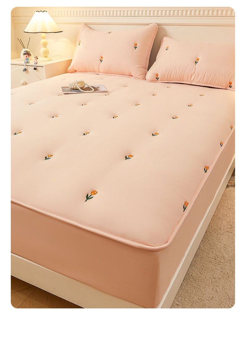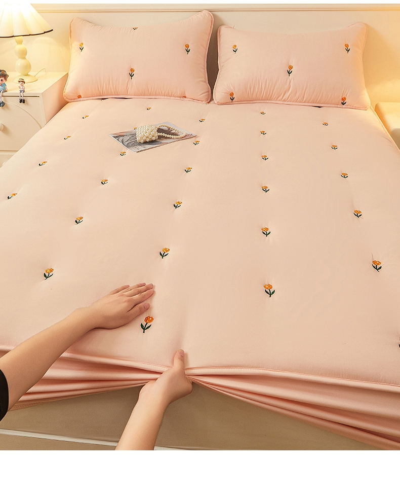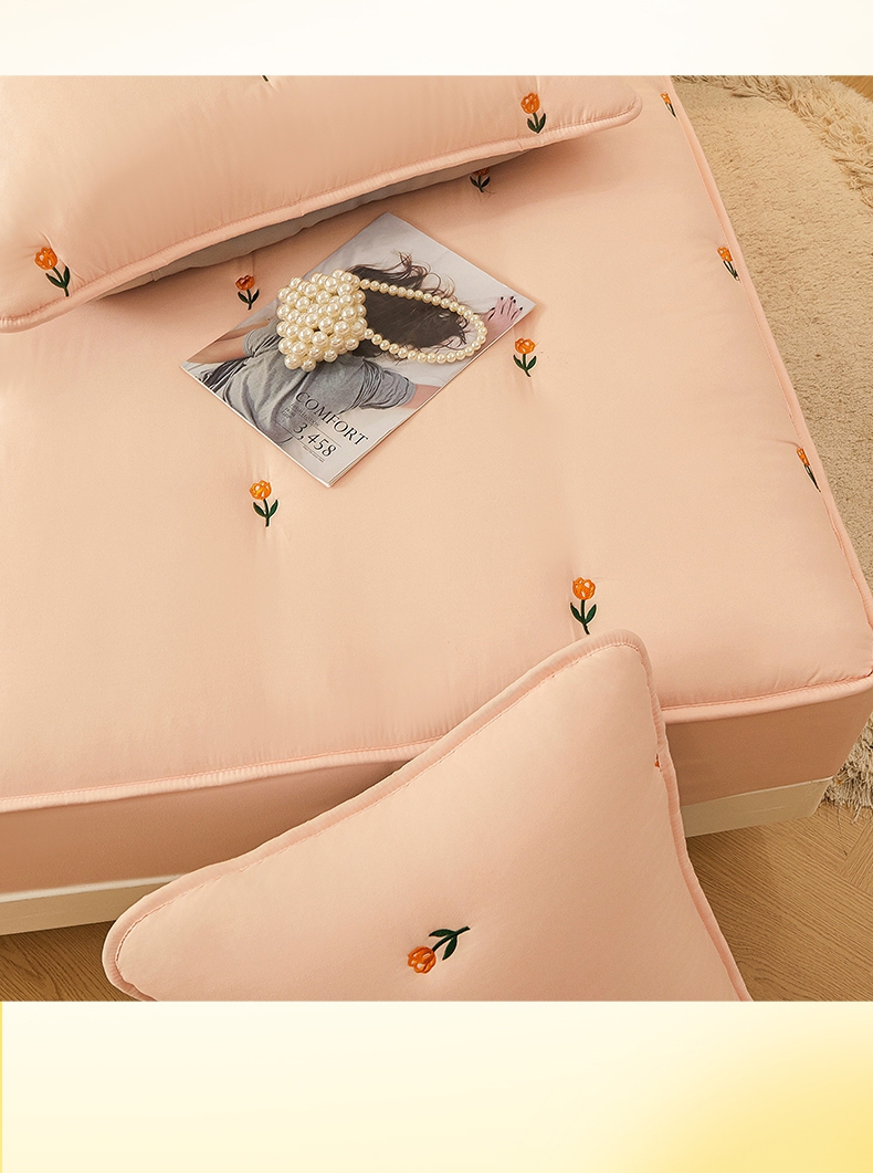 2025新款A类水洗棉大豆刺绣床笠 小花-奶油粉