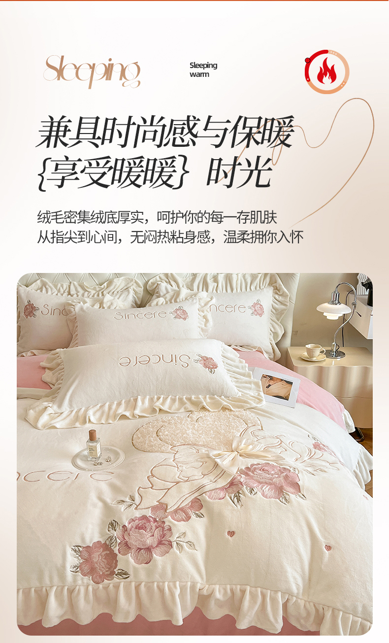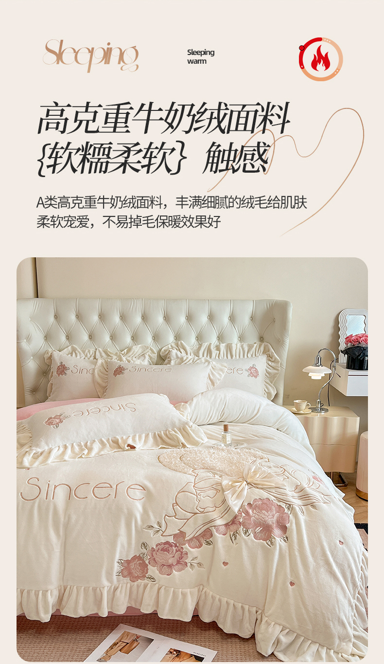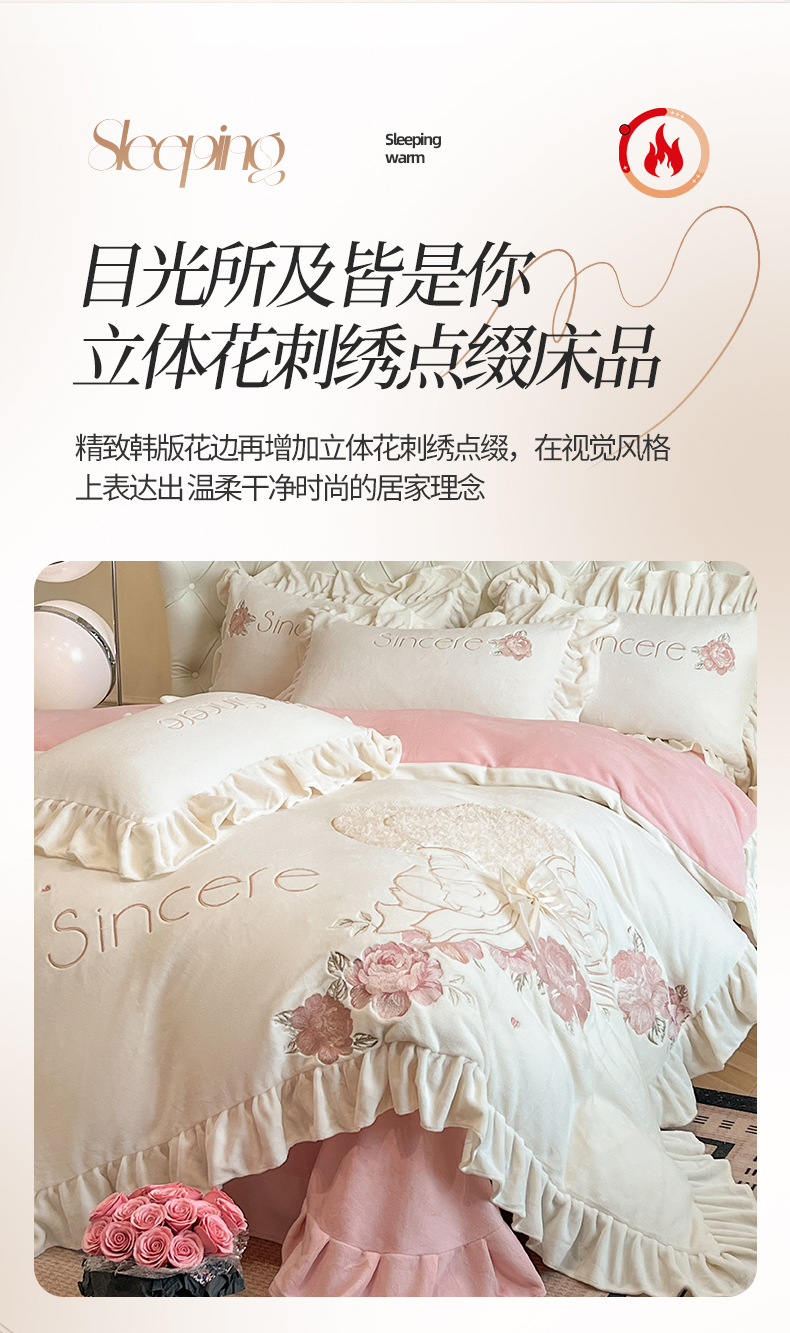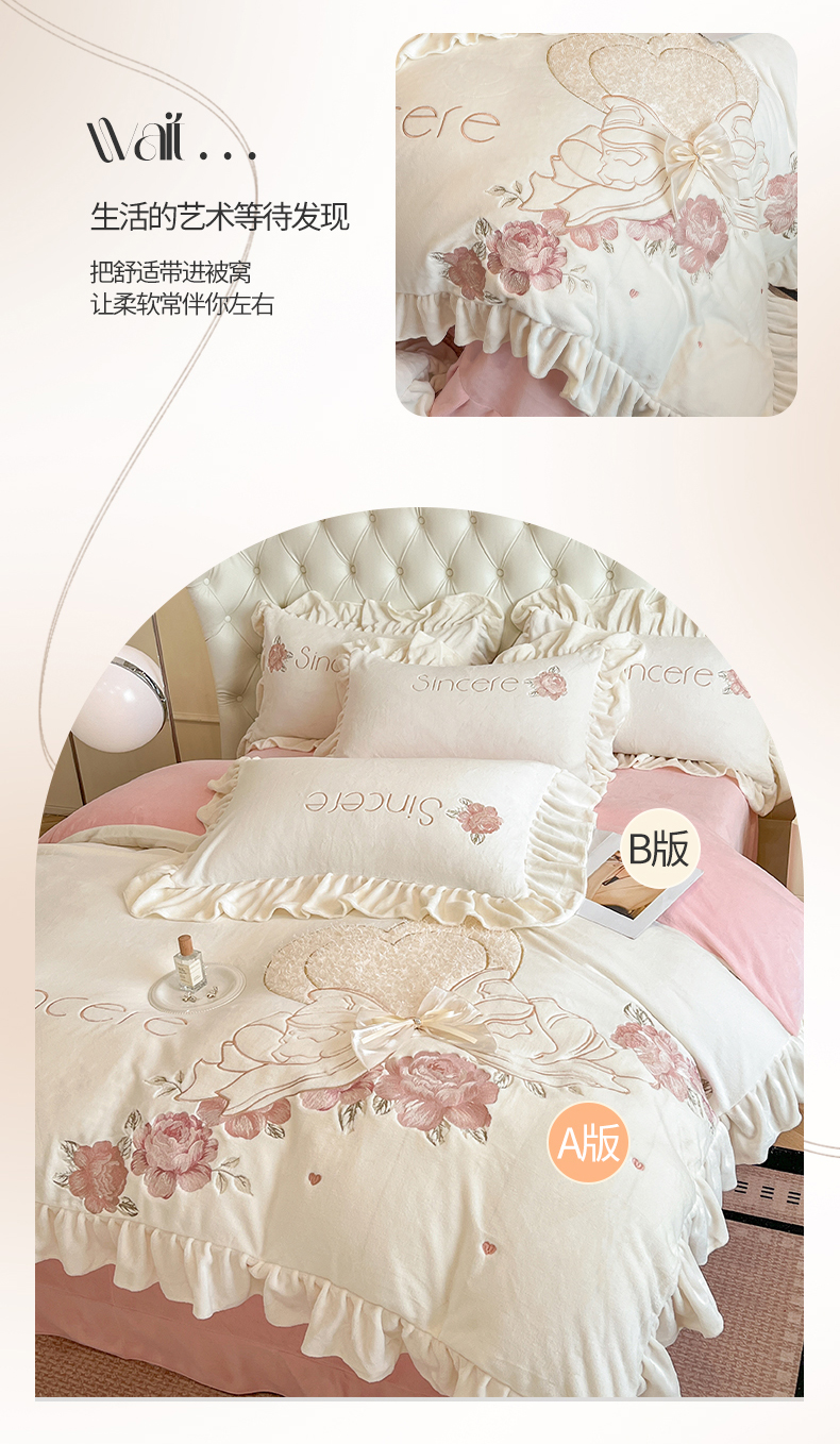 商品名称:(总)爱家(原缔乐家纺) 2024新款A类高克重牛奶绒立体花刺绣四件套-心心相印