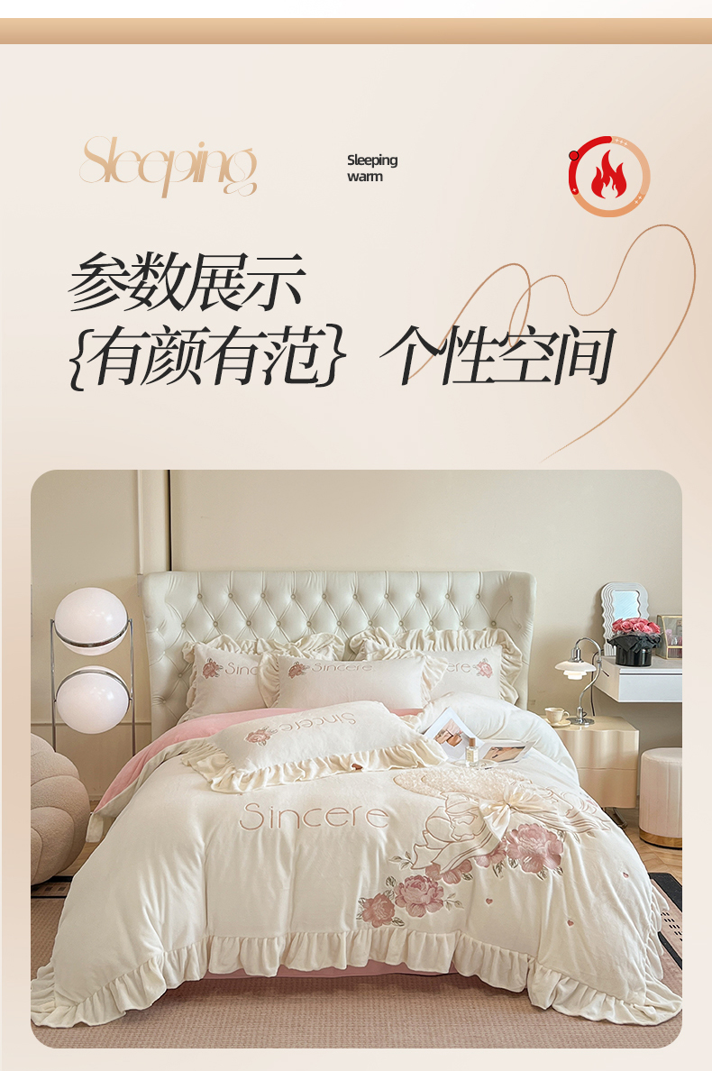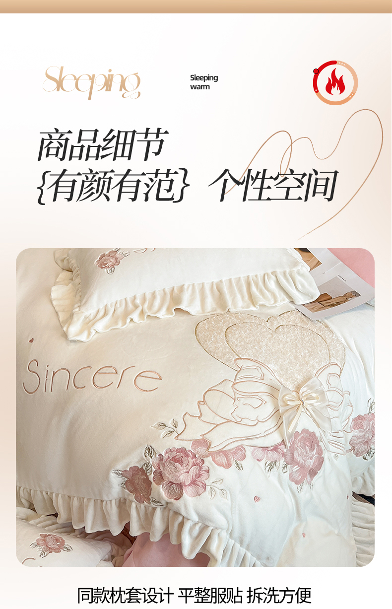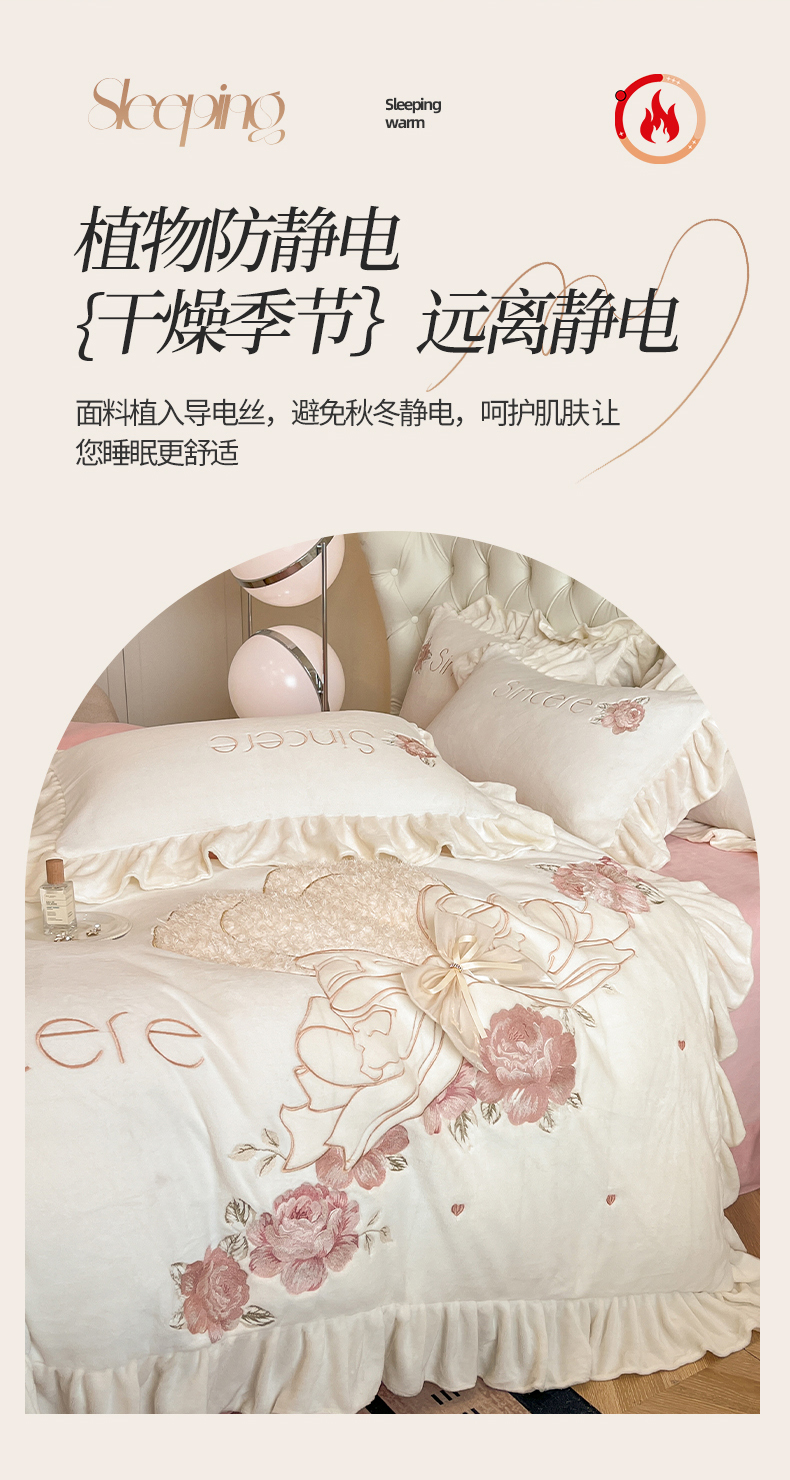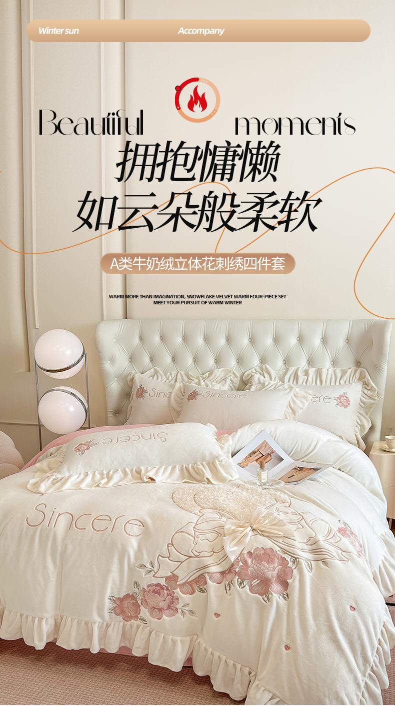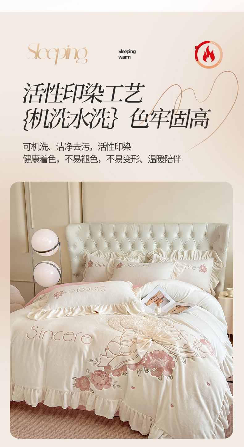 商品名称:(总)爱家(原缔乐家纺) 2024新款A类高克重牛奶绒立体花刺绣四件套-心心相印
