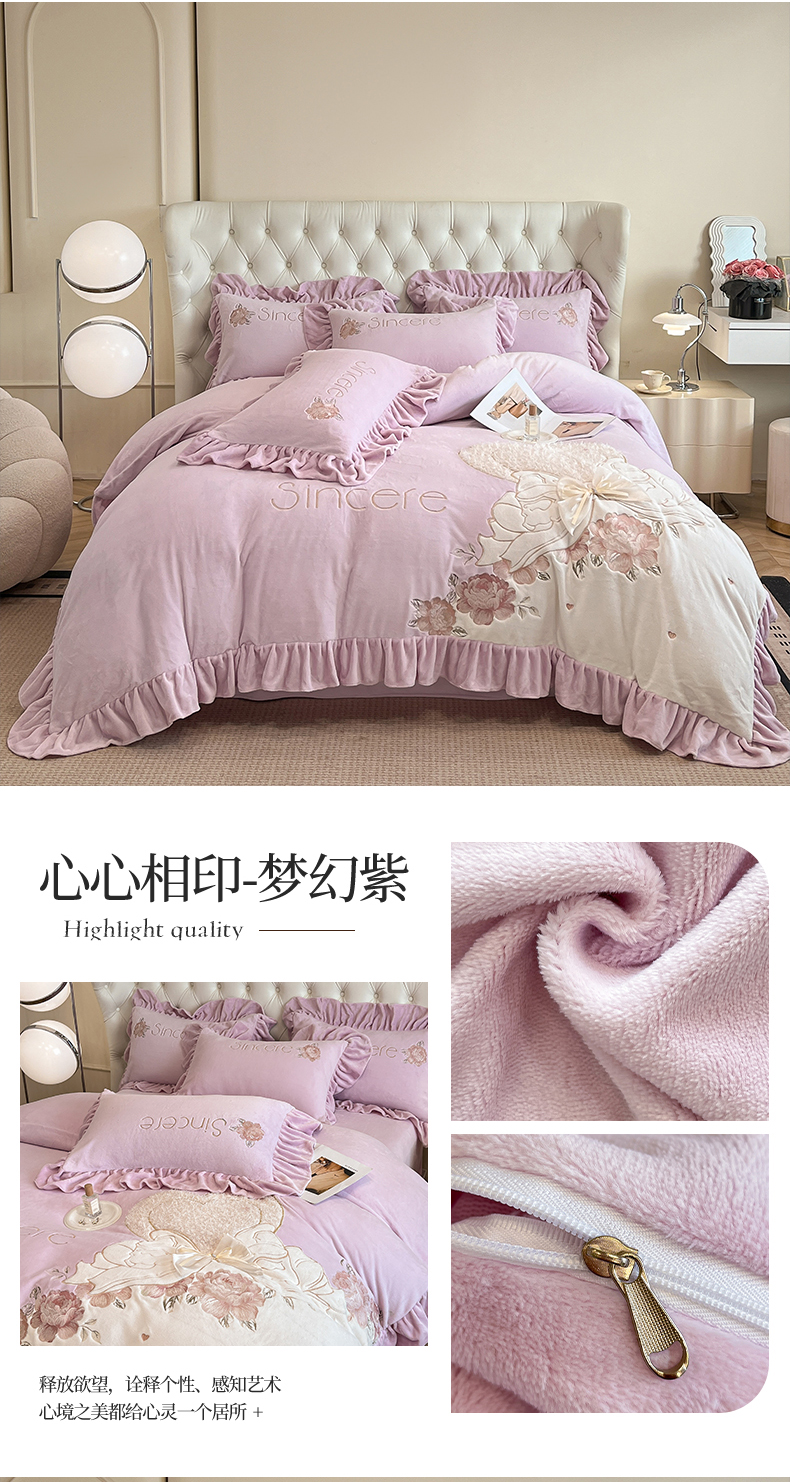 (总)爱家(原缔乐家纺) 2025新款牛奶雕花绒四件套-香香公主,香香公主-公主粉,香香公主-梦幻紫,香香公主-奶油黄