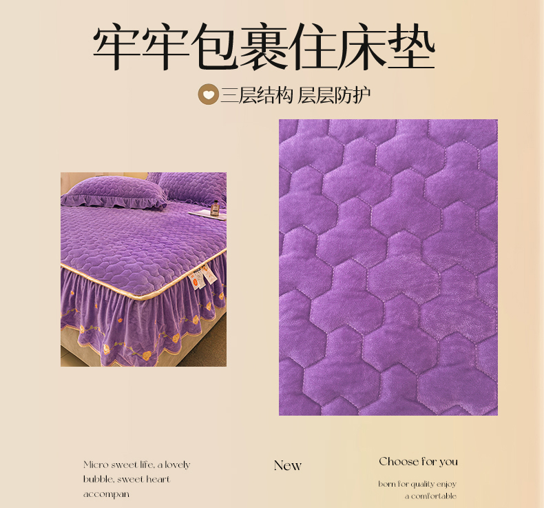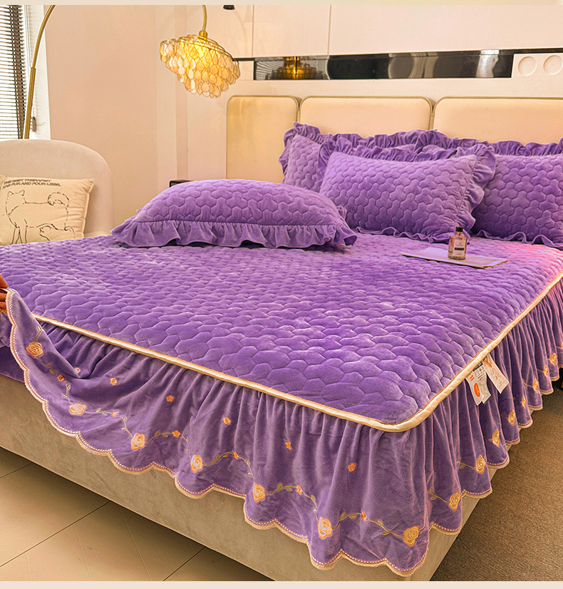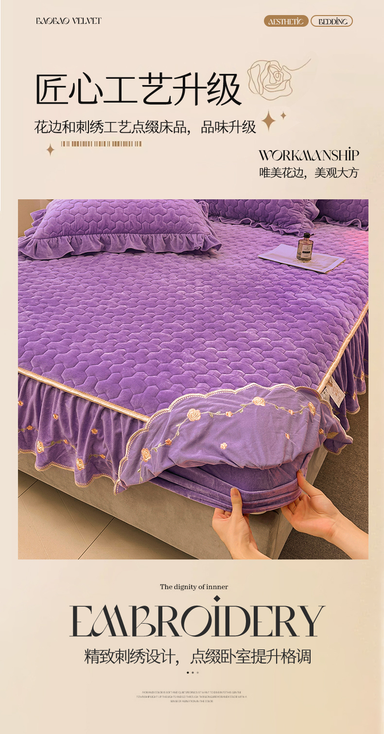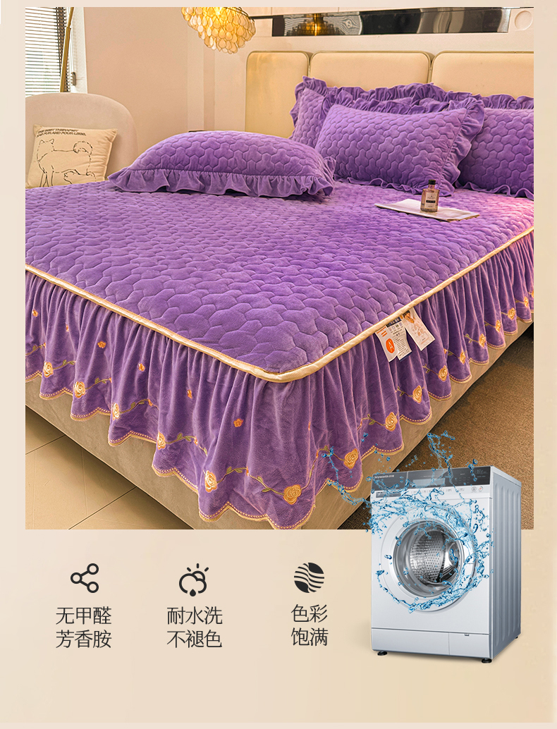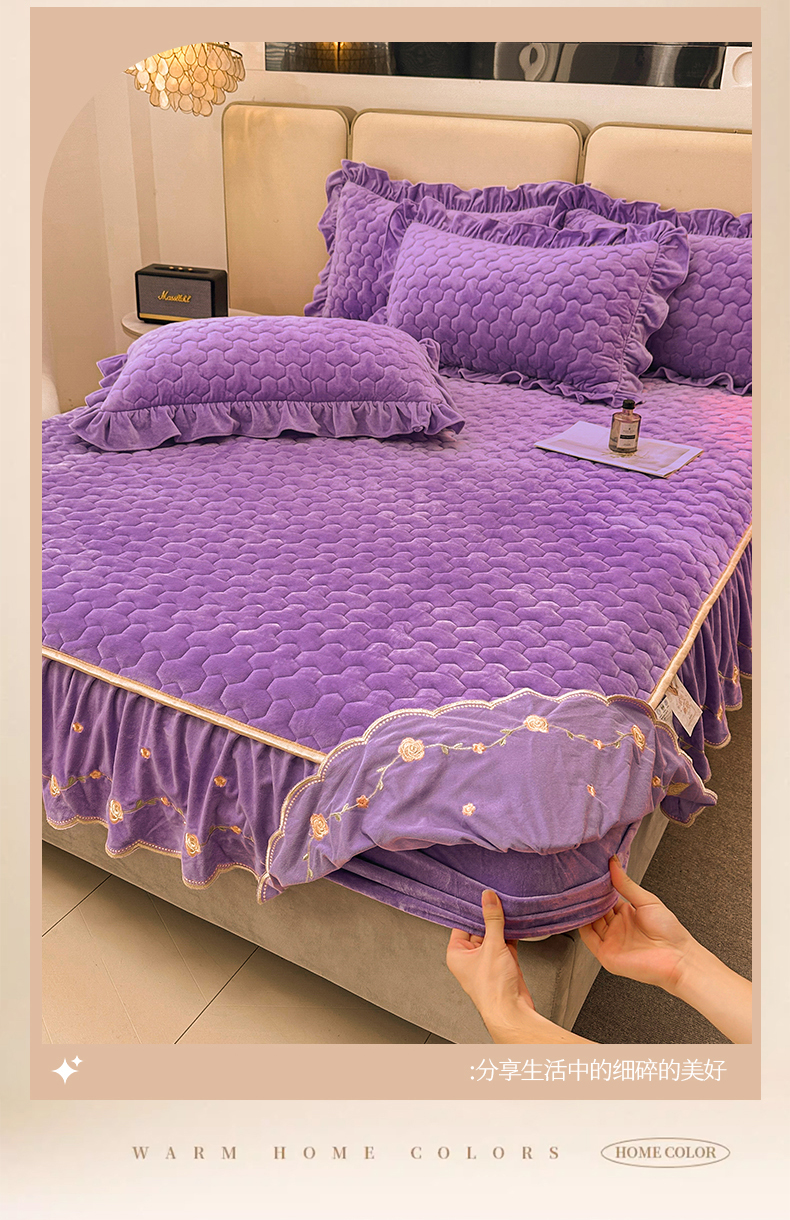 (总)恒爱家纺 2025新款牛奶绒贴布绣夹棉床裙四件套,豆沙红,浪漫紫,天空蓝,温馨粉,象牙白