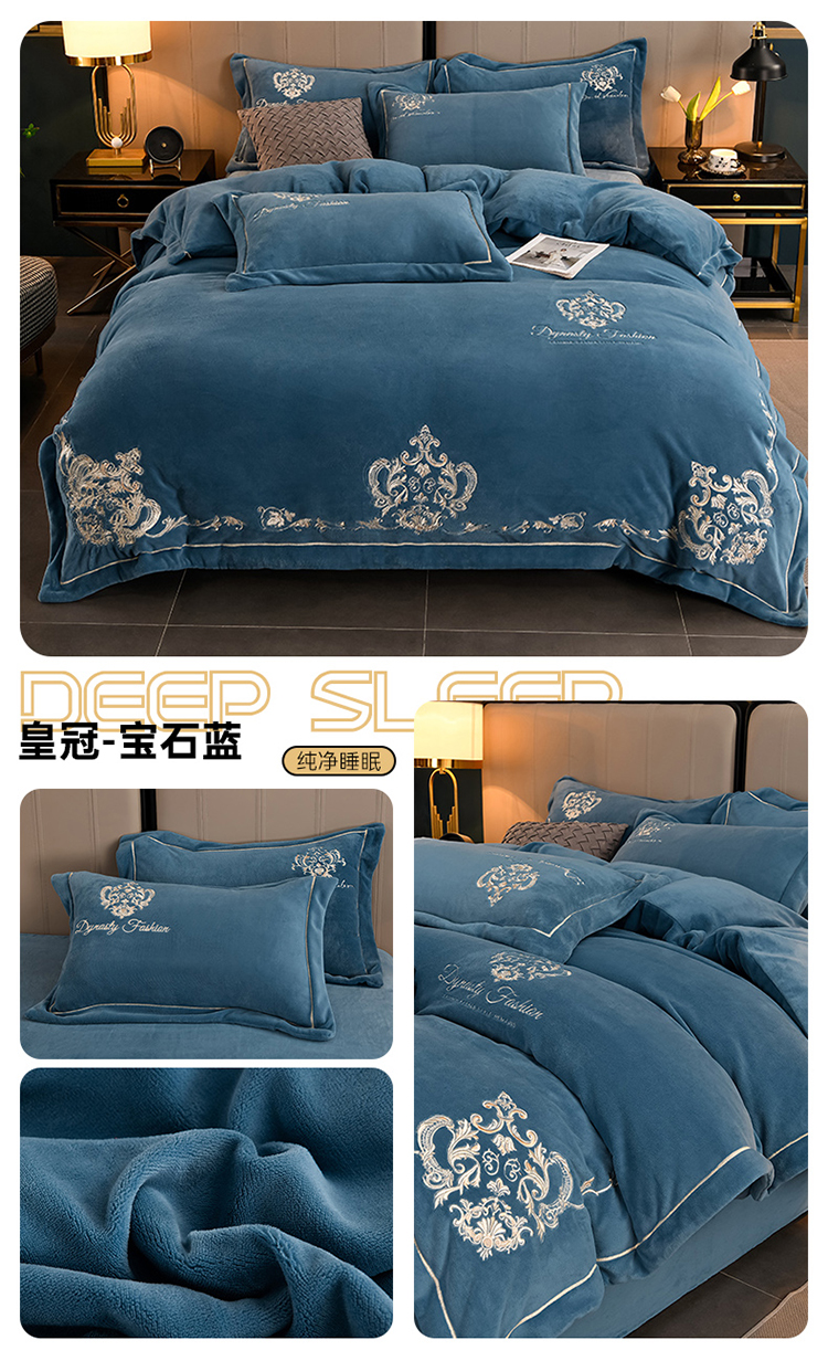 商品名称:沐妍家纺 2024新款重工刺绣绣花纯色牛奶绒四件套皇冠-宝石蓝