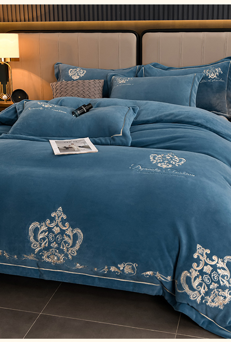 沐妍家纺 2024新款重工刺绣绣花纯色牛奶绒四件套皇冠-宝石蓝