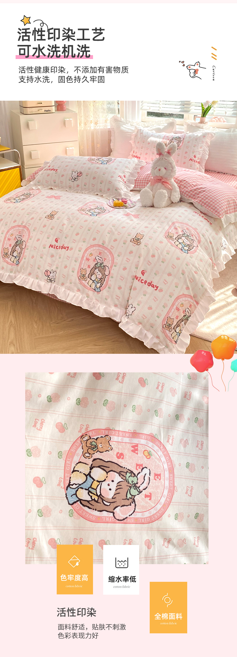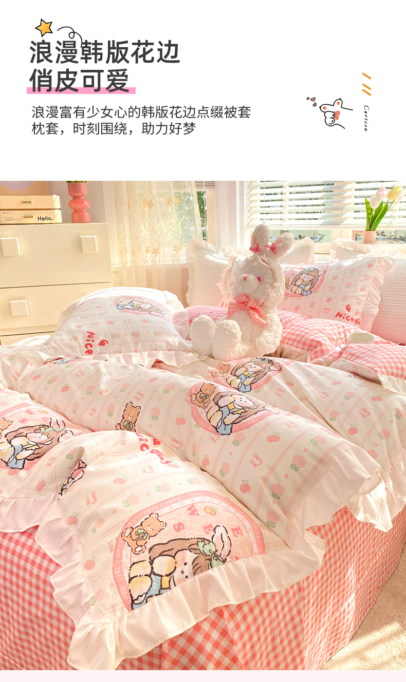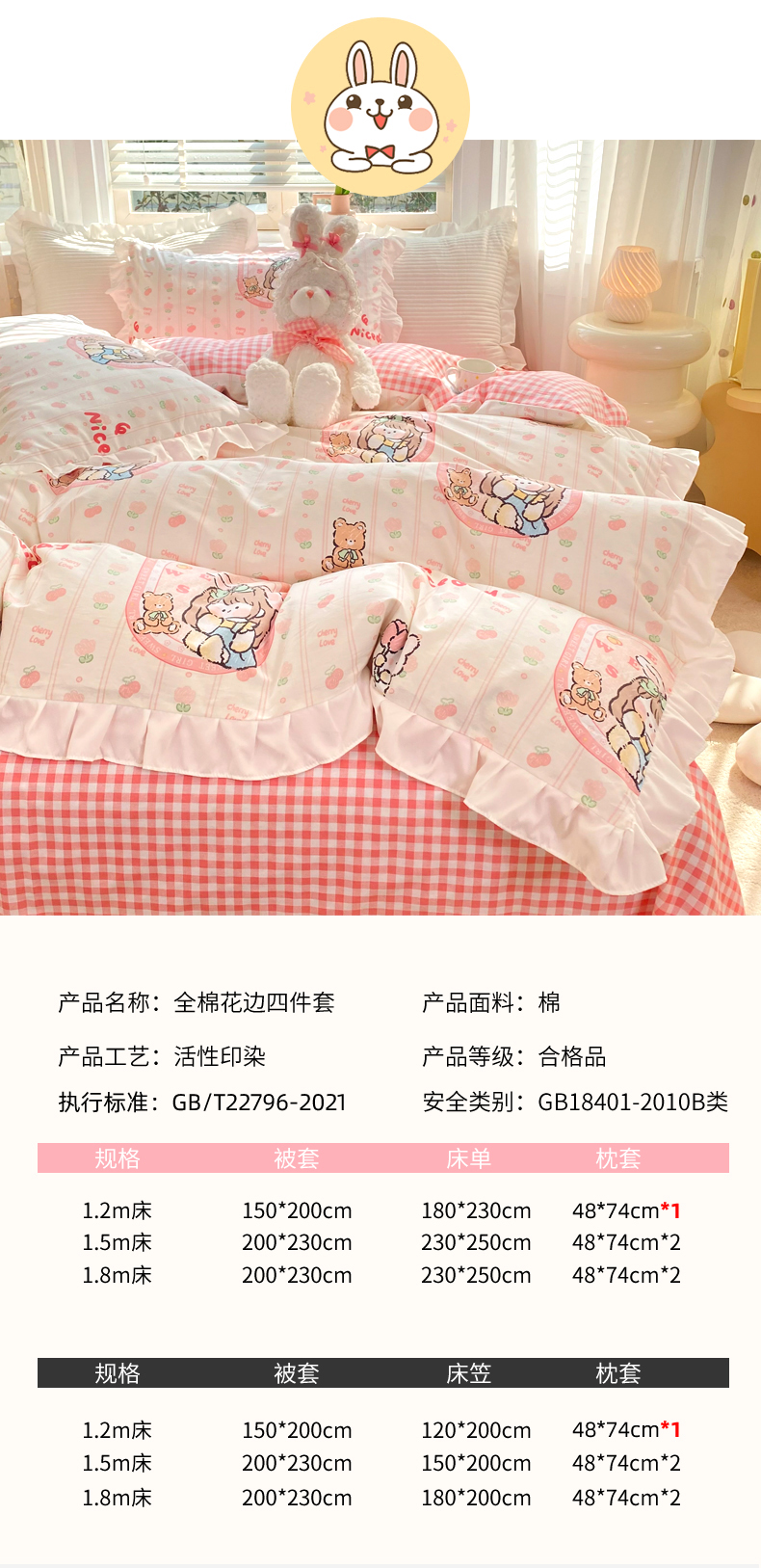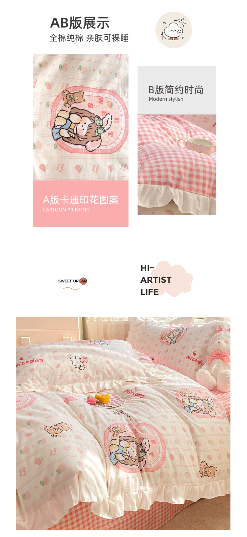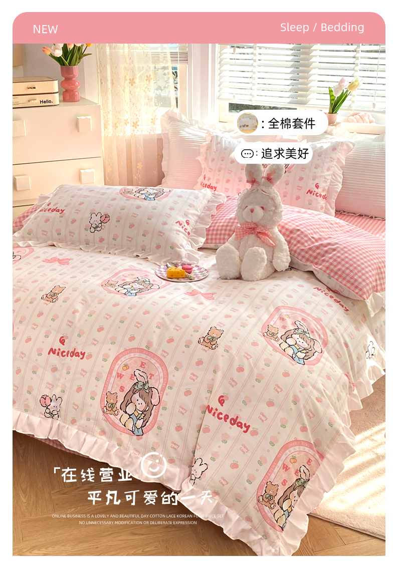 当前位置: 91家纺网 > 商品网购 > 床品套件 > 四件套 > 全棉普通四件套 > 玉元坊 2025新款春夏公主风花边被套床裙款全棉纯棉四件套三件套 公主兔