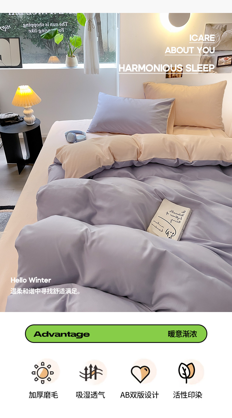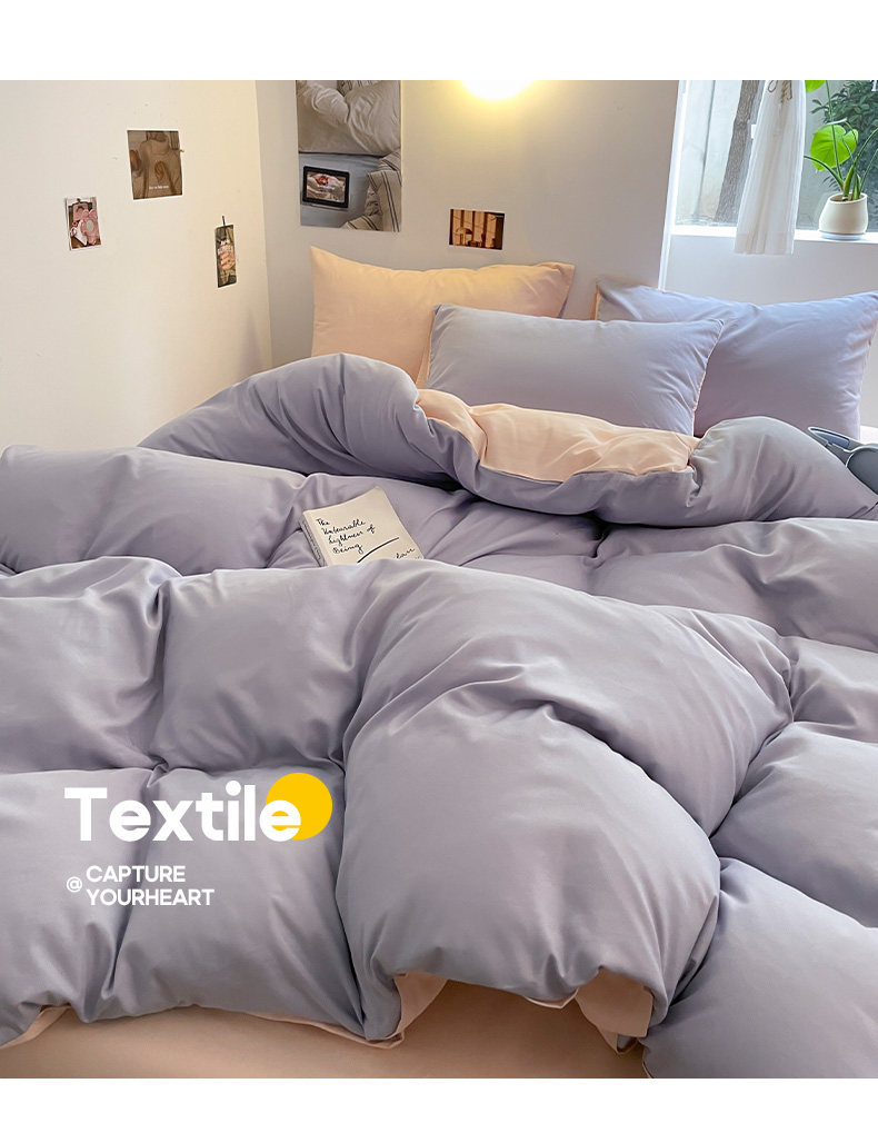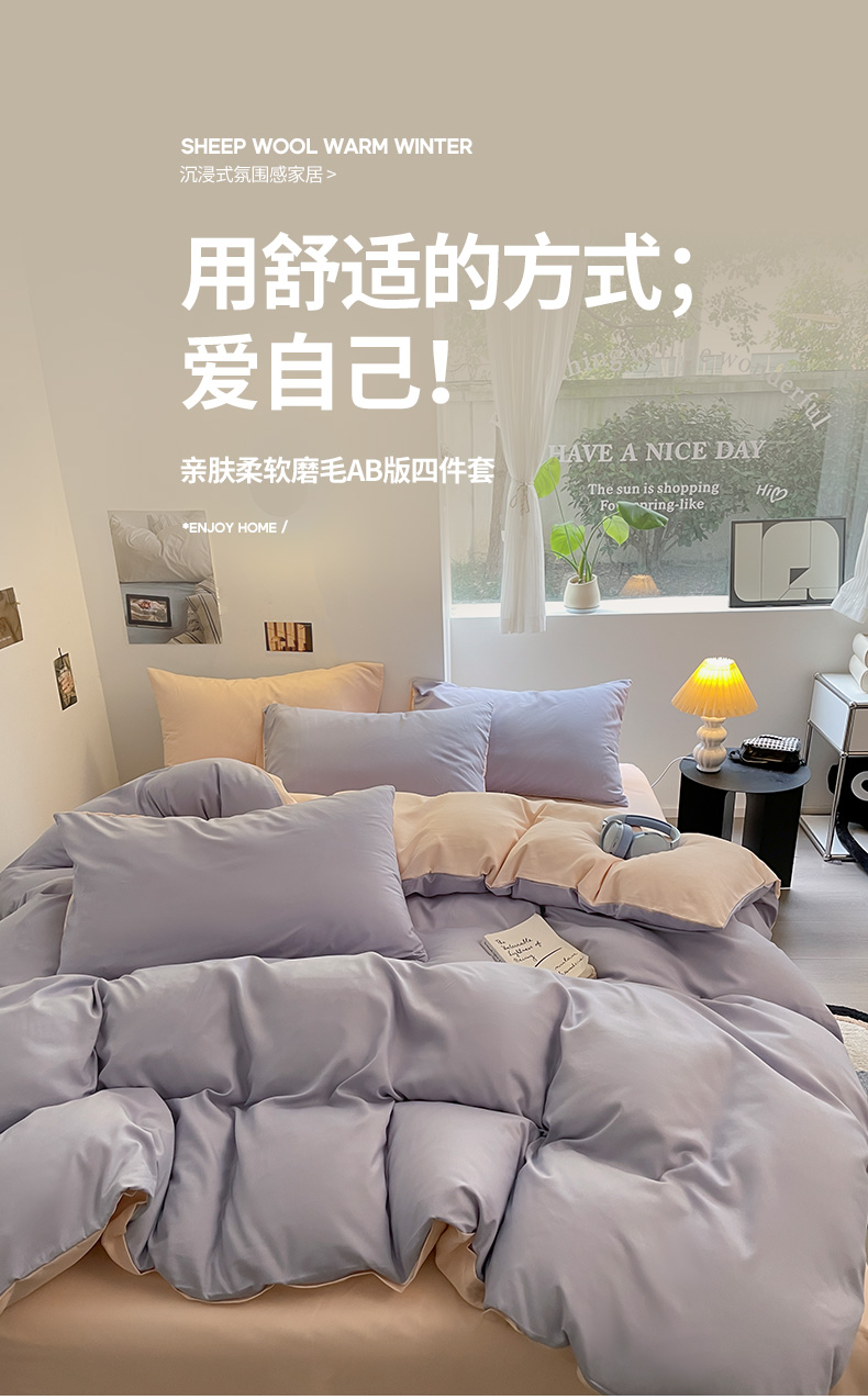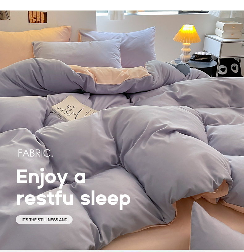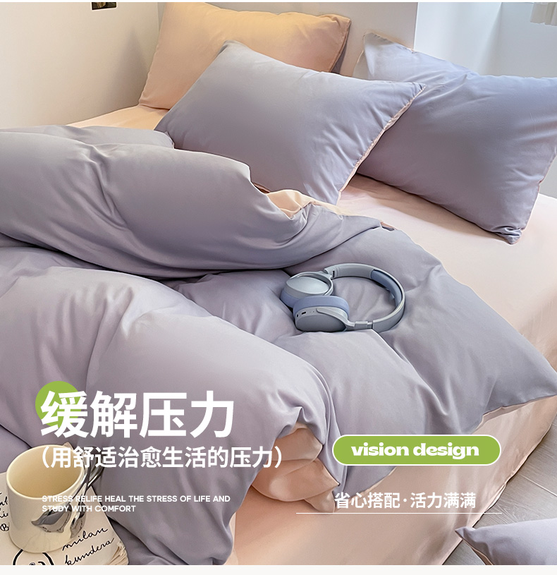 当前位置: 91家纺网 > 商品网购 > 床品套件 > 四件套 > 磨毛活性四件套 > 米粒 2024新款纯色简约双拼磨毛四件套 紫+粉雨
