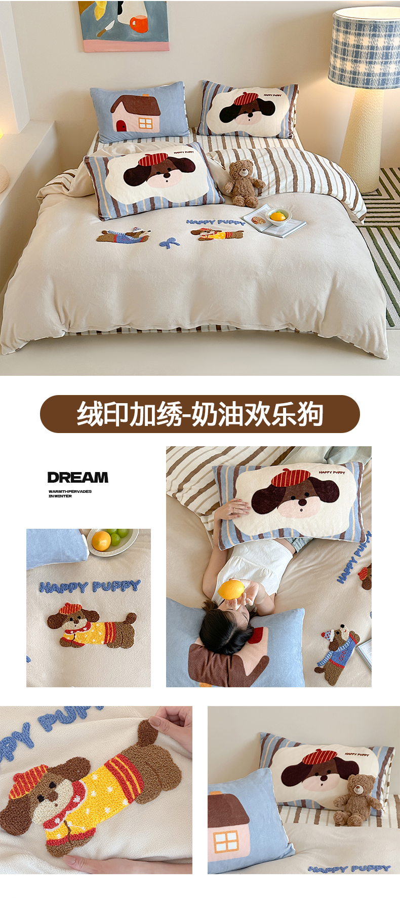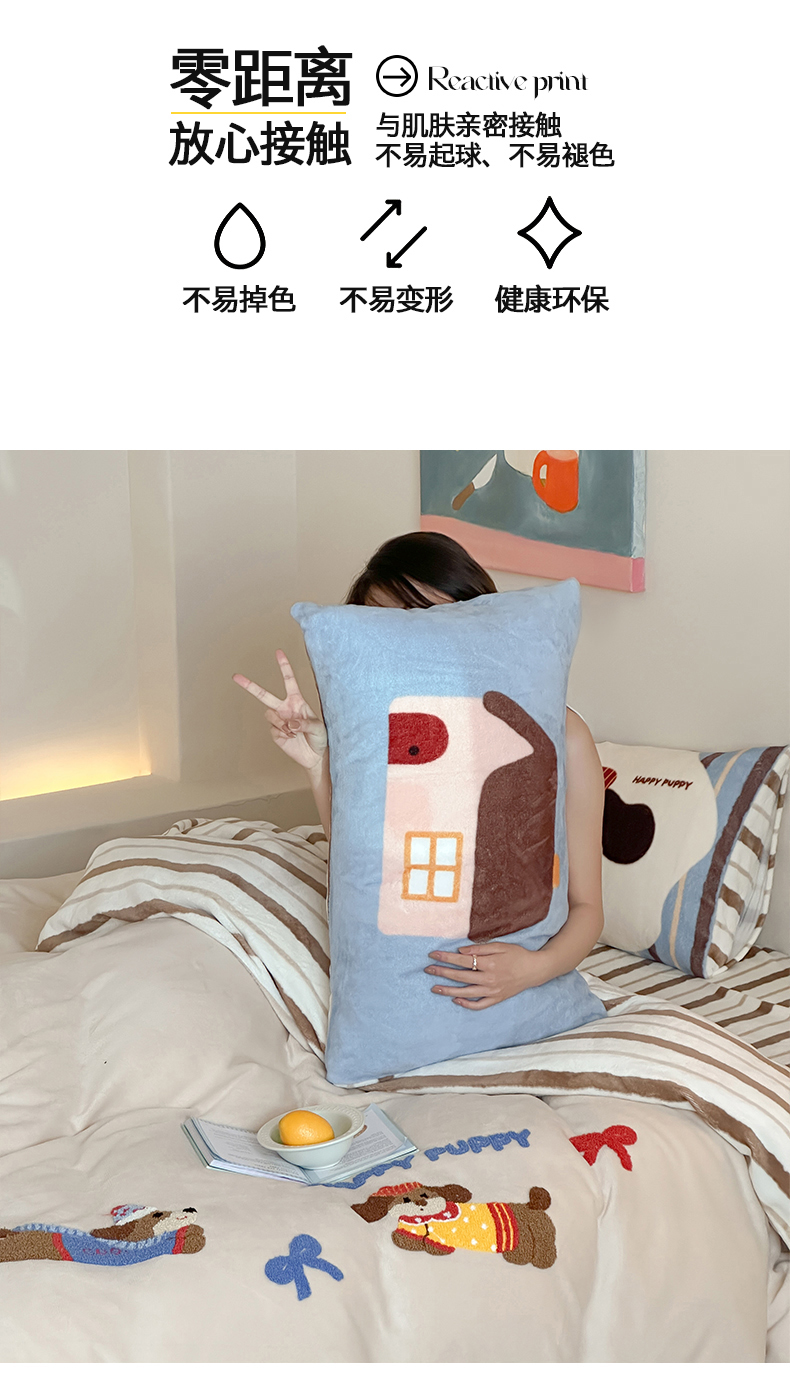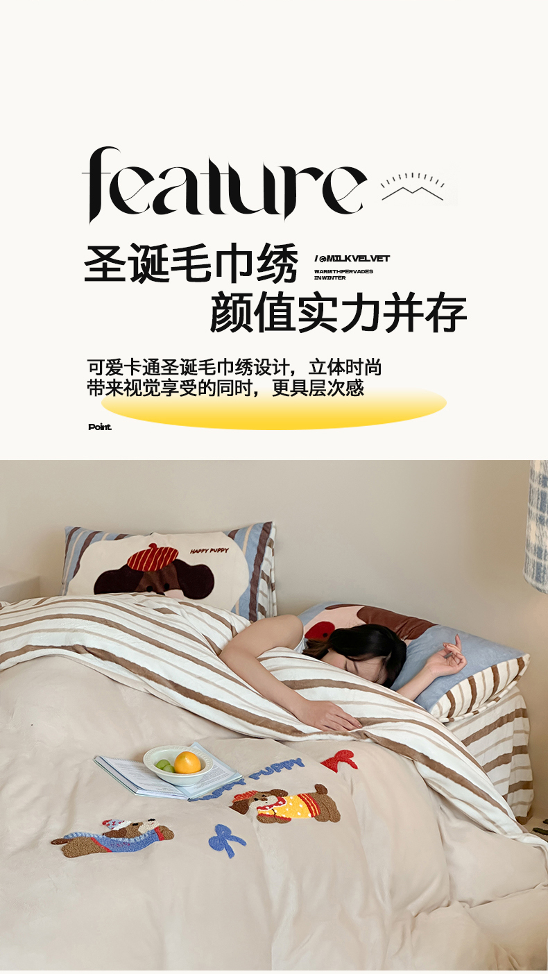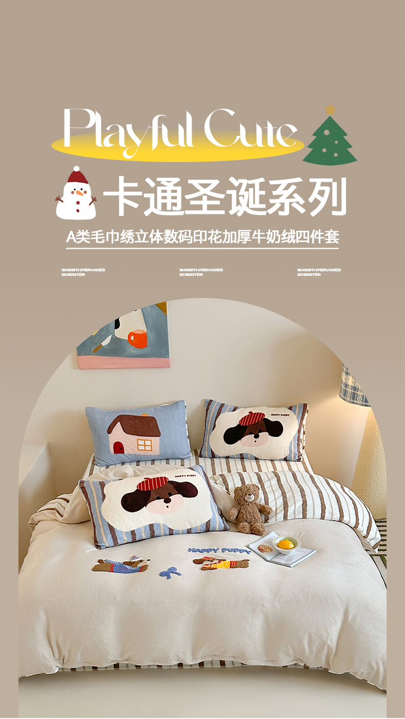 当前位置: 91家纺网 > 商品网购 > 床品套件 > 四件套 > 牛奶绒四件套 > 桃子家居 2024新款A类毛巾绣立体数码印花可爱卡通圣诞印加绣加厚牛奶绒系列四件套 绒印加绣-奶油欢乐狗