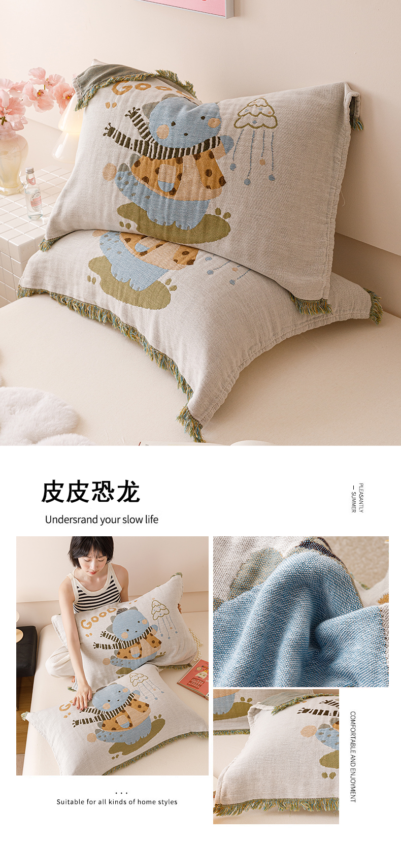 • 91家纺网 家纺一手货源 找家纺 麻依 2024新款全棉流苏款四层纱布枕巾52*75cm 皮皮恐龙