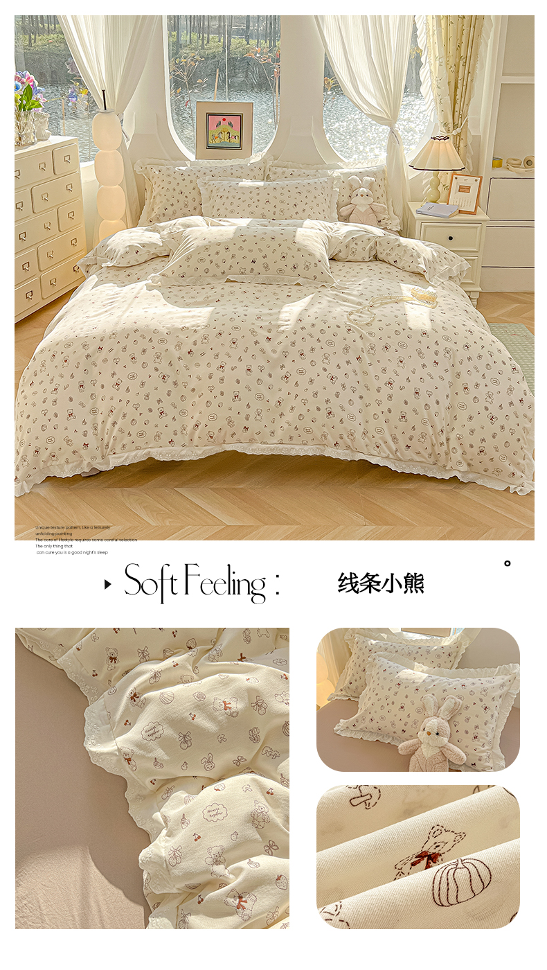 当前位置: 91家纺网 > 商品网购 > 床品套件 > 四件套 > 双层纱四件套 > 多乐家纺 2025新款A类有氧针织双层纱水洗棉四件套(提供买家秀) 线条小熊