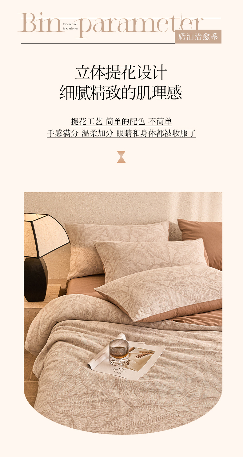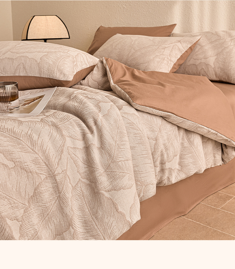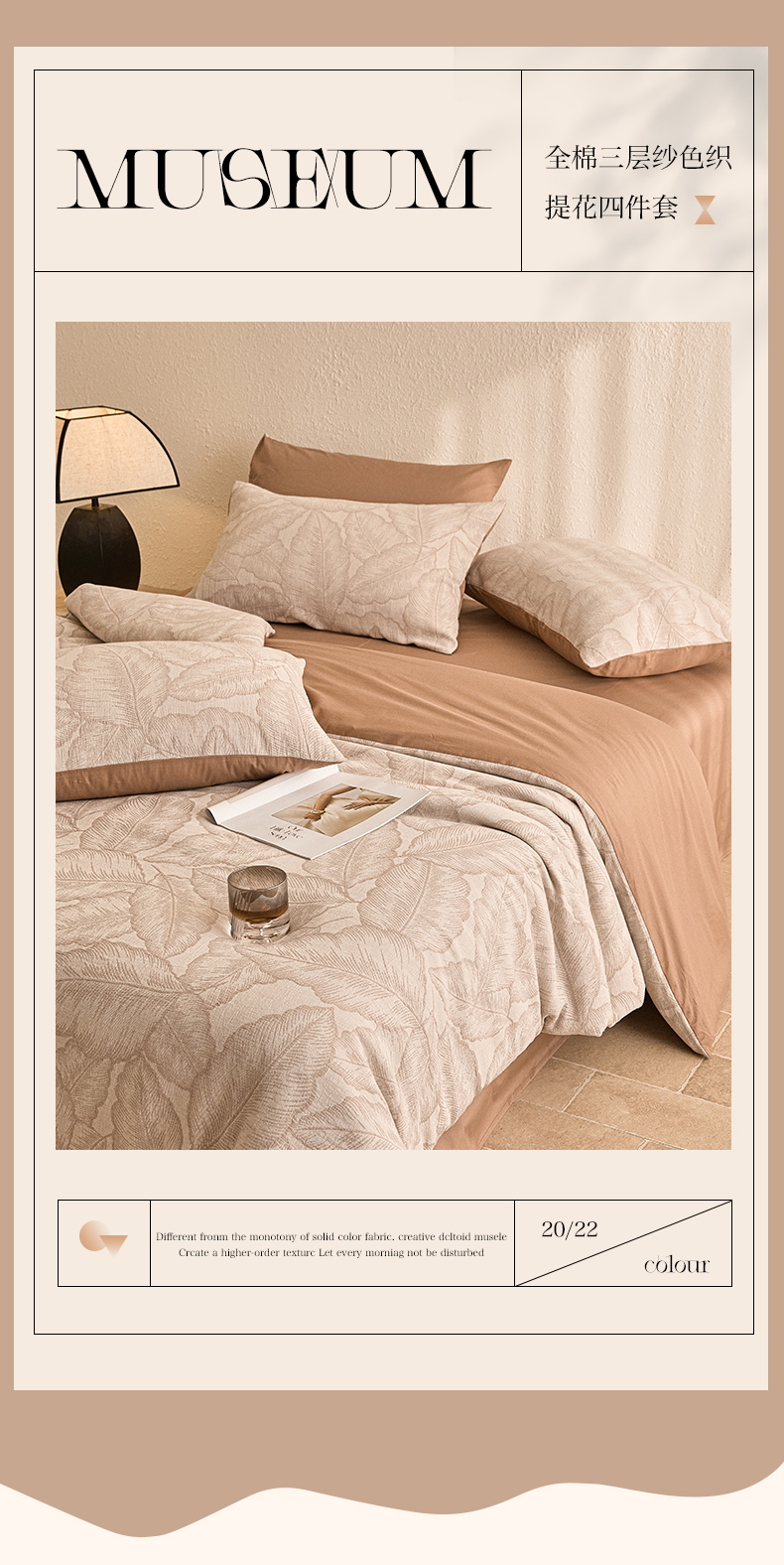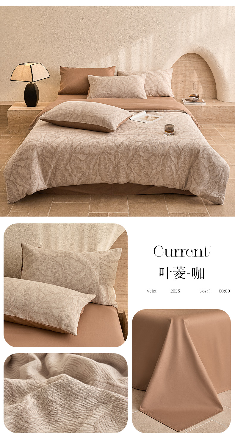 当前位置: 91家纺网 > 商品网购 > 床品套件 > 四件套 > 全棉普通四件套 > 2025新款全棉三层纱色织大提花四件套系列 叶菱-咖
