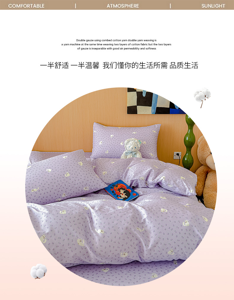 (总)感遇家纺 2025新款全棉纯棉千柔双层纱四件套,豹纹猫,豹纹猫粉,彩虹点点,风铃草,格子爱心咖,韩系蓝条,欢乐狗,蓝色小鱼,露娜,牛奶猫,青花瓷,轻奢小熊,盛夏,甜系少女,兔稚,紫樱猫语