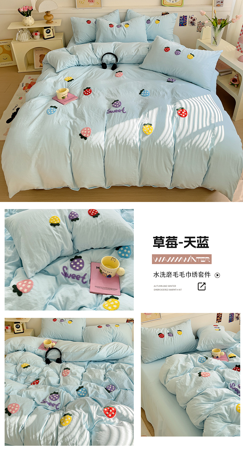 当前位置: 91家纺网 > 商品网购 > 床品套件 > 四件套 > 水洗棉四件套 > 逸尚阁 2025新款小清新毛巾绣四件套(提供买家秀) 草莓-天蓝