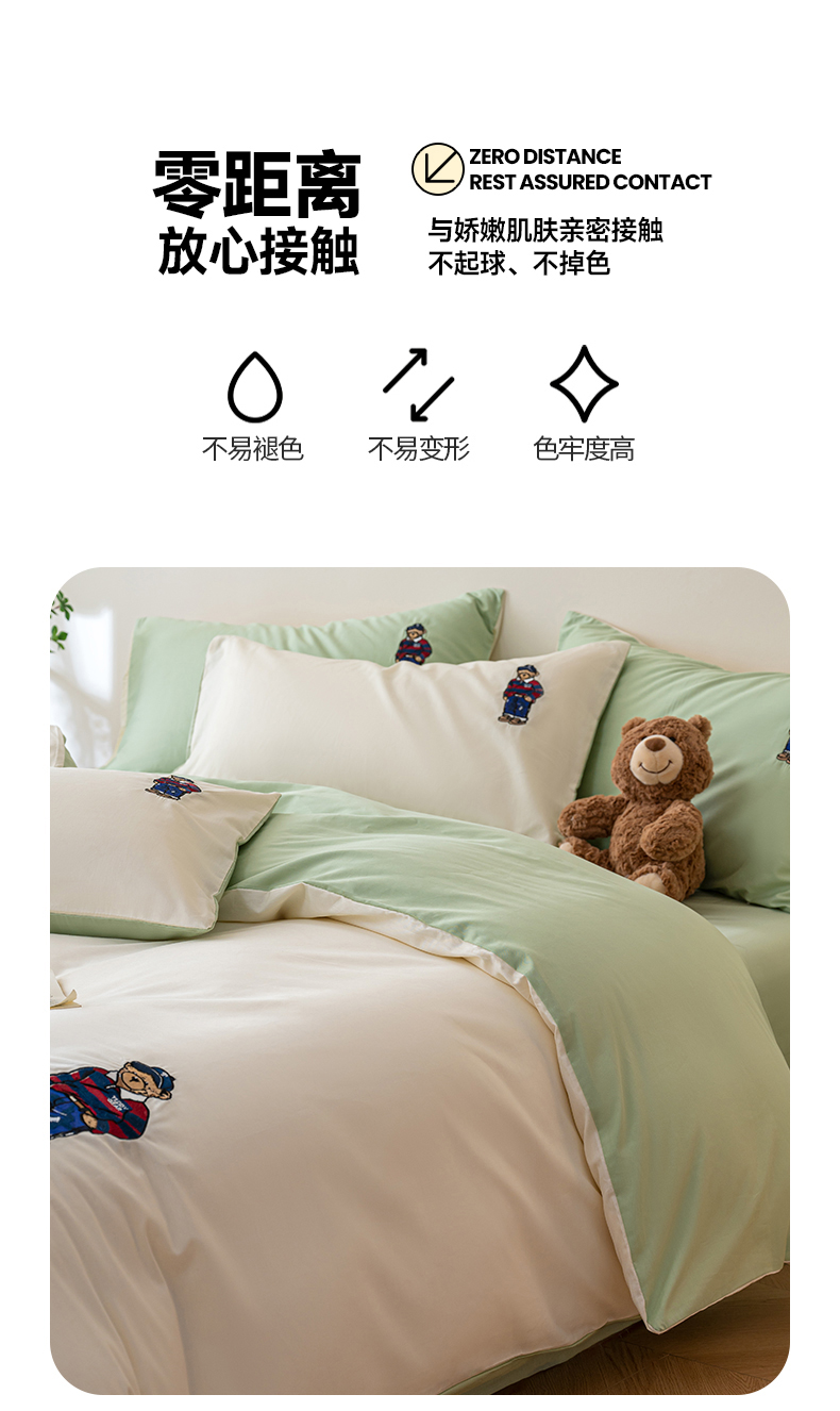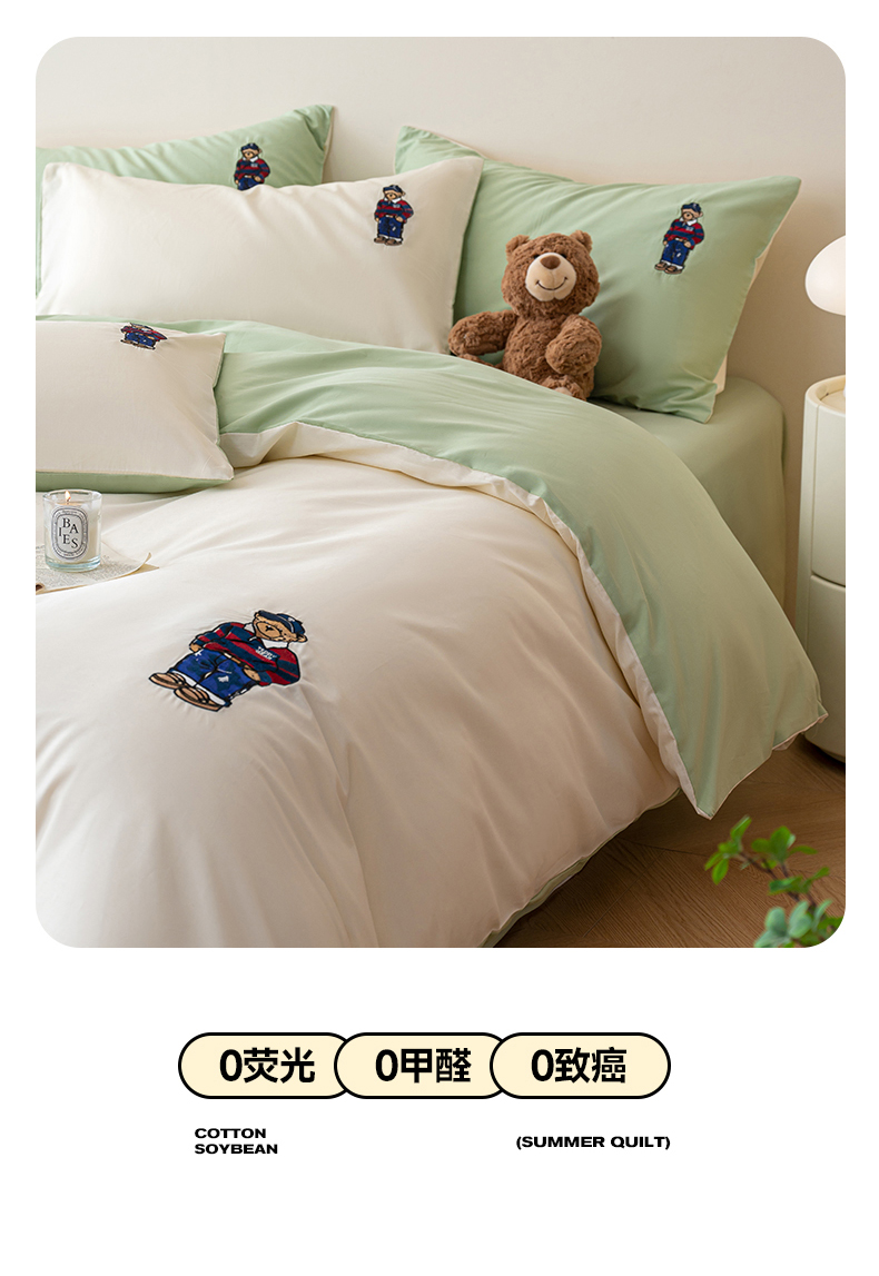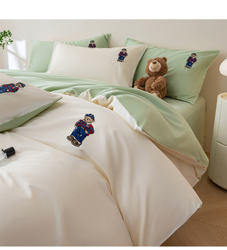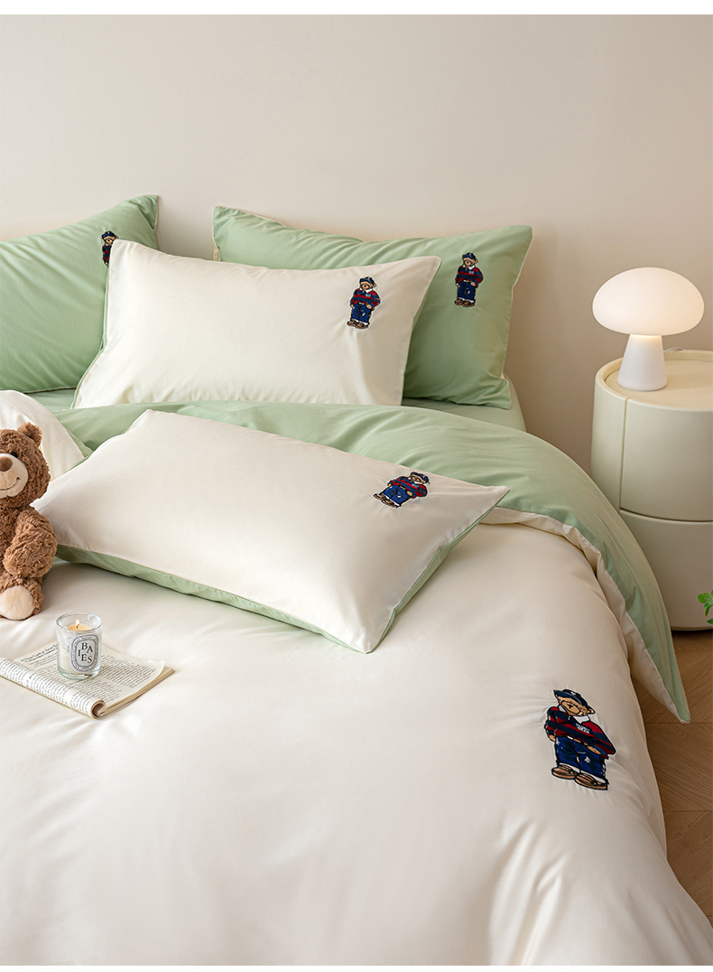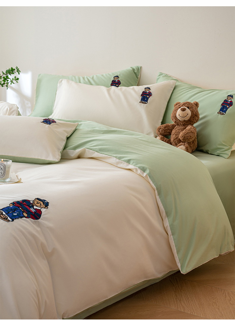 澳梵家居2025新款A类裸睡级全棉刺绣四件套-英伦小熊 英伦熊-白绿
