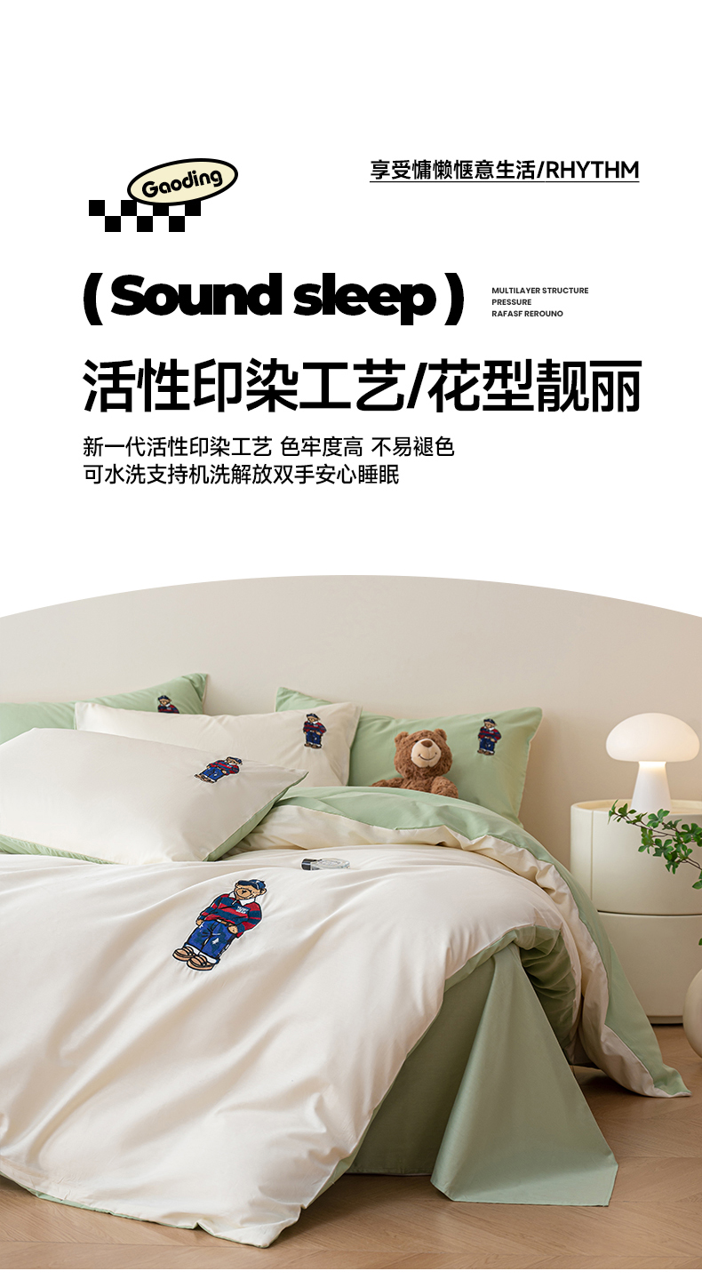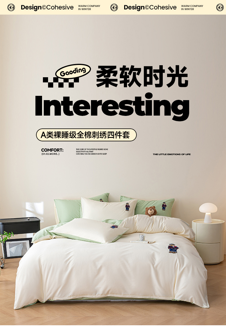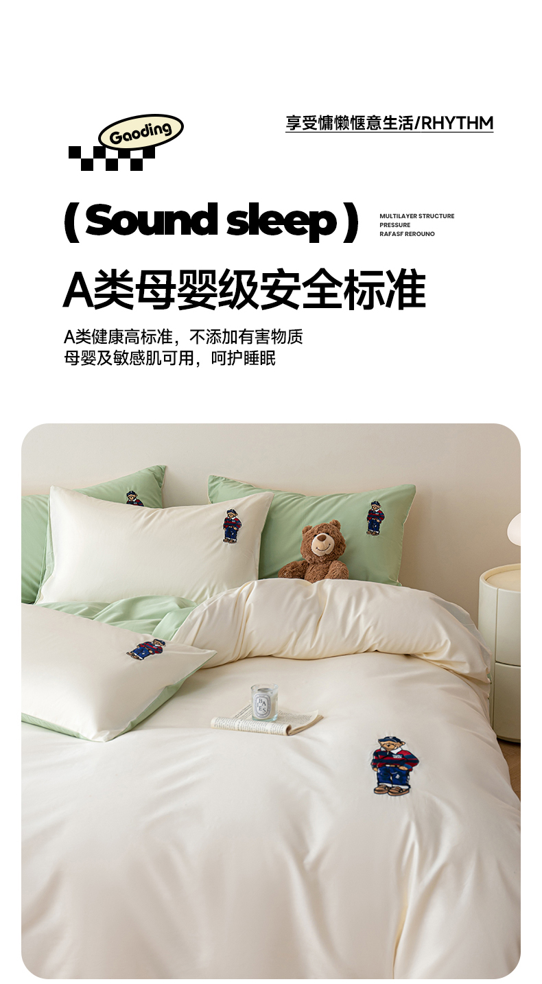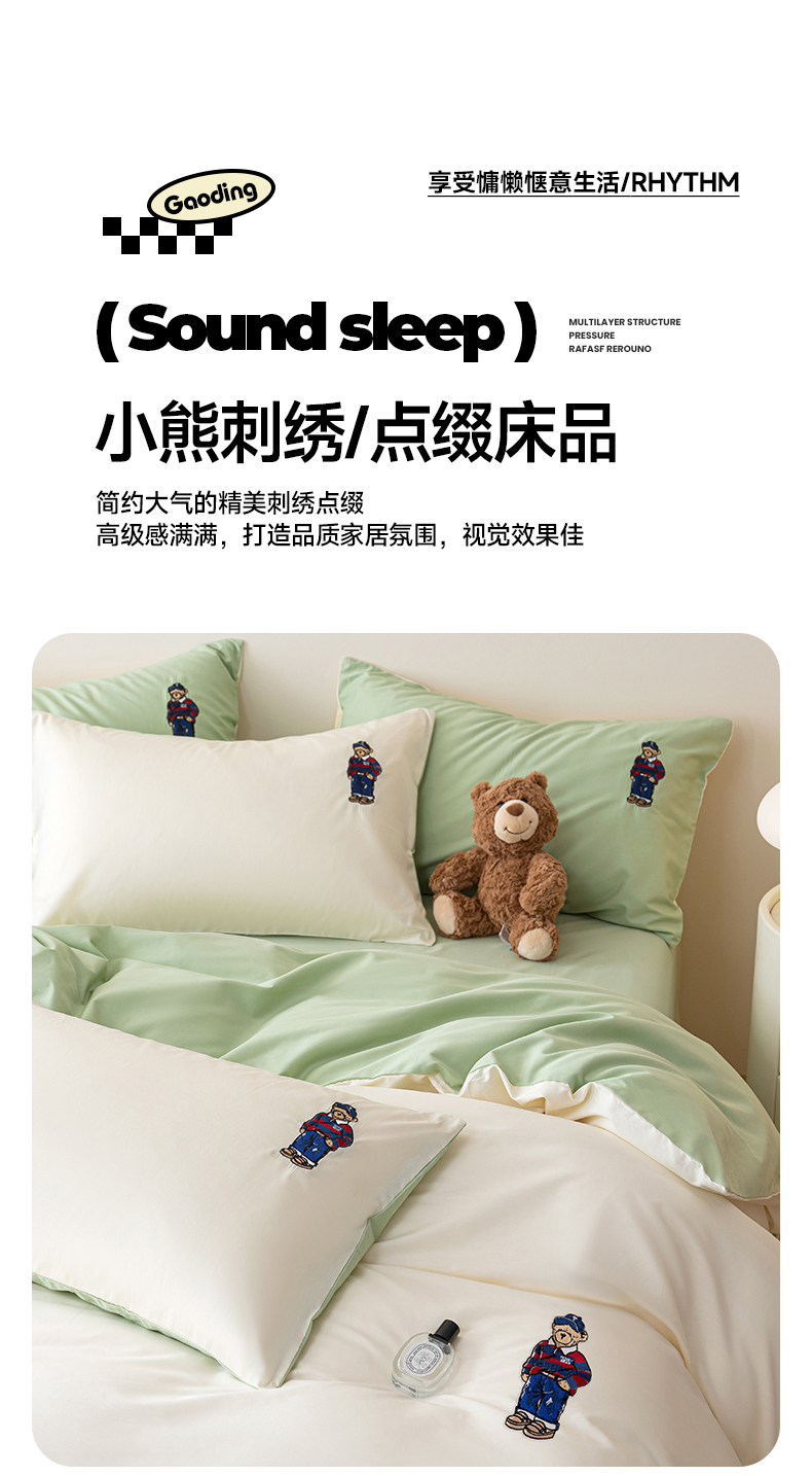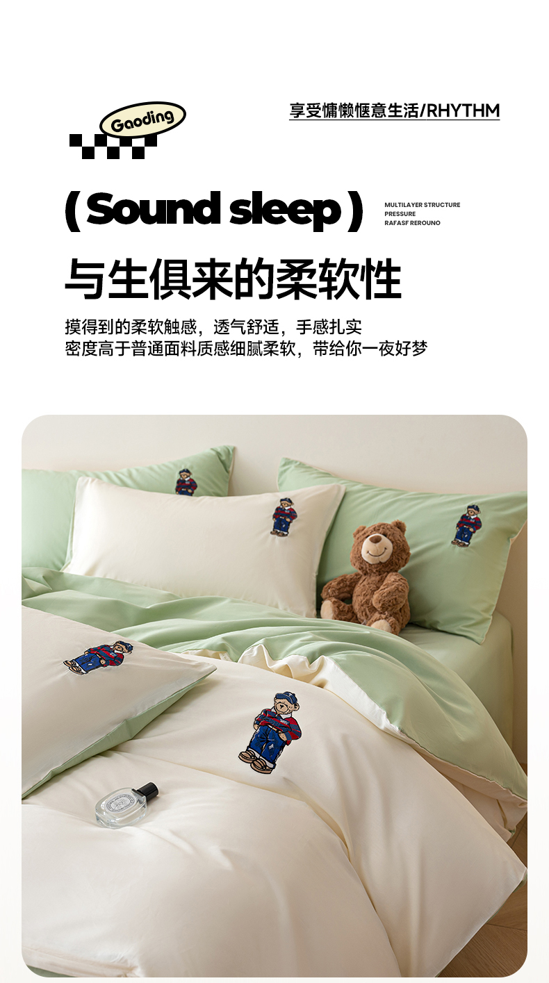 澳梵家居2025新款A类裸睡级全棉刺绣四件套-英伦小熊 英伦熊-白绿
