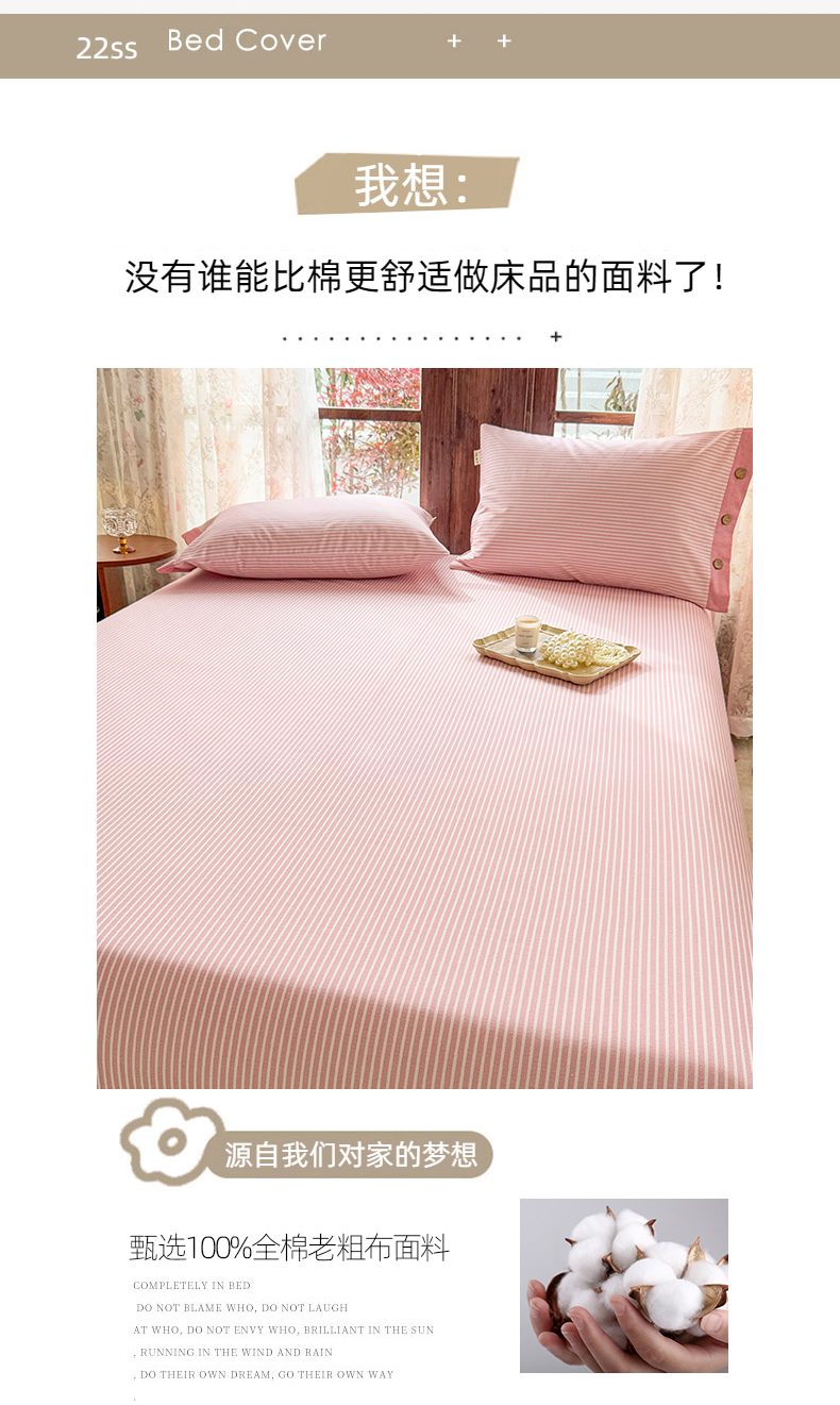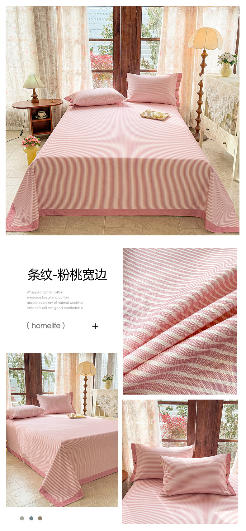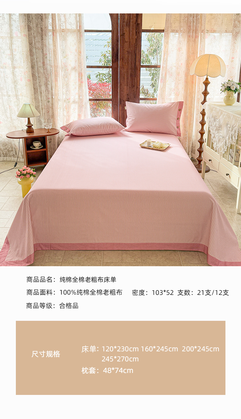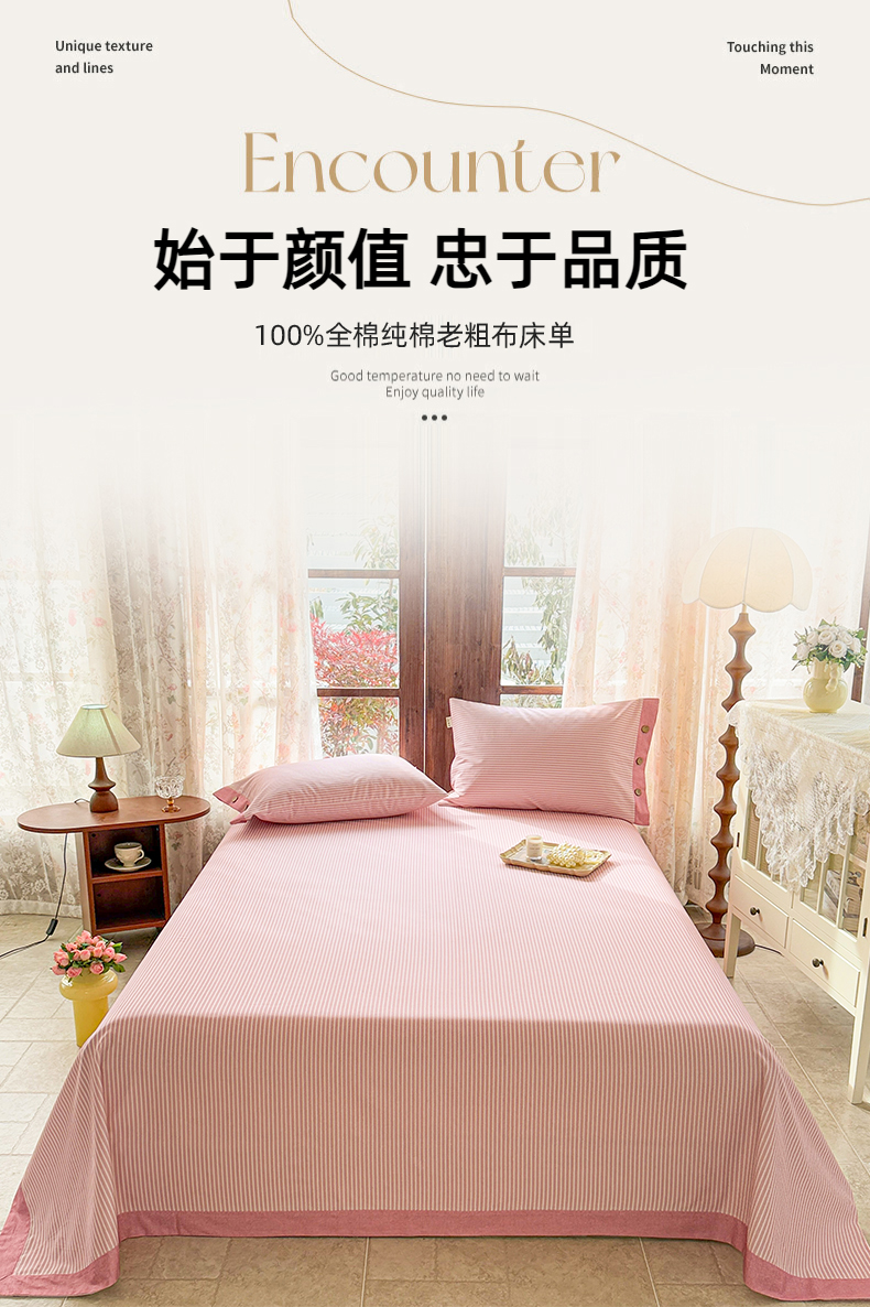 • 91家纺网 家纺一手货源 找家纺 简宜家居 2025新款宽边纯棉全棉老粗布床单 条纹-粉桃宽边
