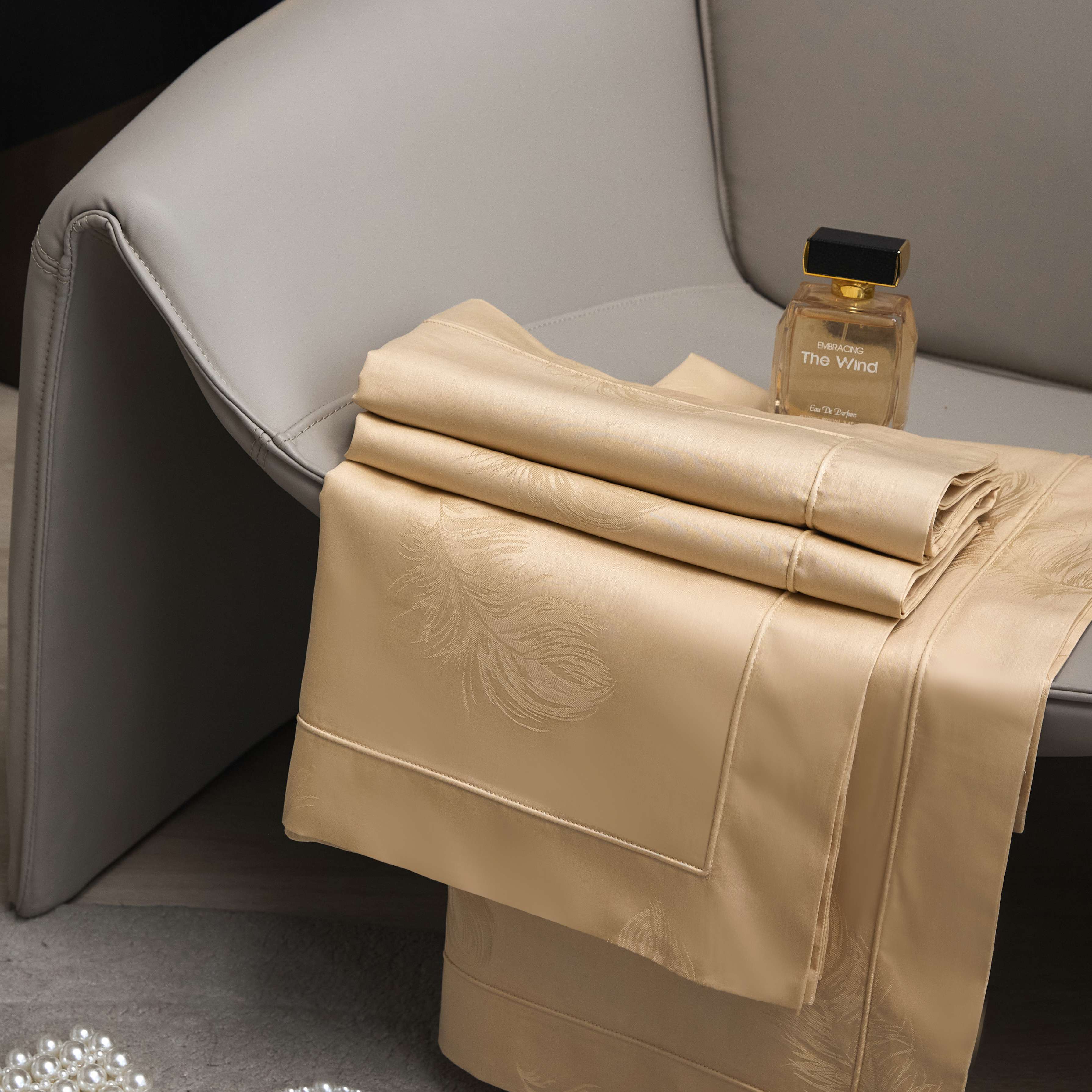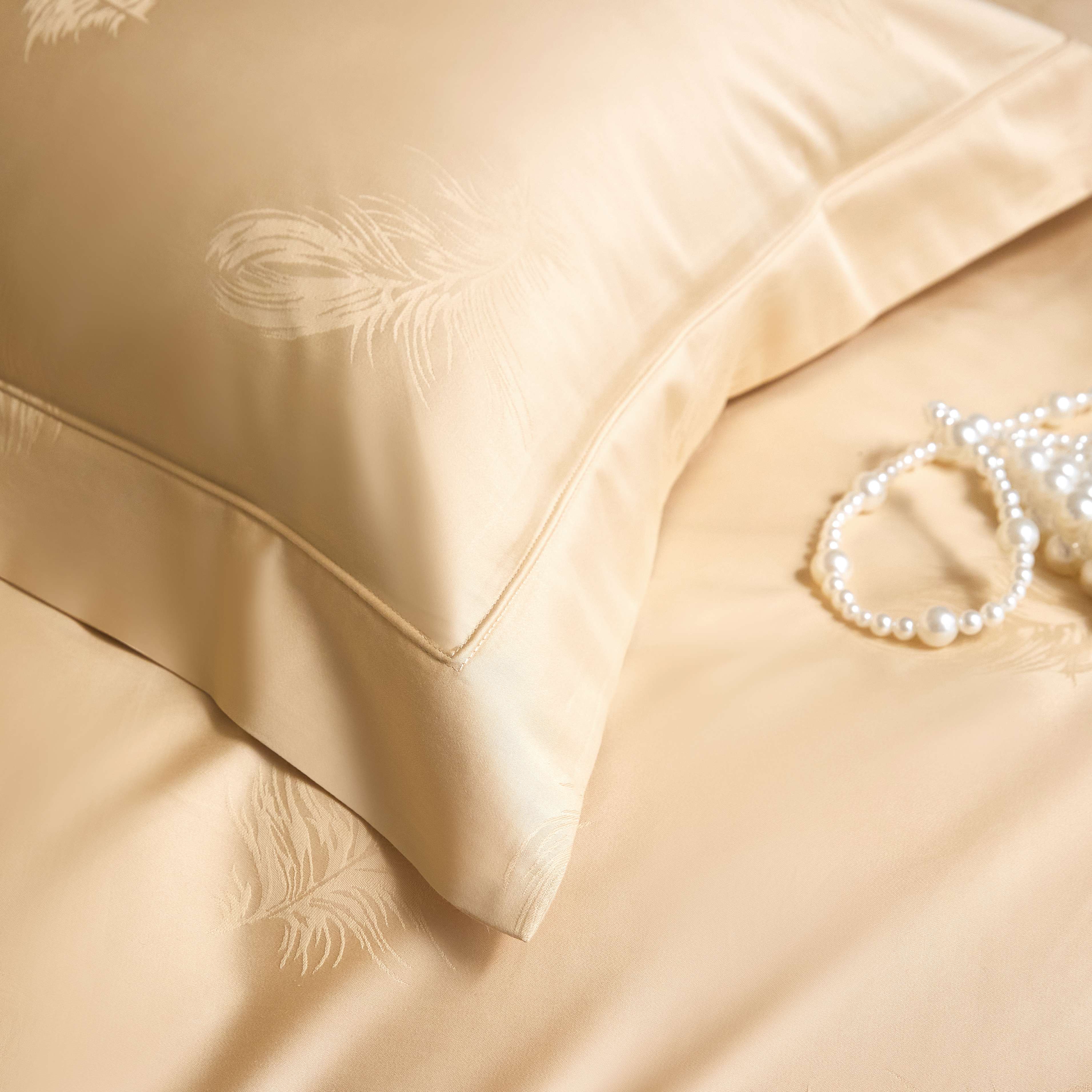 商品名称:榻尚家居 2025春夏新款长绒棉全棉纯棉贡缎提花手工立体埋绳工艺四件套 飘羽(香槟金)
