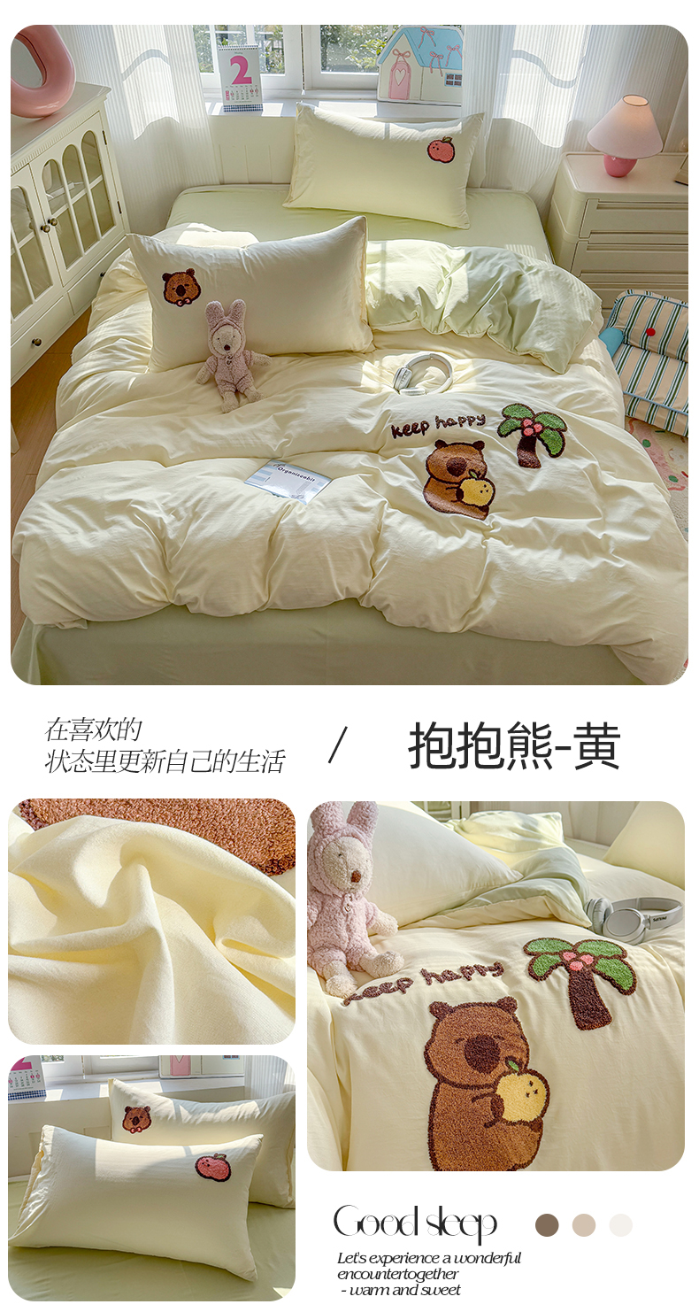商品名称:温眠家纺 2025新款水洗棉毛巾绣四件套-叠拍 抱抱熊-黄