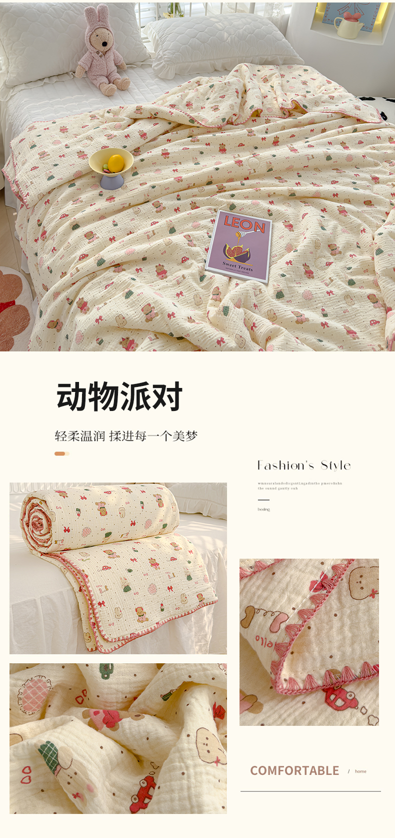 商品名称:芯恋 2025新款母婴级全棉皱皱纱儿童被双层纱夏被 动物派对