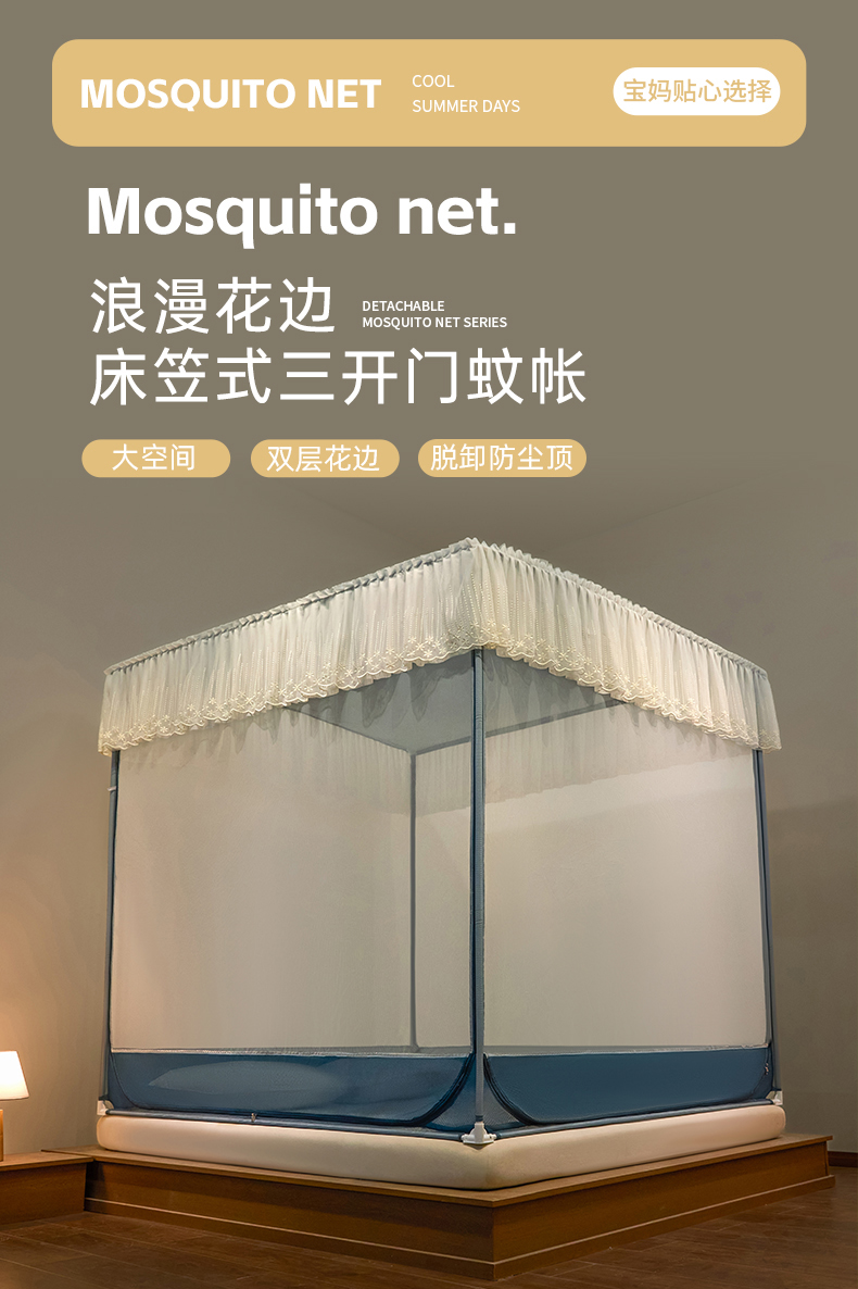 商品名称:(总)飞轮海蚊帐 2025新款浪漫花边床笠款三开门方顶蚊帐-Z98