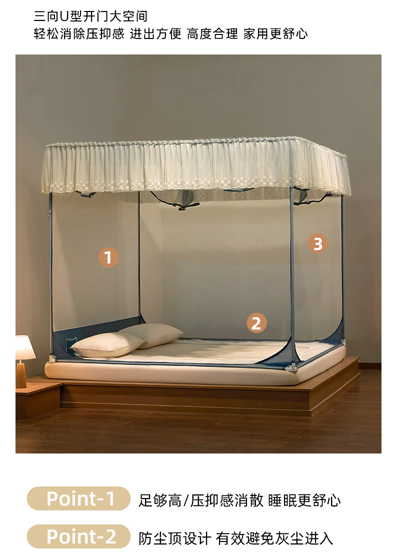 (总)飞轮海蚊帐 2023新款U型三开门遮光坐床蚊帐-Z-75,黛蓝,奶油黄,香槟
