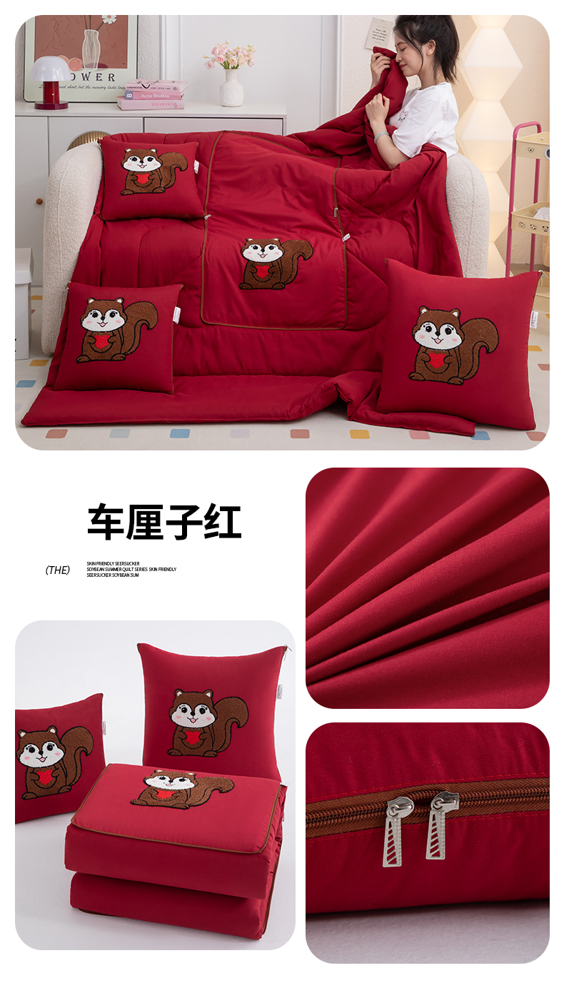 宝马家纺(原梦童画)2025新款四季款磨毛毛巾绣小松鼠抱枕被 车厘子红