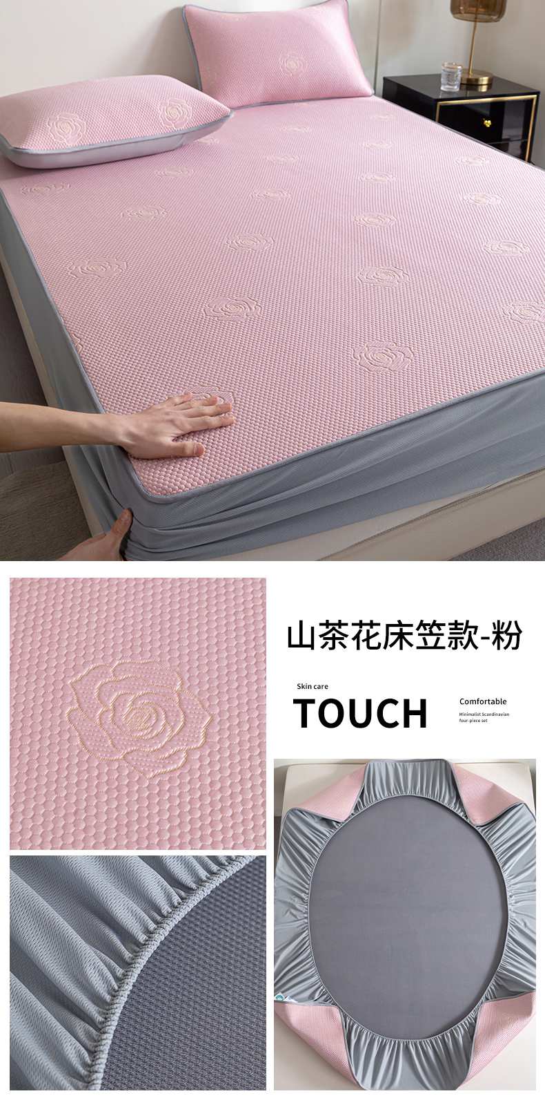 商品名称:2025新款山茶花系列冰豆豆凉席 山茶花床笠款-粉