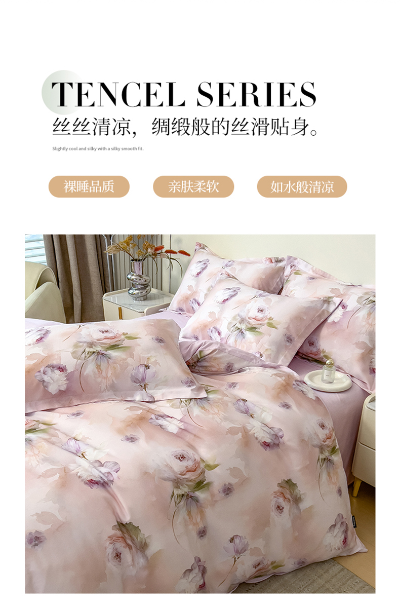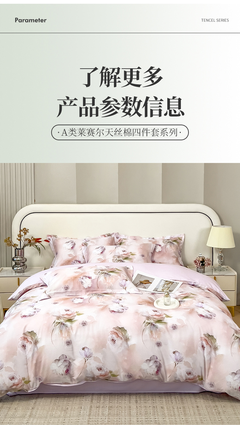 (总)芃成家纺 2025新款A类莱赛尔天丝棉四件套,梦幻花海,缤纷花语,国色天香,花开如画,花舞,奥斯汀玫瑰,春暖花开-粉,春暖花开-紫,春色写意-灰,春色写意-兰,冬雪寒香,繁花满庭,古典玫瑰,国色花韵-粉,国色花韵-玉,花涧入梦,秘境灰,莫奈花园,青花瓷,秋日私语,水墨花卉,晚秋,絮语,烟云牡丹