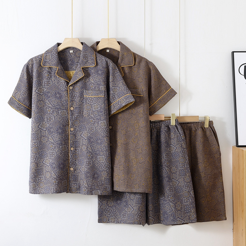 (总)洛兰沙家居馆【只代发】【只代发】2025新款男款休闲色织纯棉双层纱布睡衣夏季薄款长袖短袖宽松家居服外穿