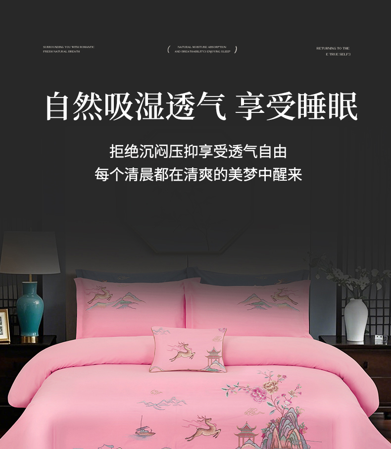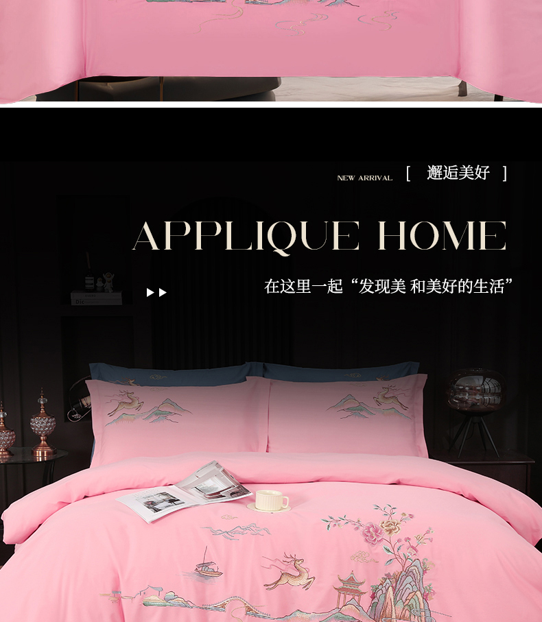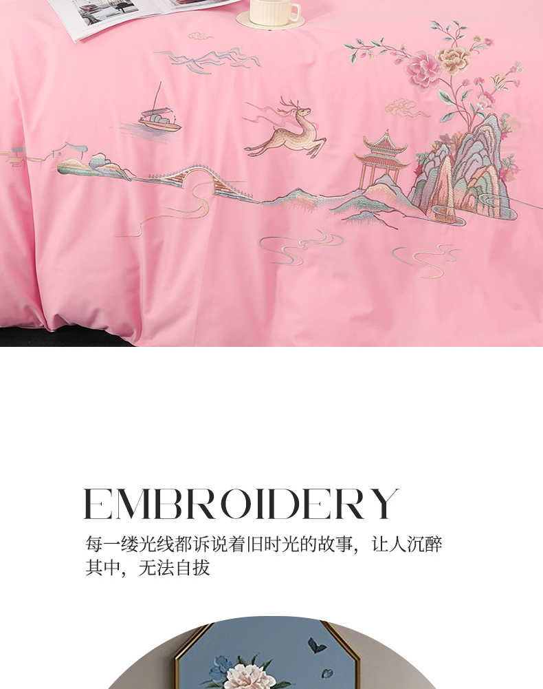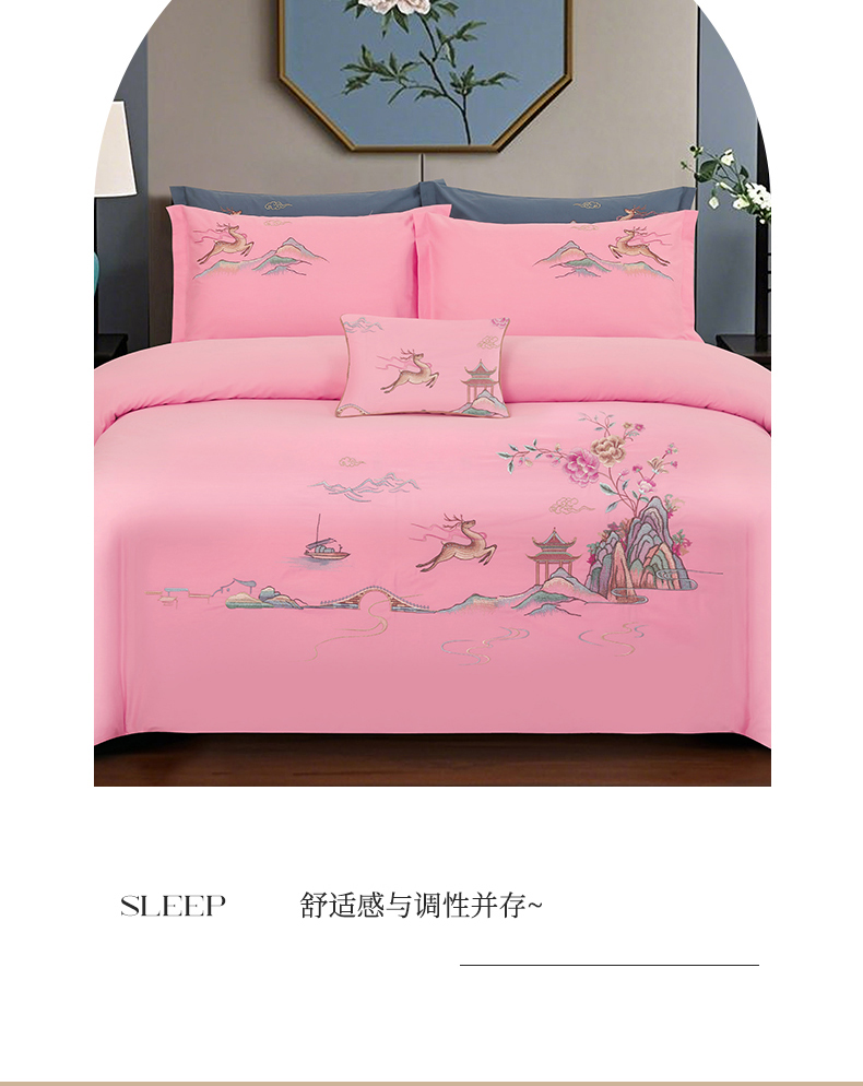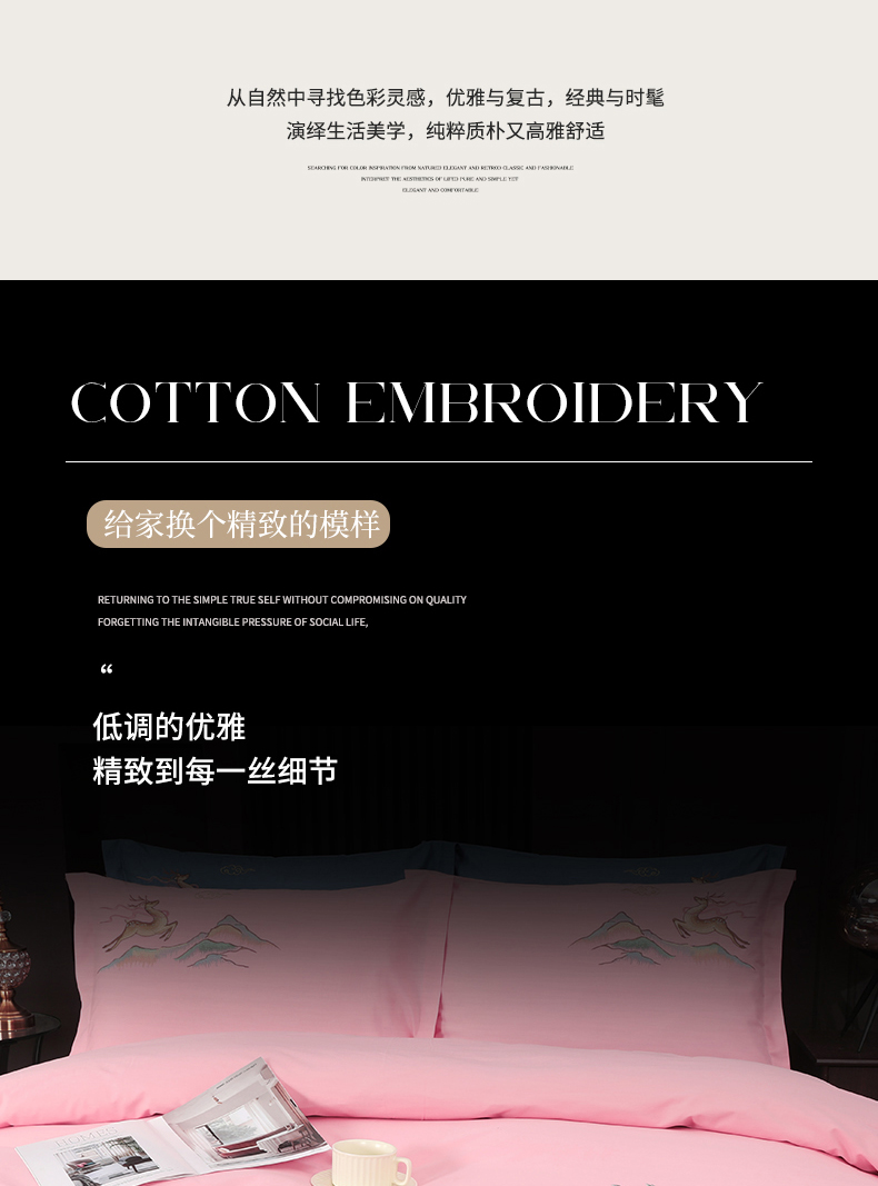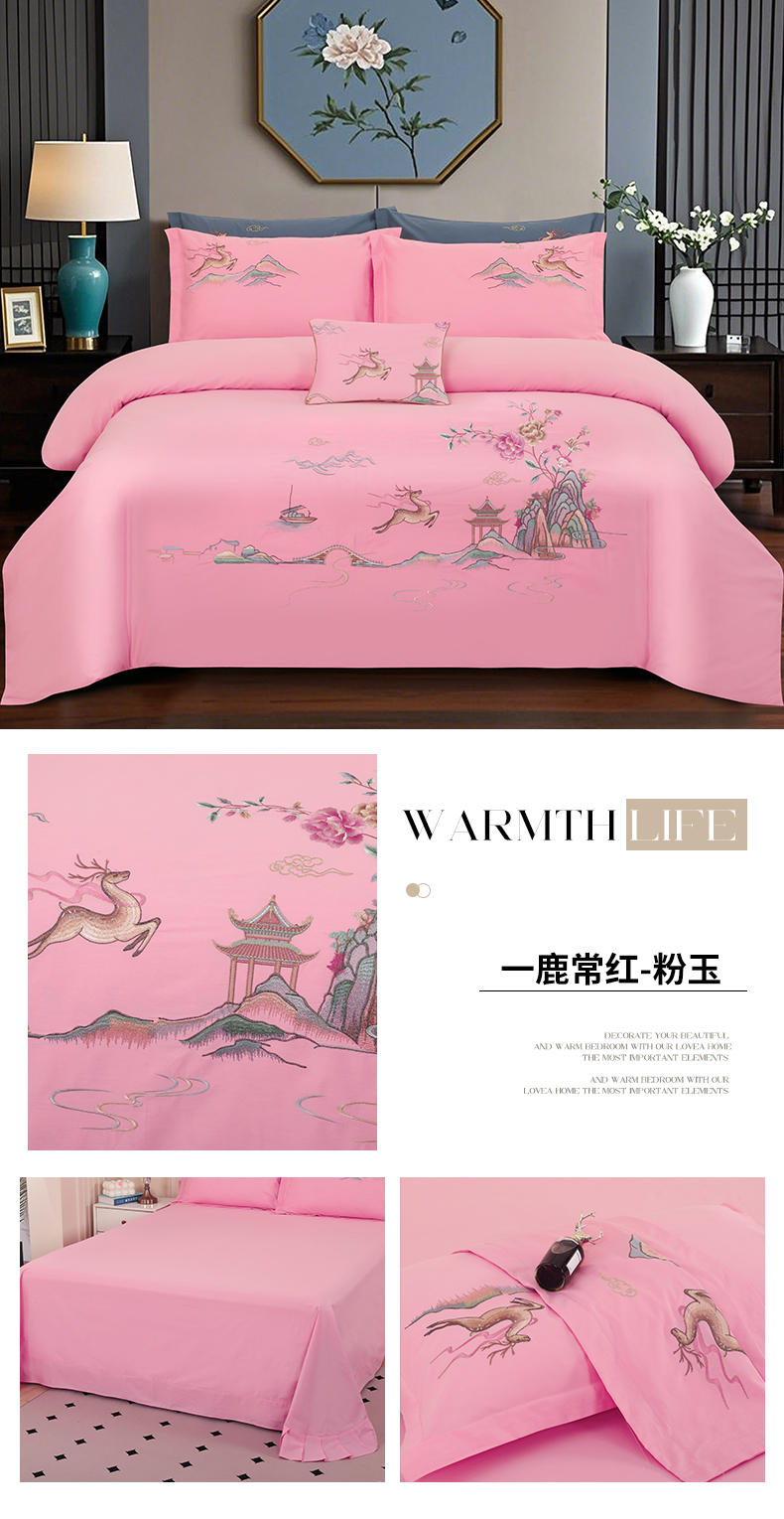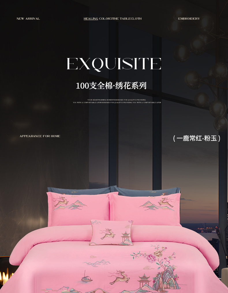 浩情国际婚庆供货中心 2026新款100支全棉高端刺绣四件套一鹿常红系列 一鹿常红-粉玉
