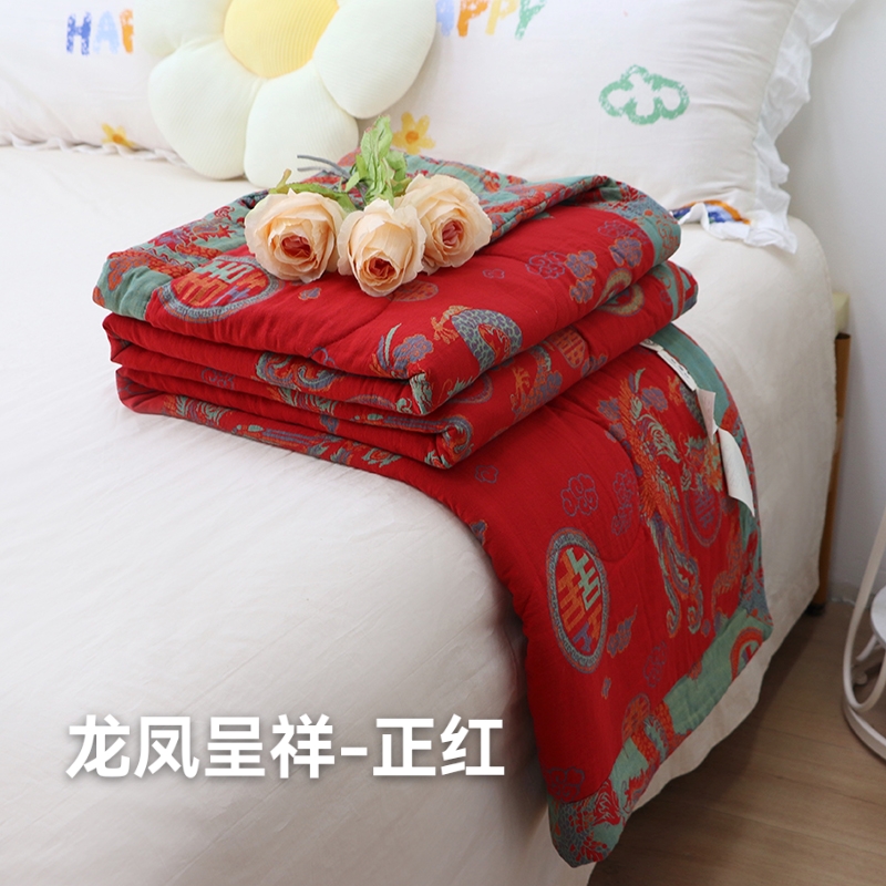 商品名称:鲁爱家纺供货 2025新款全棉双层纱提花夏被 龙凤呈祥-正红