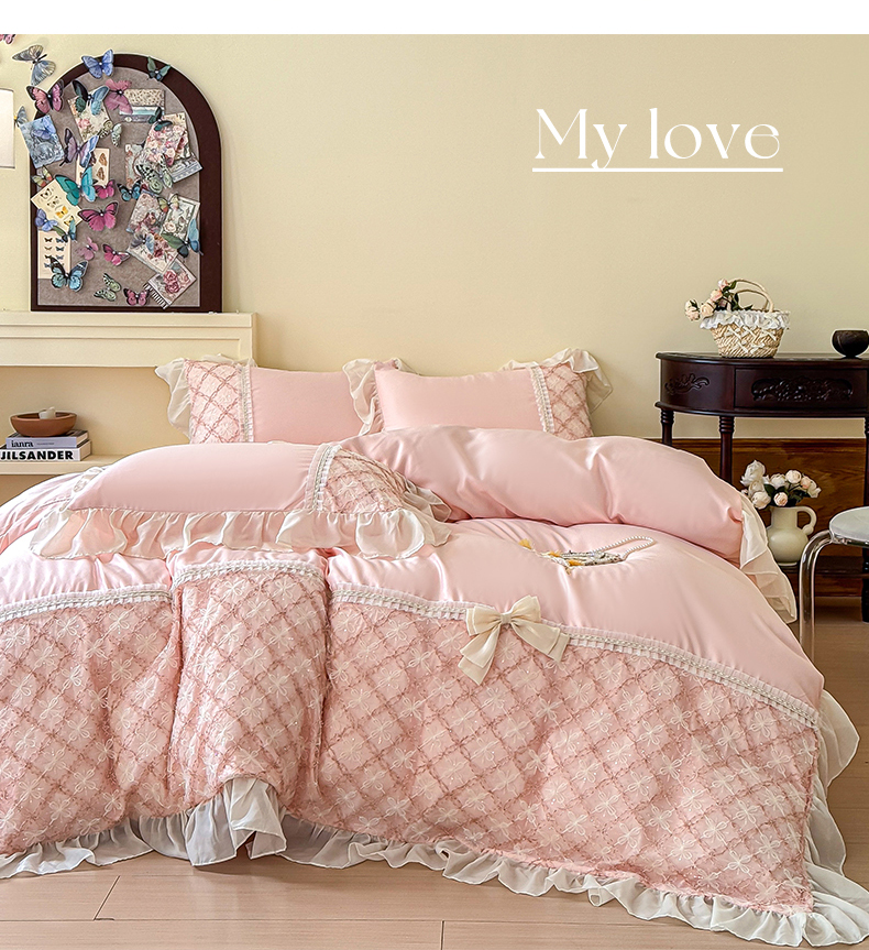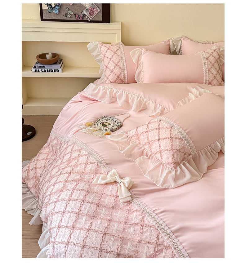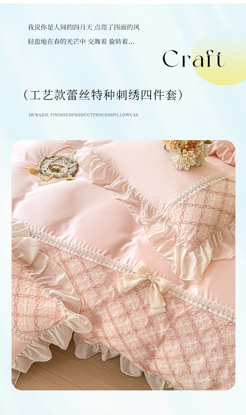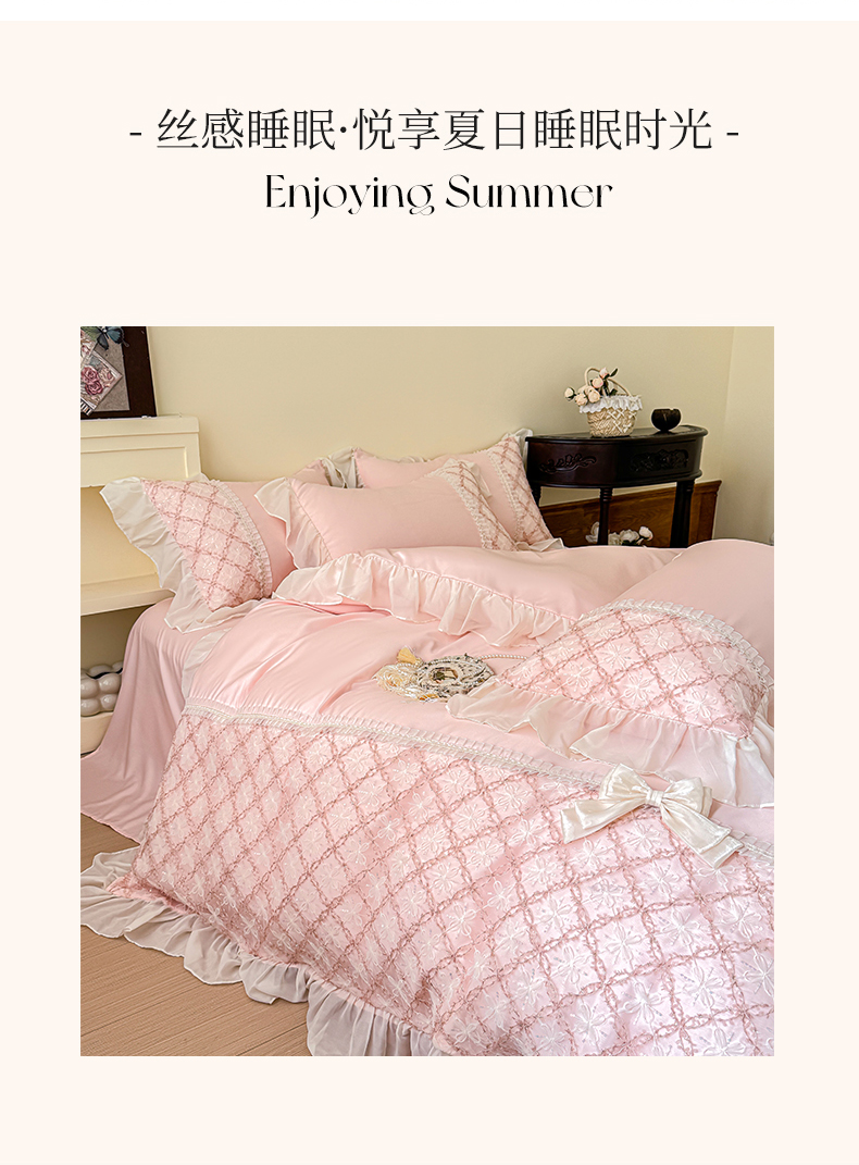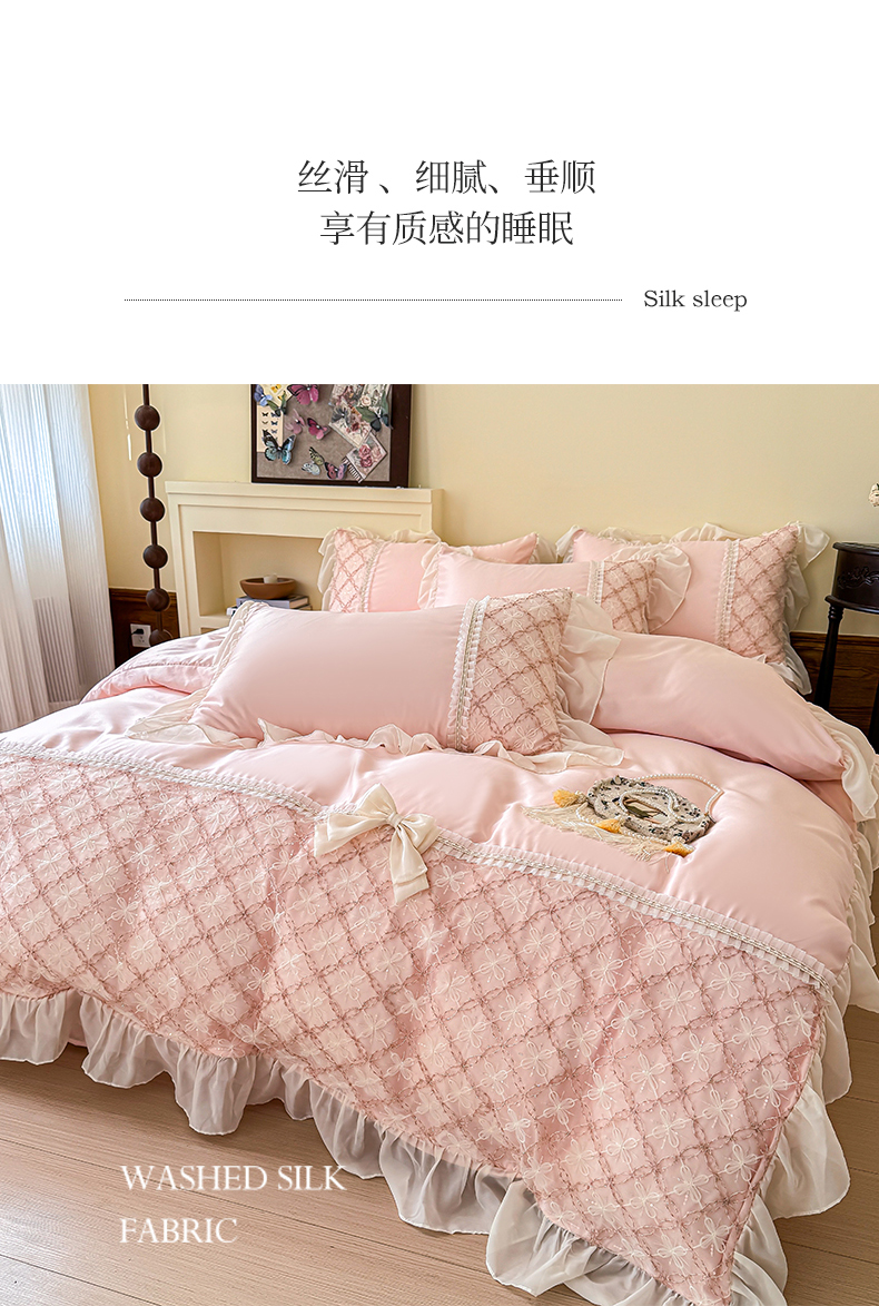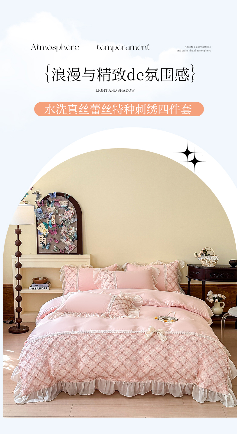 凯美家居 2025新款水洗真丝蕾丝刺绣四件套 爱丽莎 浅粉