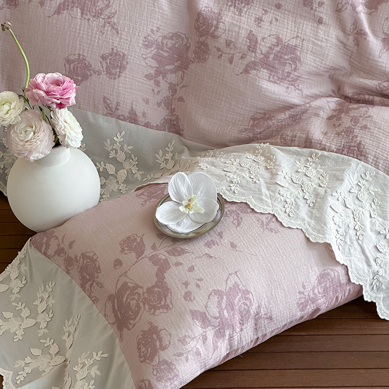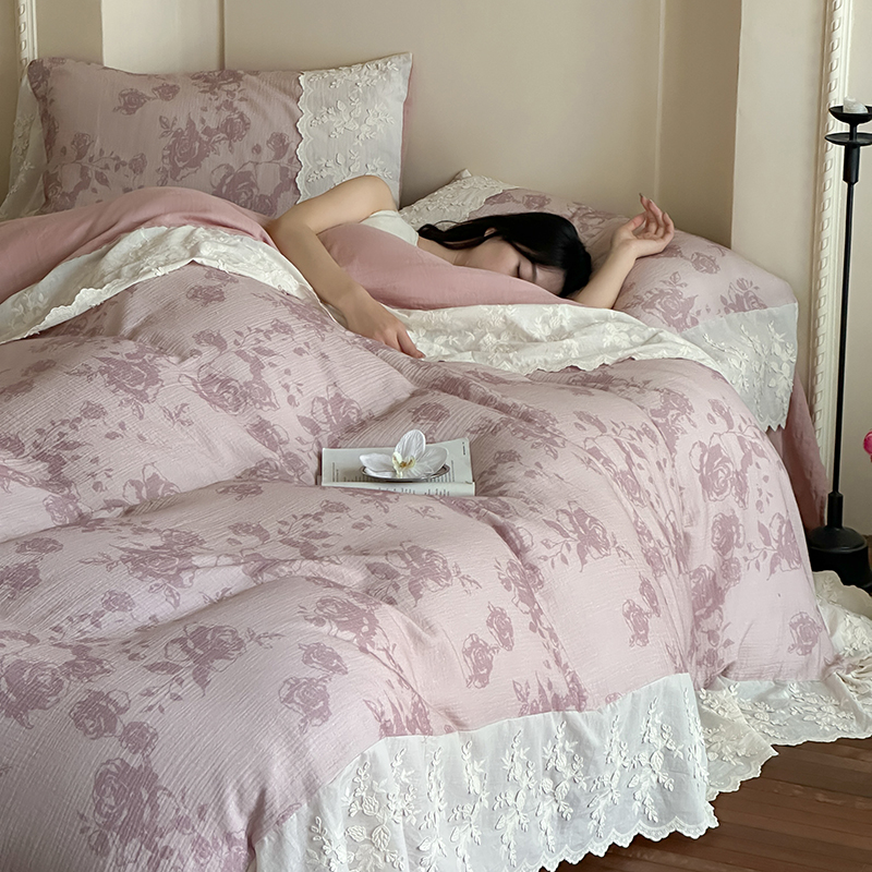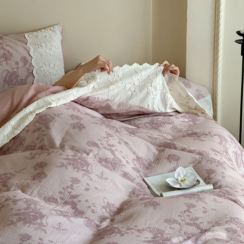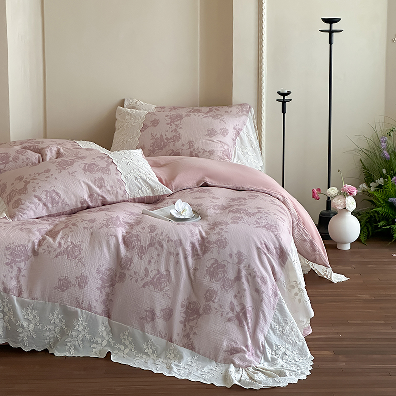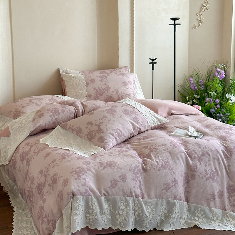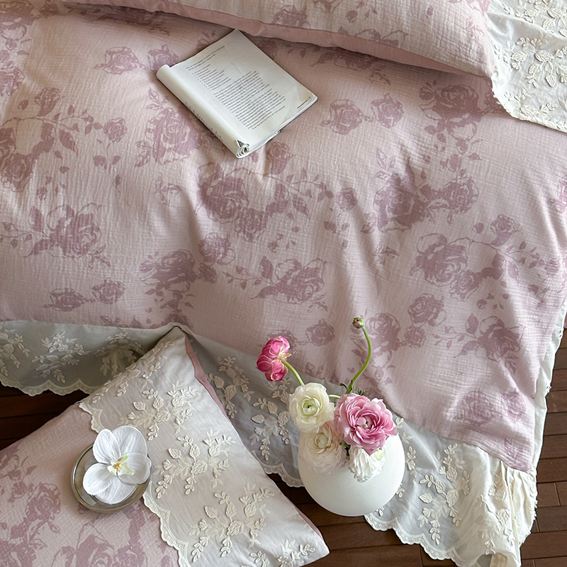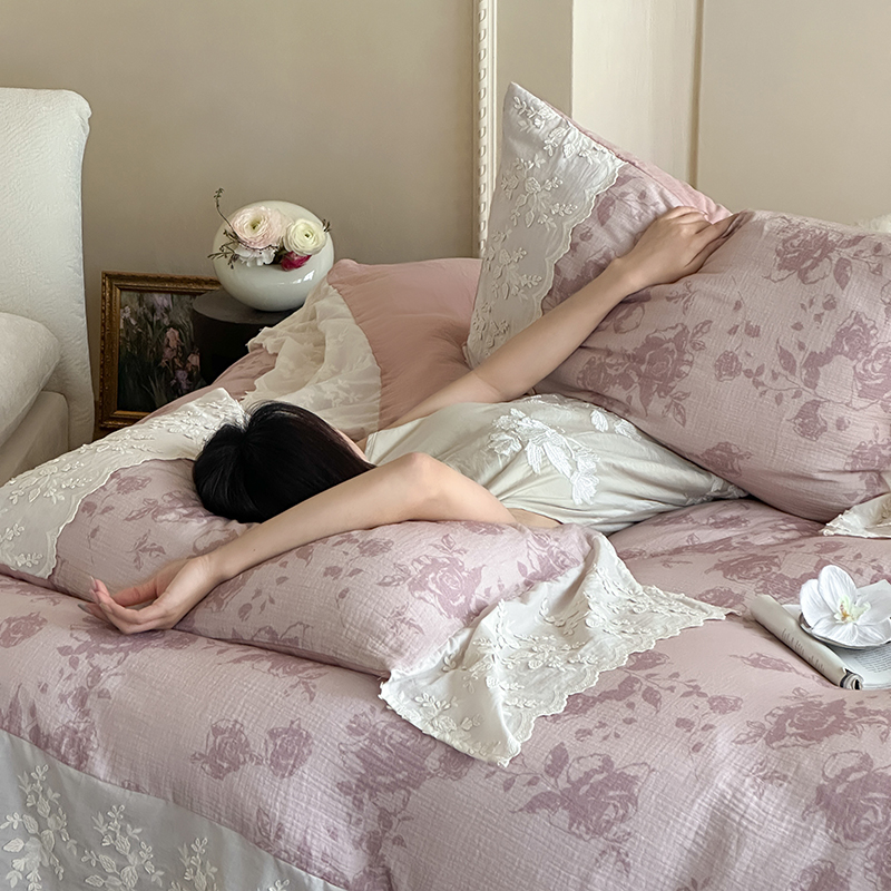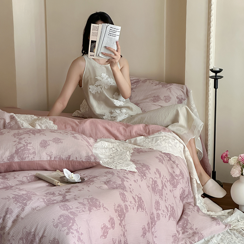 商品名称:(总)多乐娜 2025新款法式纯棉双层纱皱皱纱花边款新疆长绒棉双层纱绉纱四件套印花工艺款
