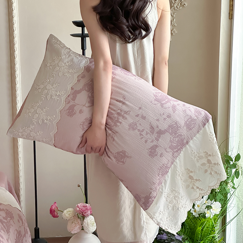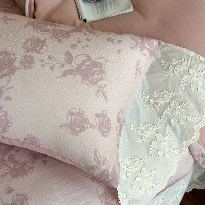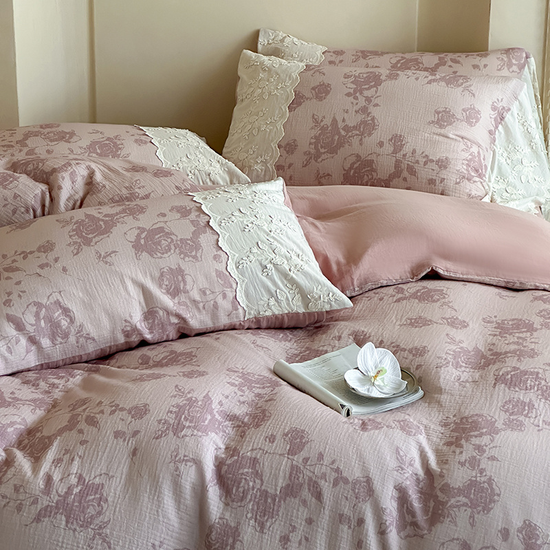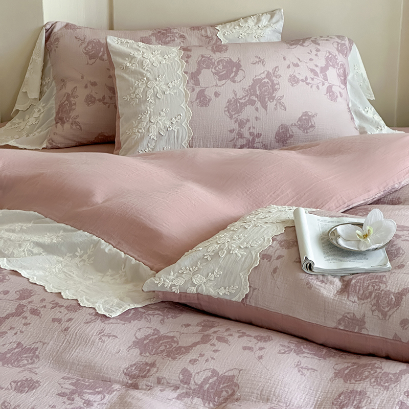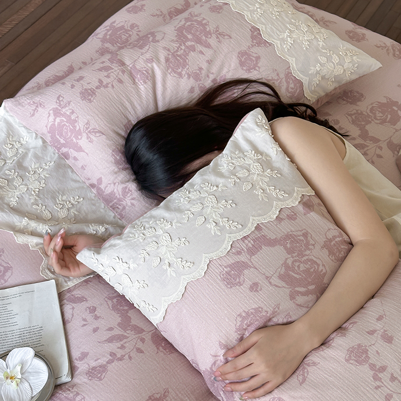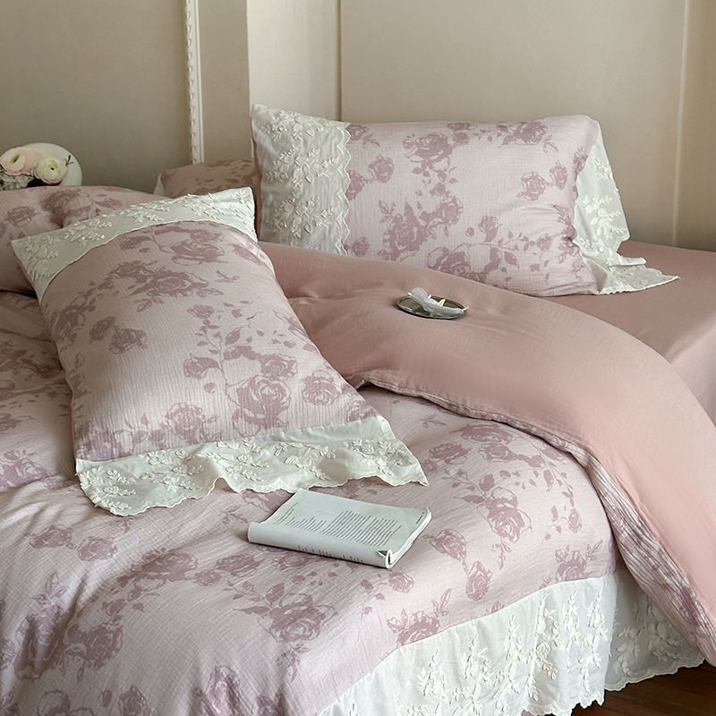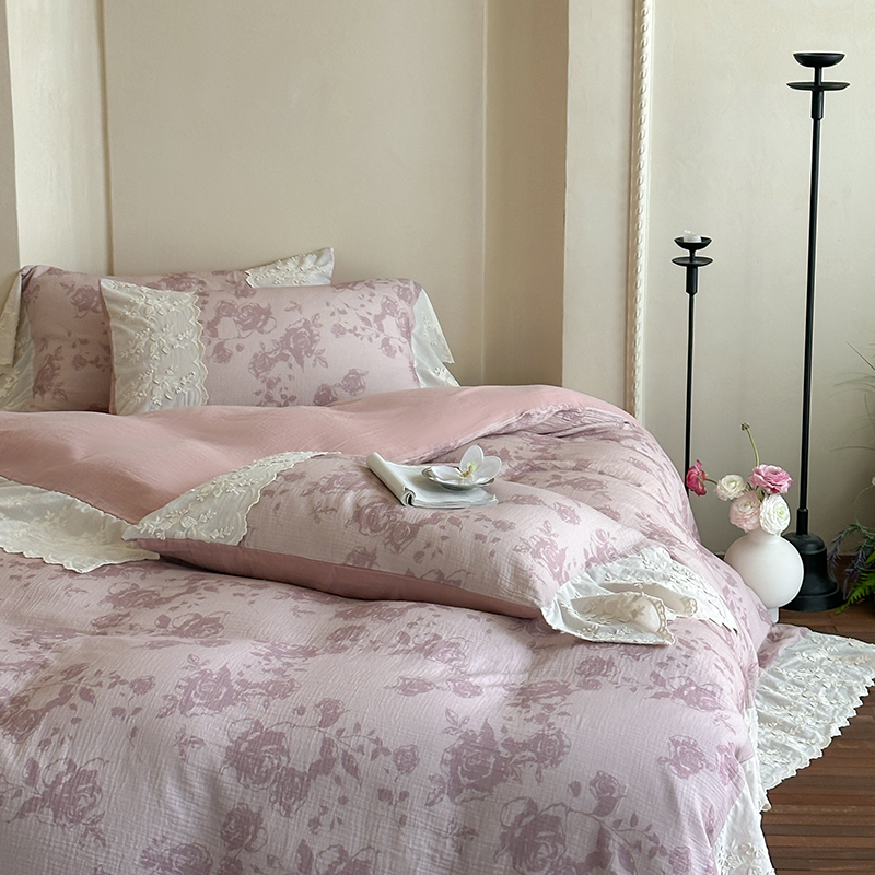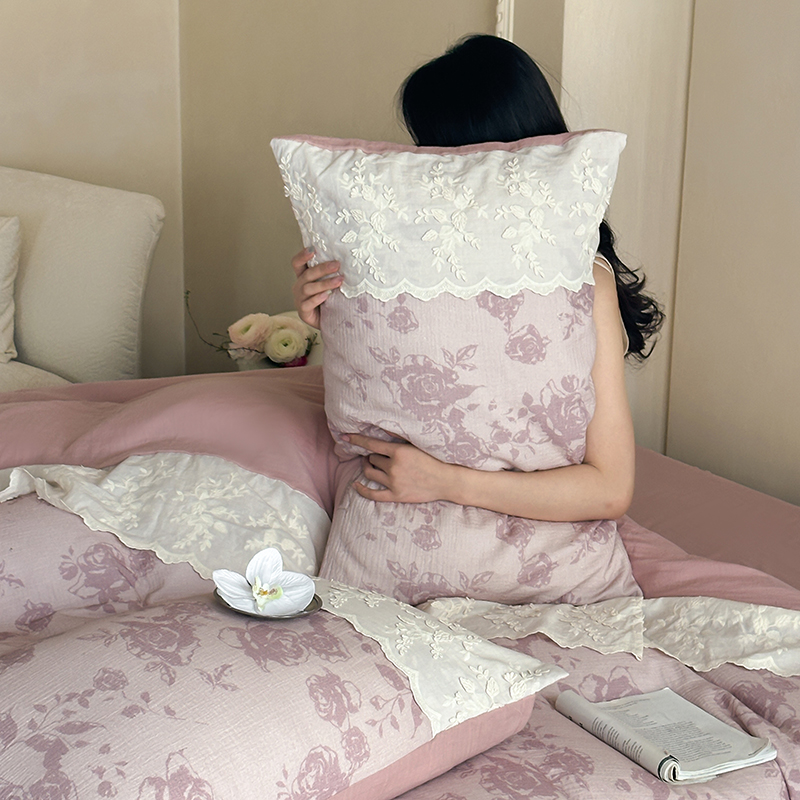 商品名称:(总)多乐娜 2025新款法式纯棉双层纱皱皱纱花边款新疆长绒棉双层纱绉纱四件套印花工艺款