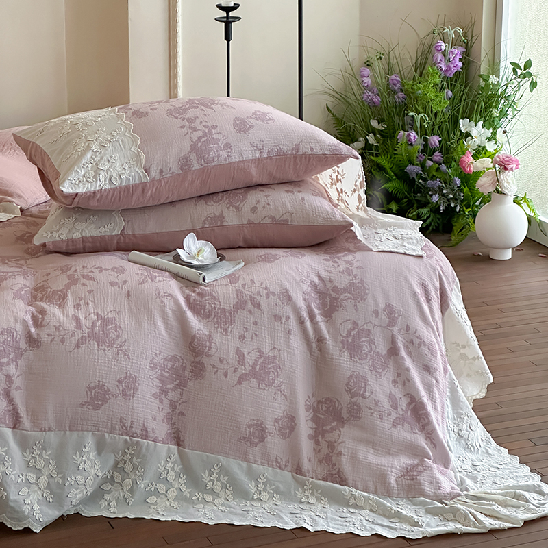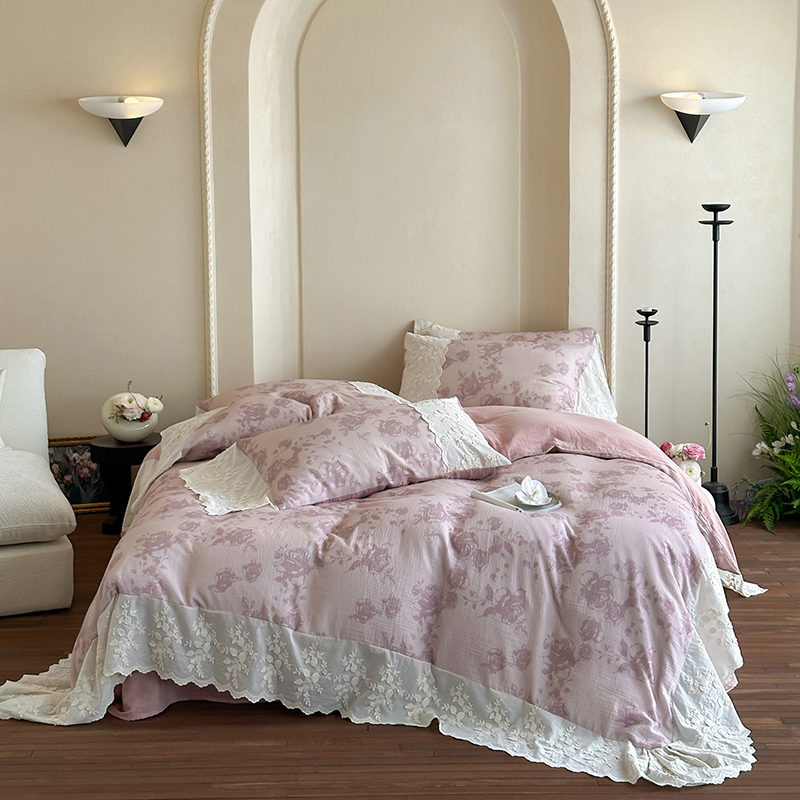 (总)多乐娜 2025新款法式纯棉双层纱皱皱纱花边款新疆长绒棉双层纱绉纱四件套印花工艺款