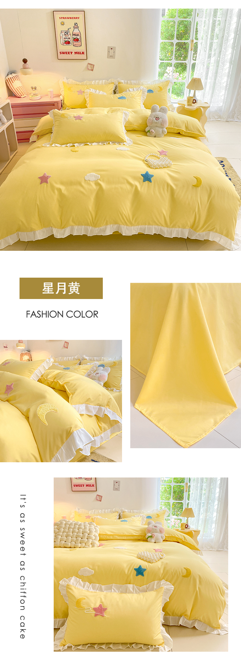 (总)雨菲家纺2025 网红爆款水洗棉小雏菊毛巾绣拼角宽边花边四件套,粉玉色,姜黄色,浅绿色,浅紫色,小橘子-白加粉