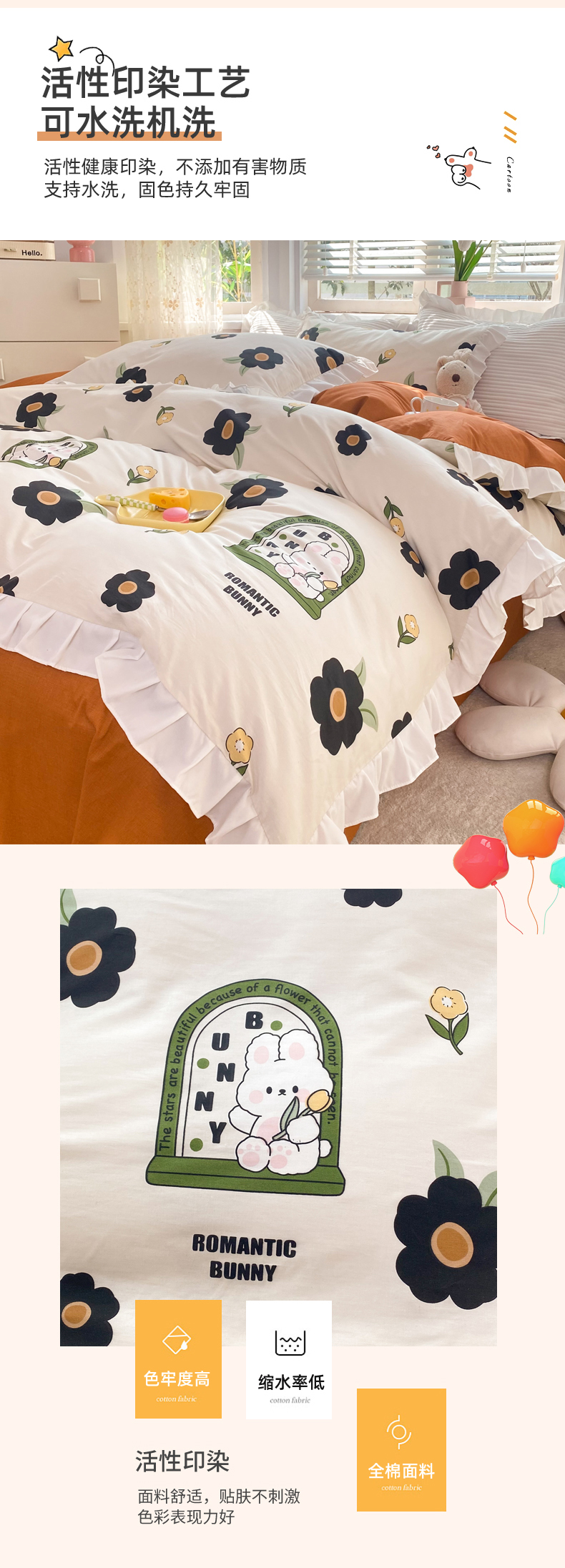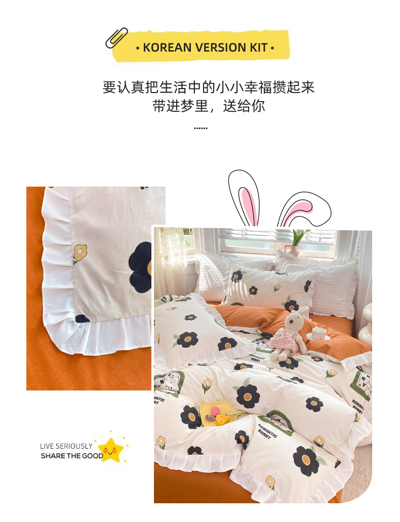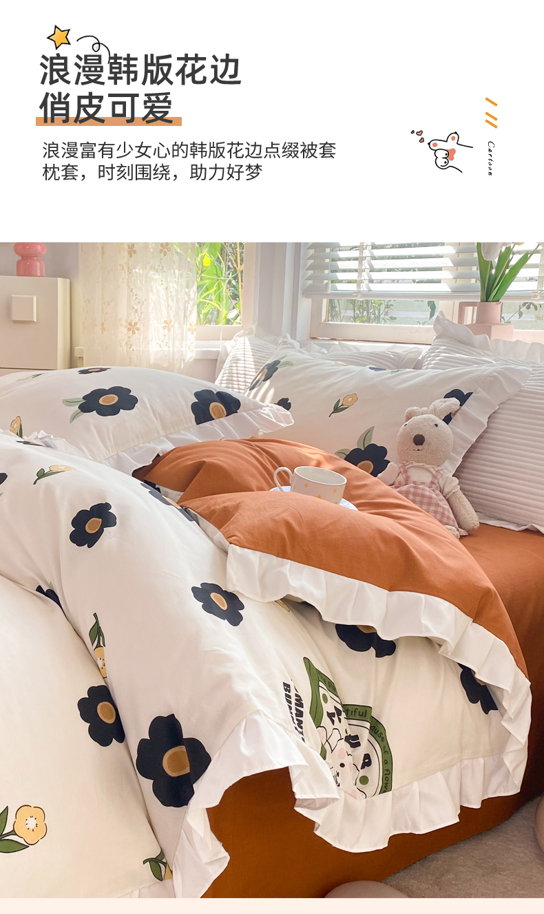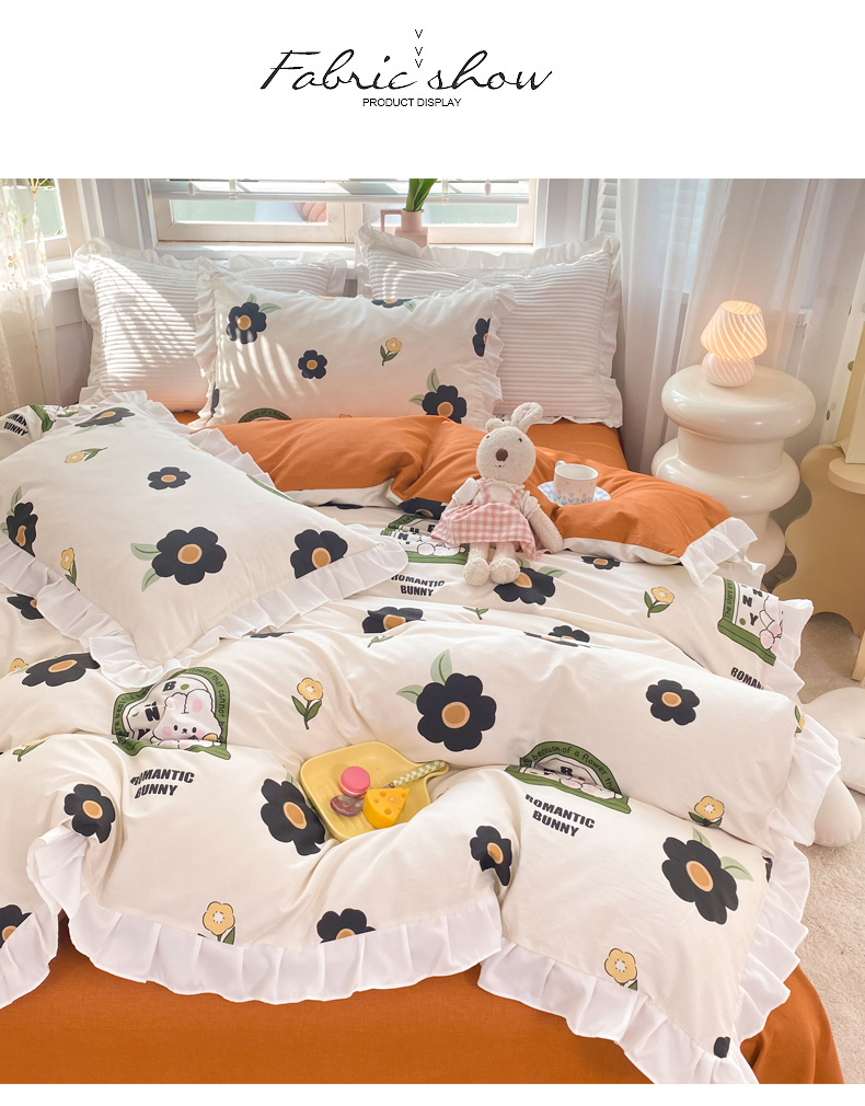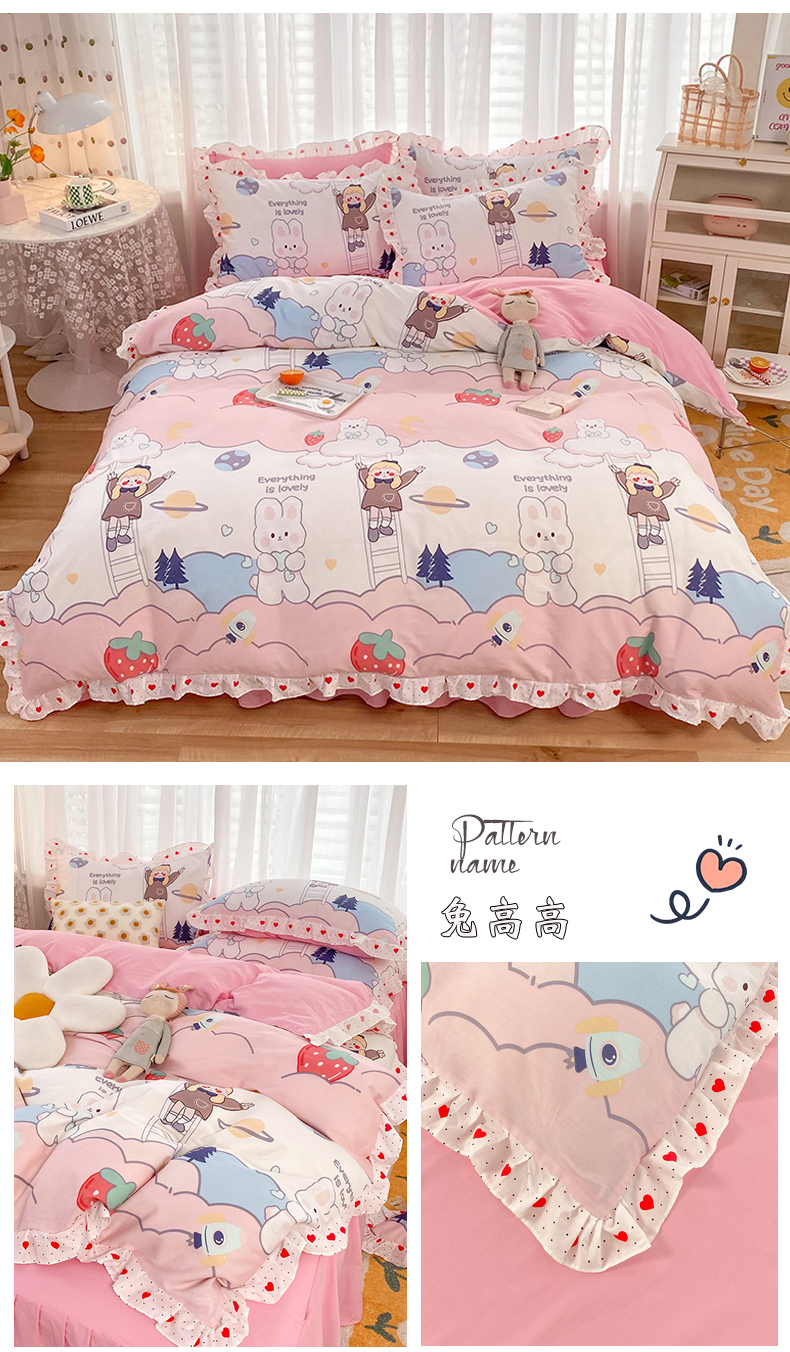 商品名称:玉元坊 2025春夏新款公主风全棉纯棉花边被套床单四件套 邦尼兔