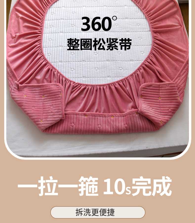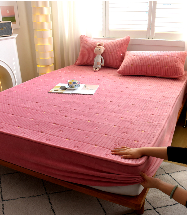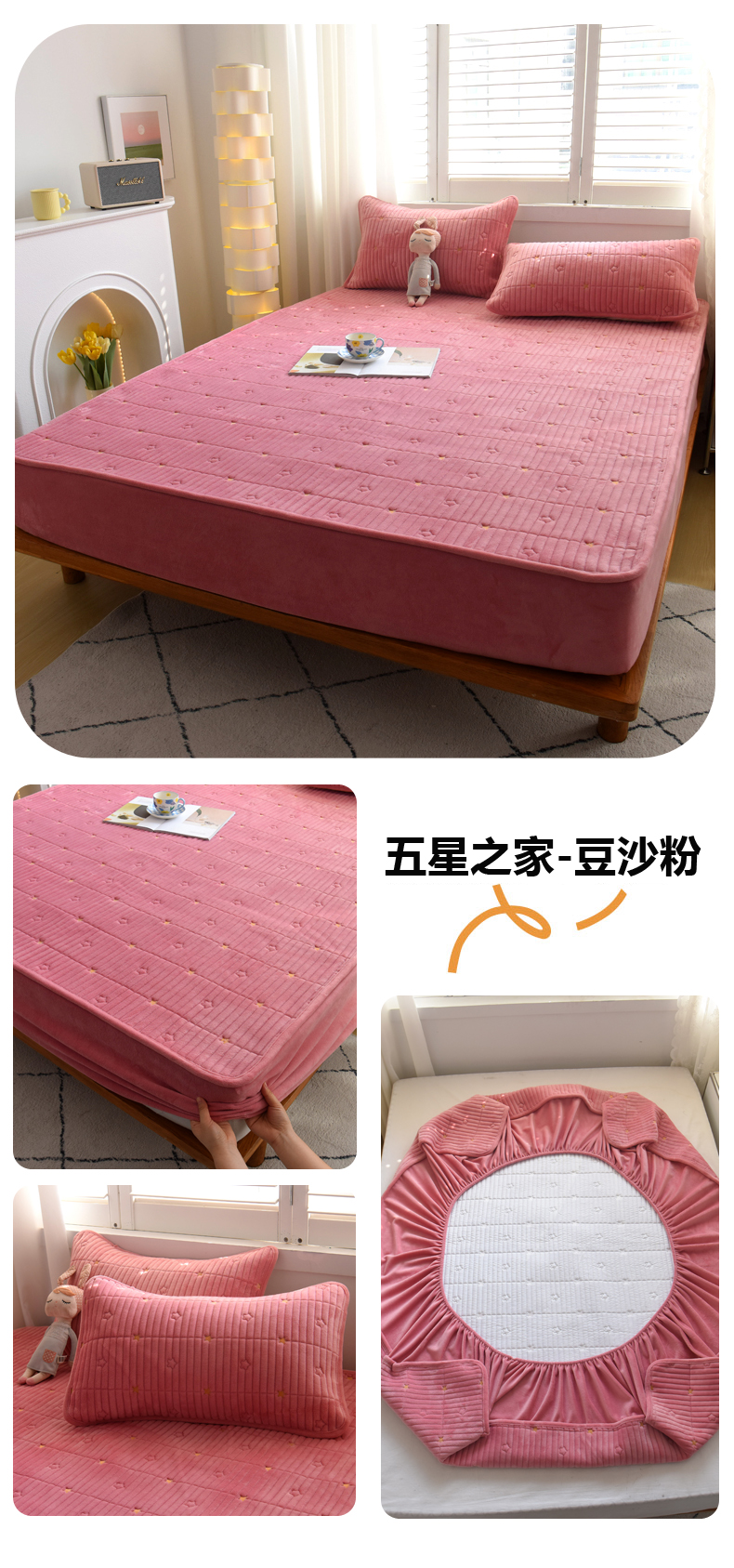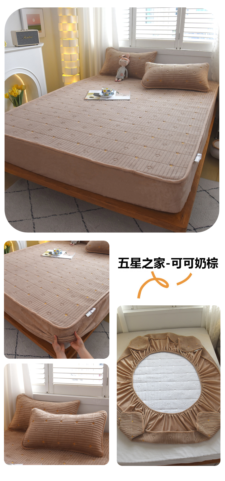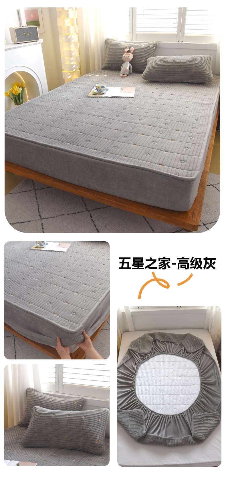 水妙家纺 2024秋冬保暖200克A类牛奶绒刺绣加厚夹棉床笠三件套纯色素色床罩大床款床垫保护罩 五星之家-高级灰