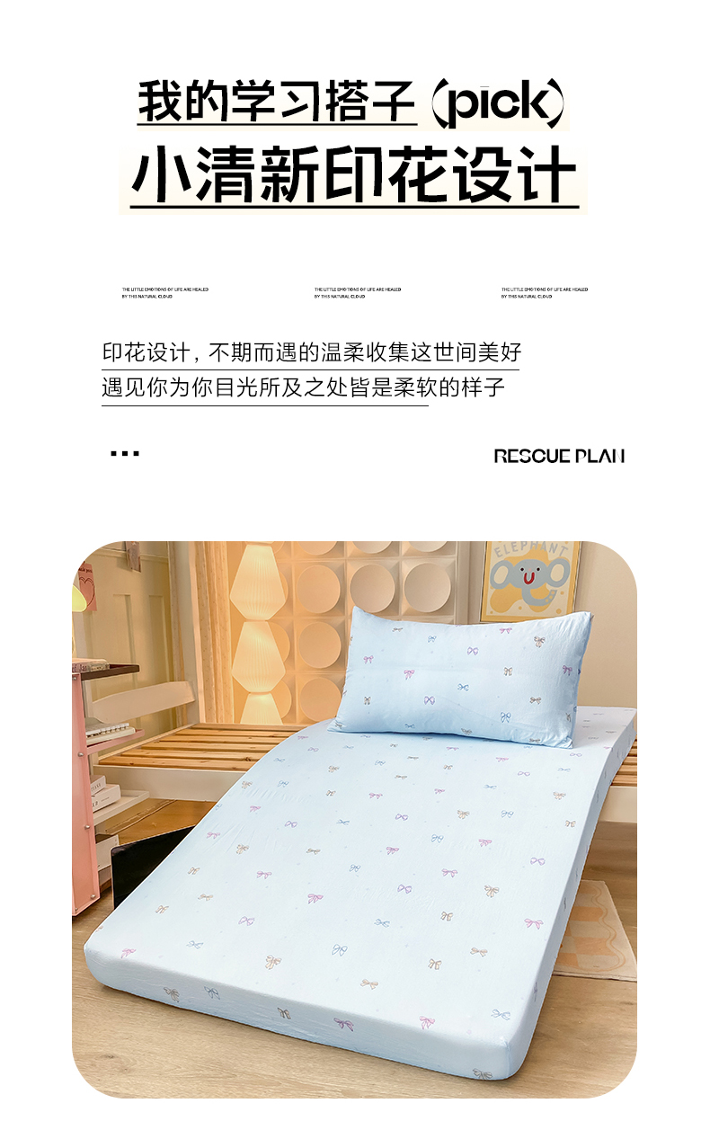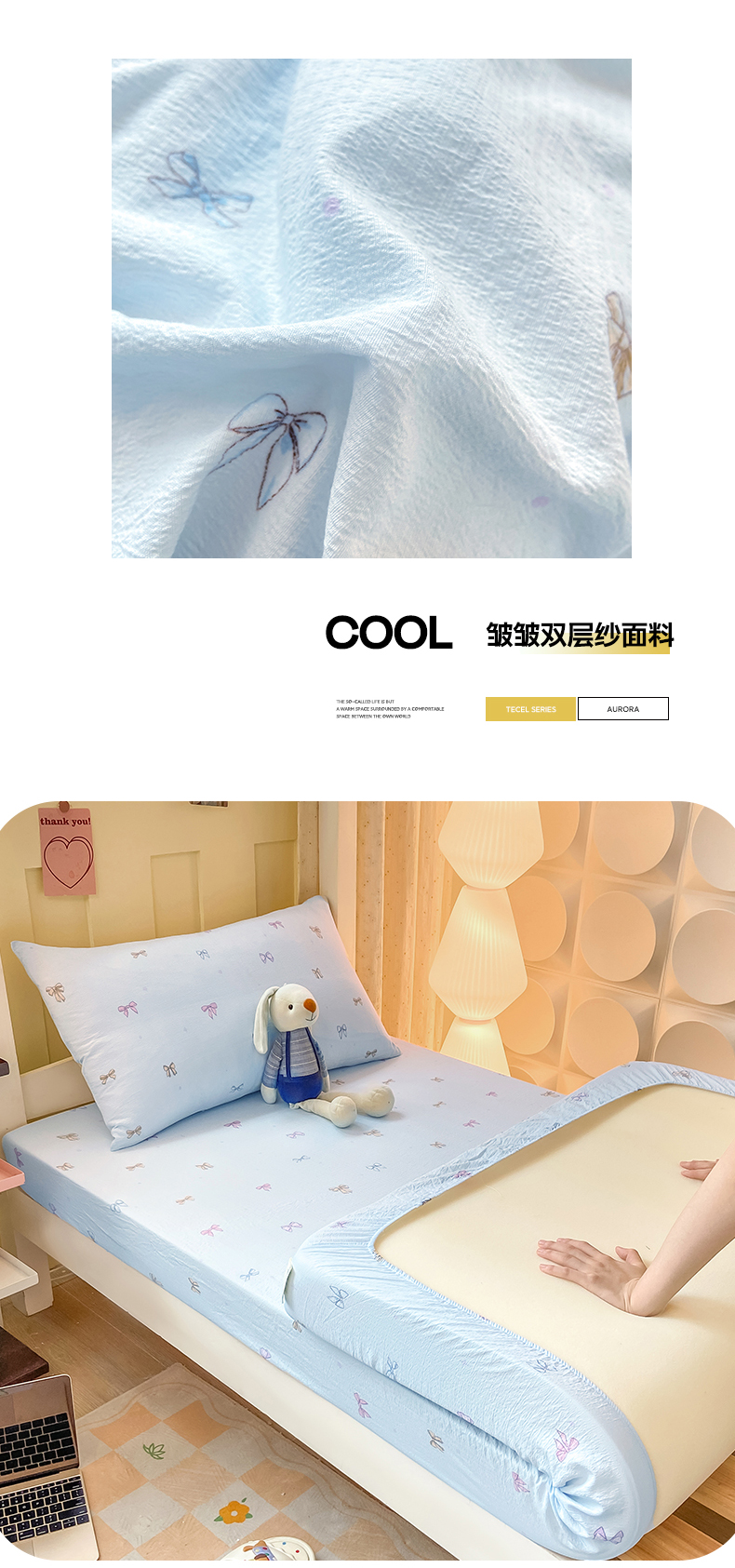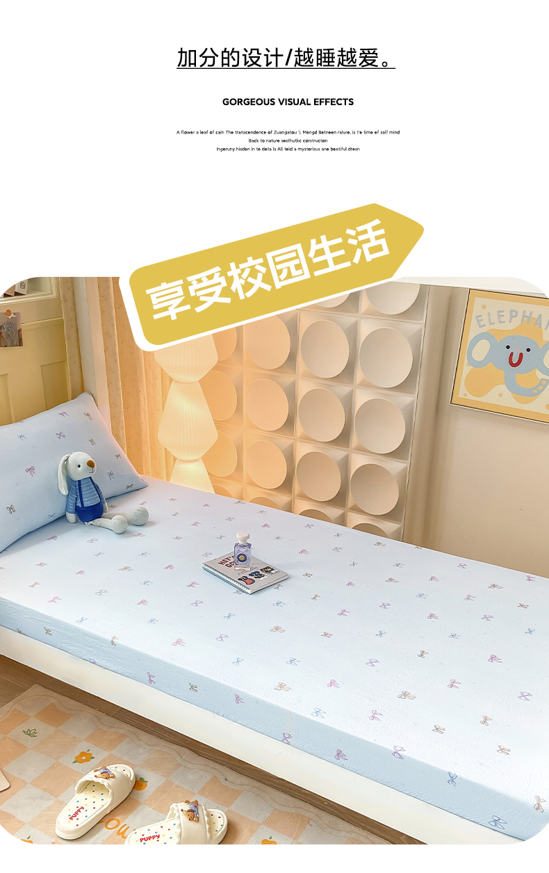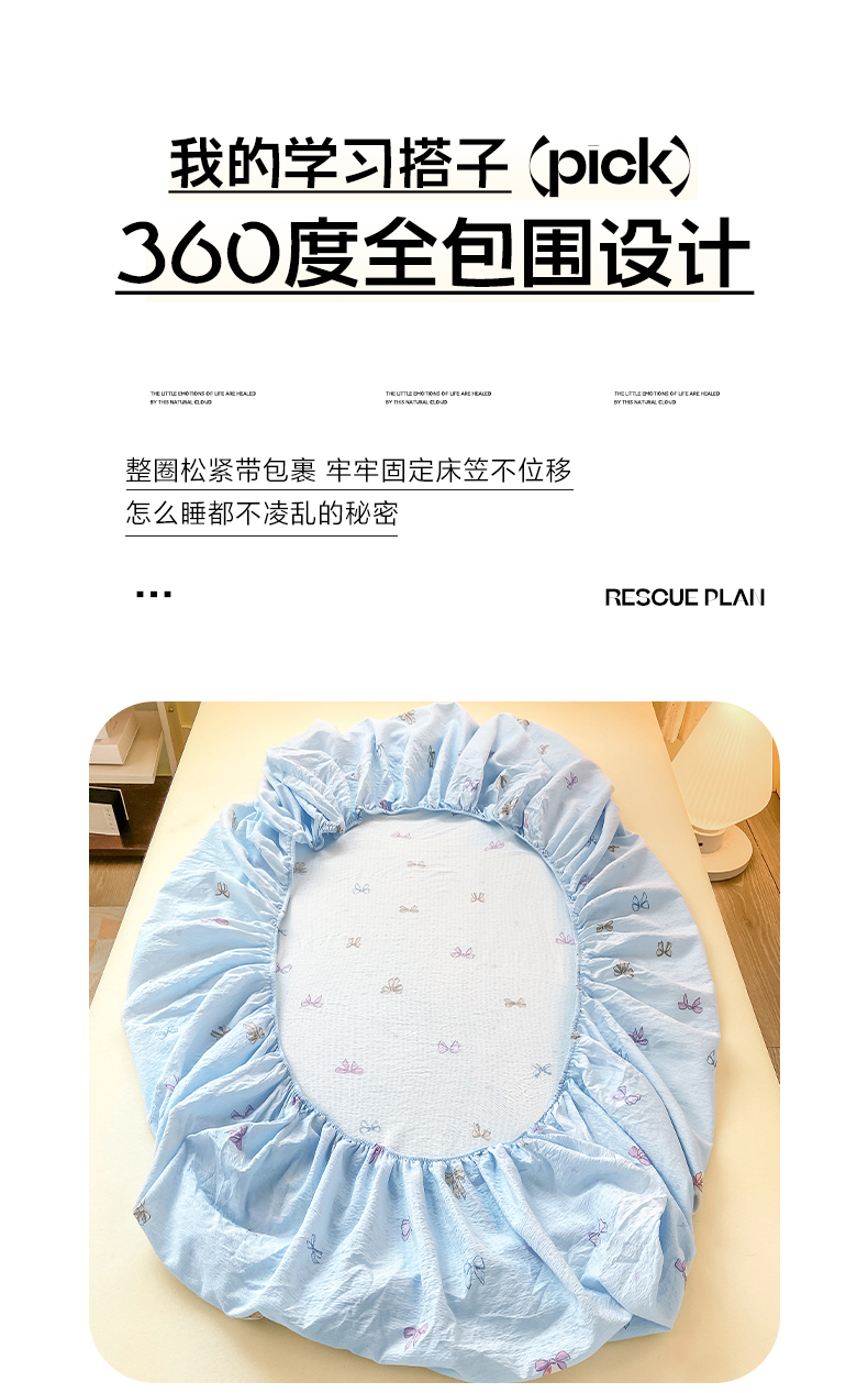 • 91家纺网 家纺一手货源 找家纺 眠势力 2025新款ins云感双层纱学生宿舍上下铺奶油风云感四季款单床笠床笠单件 蓝调蝴蝶结