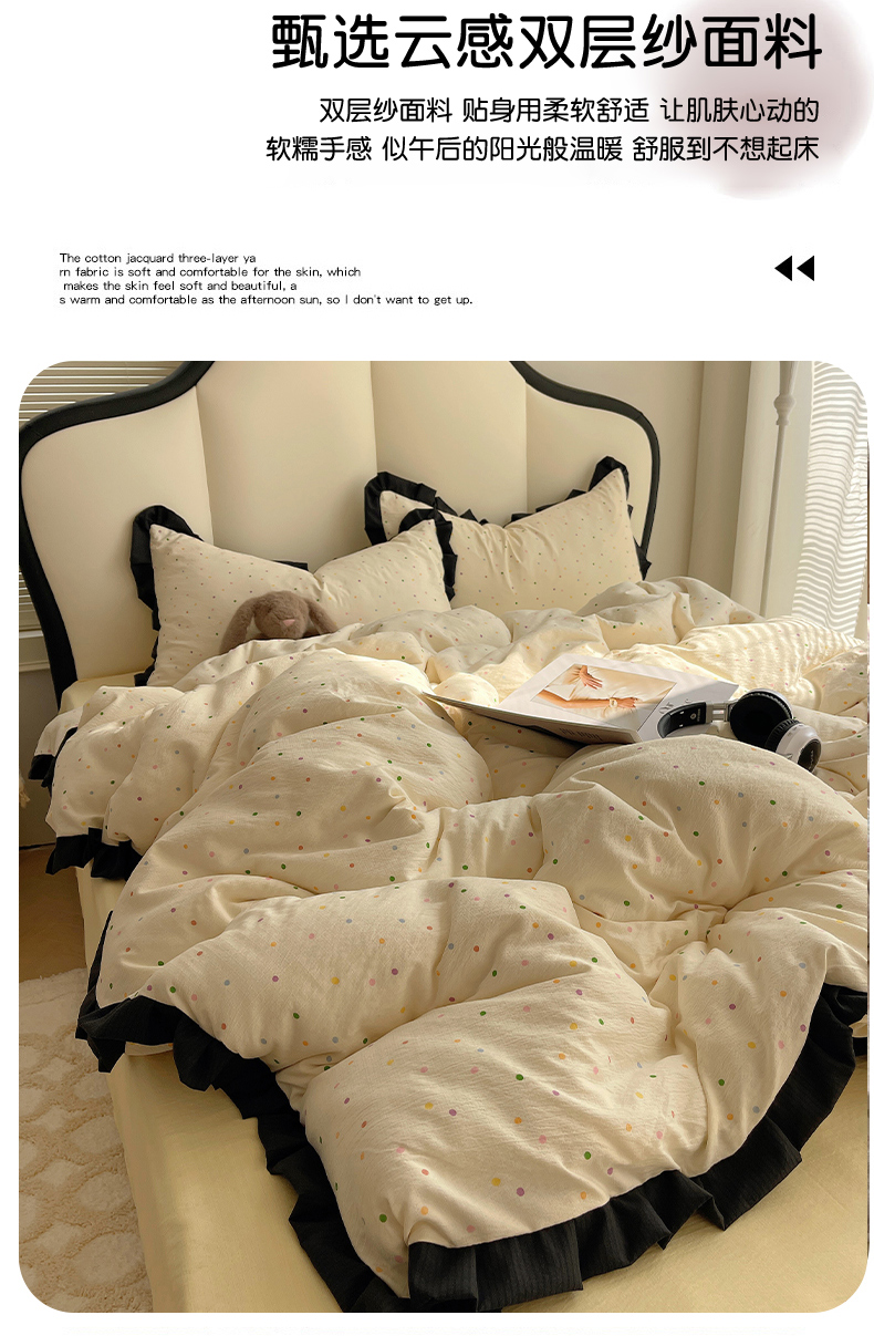 (总)韩巢家纺 2025新款黑皱皱双层纱花边款被套四件套直播热销款学生宿舍床单三件套-(提供卖家秀)