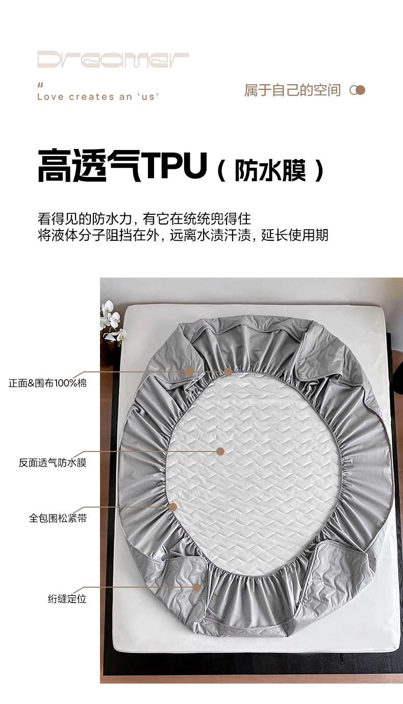 三味舒屋 2025新款防水全棉夹棉绗缝防水隔尿床笠-安缦 安缦灰