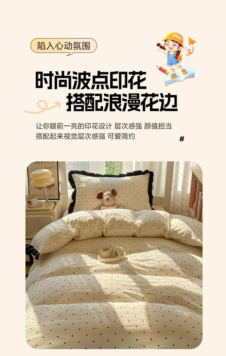 当前位置: 91家纺网 > 商品网购 > 床品套件 > 四件套 > 其它四件套 > 韩巢家纺 2025新款小波点学生宿舍寝室上下铺三件套开学季花边被套四件套 波点世界【黑皱皱花边款】