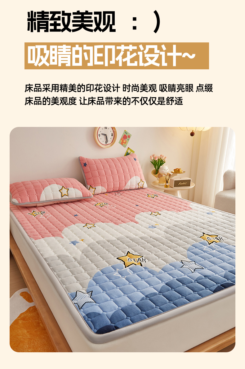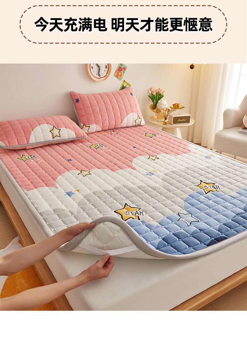(总)奇丝雅 2025新款A类牛奶绒泡泡绒床褥床垫床盖兔毛绒家用学生宿舍上下铺寝室褥子软垫床护垫夹棉(大床)场景二,星星猫咪,月亮湾,趴趴狗,繁星,爱心咖,樱桃猫咪,幻影灰,暖绒蓝,清新绿,柔和蓝