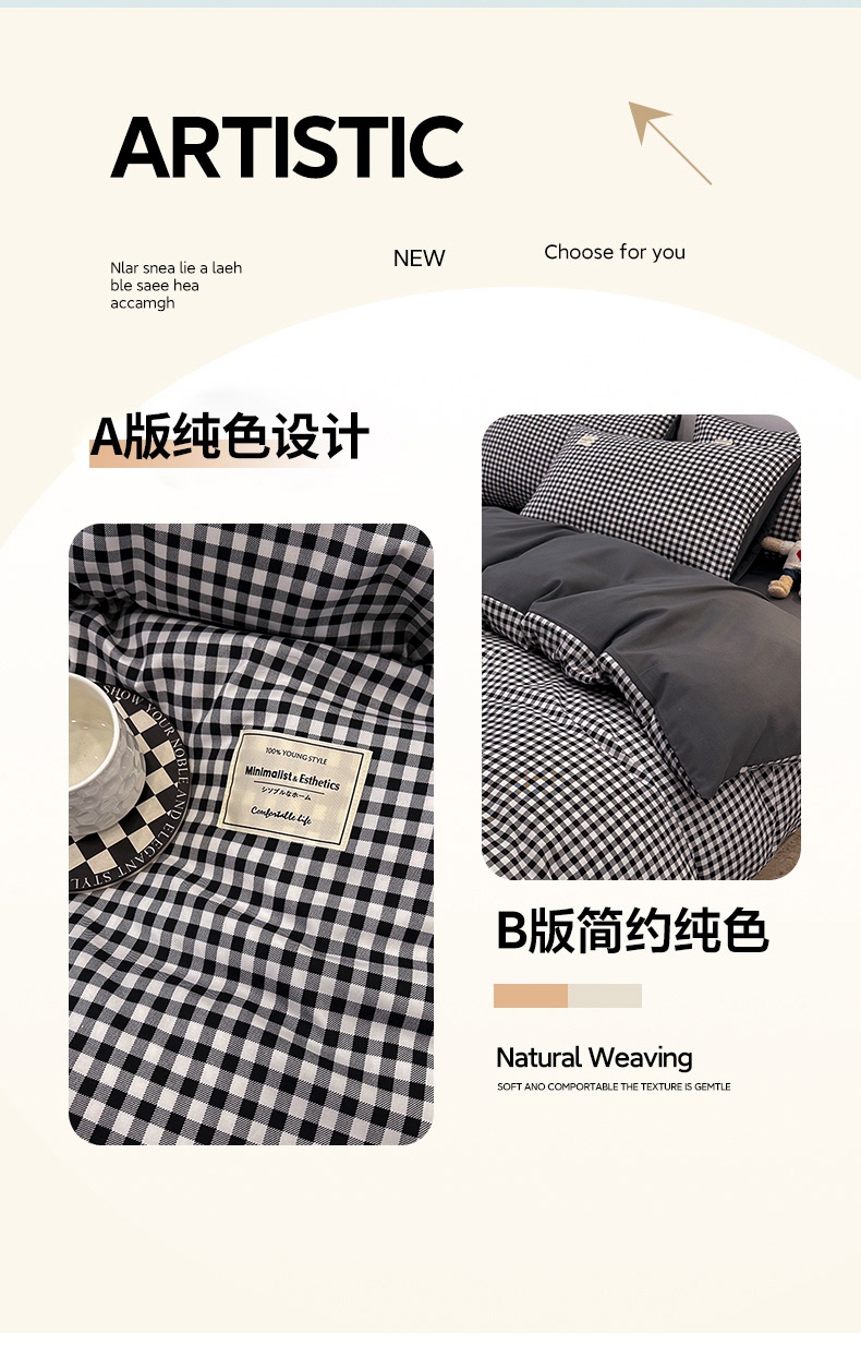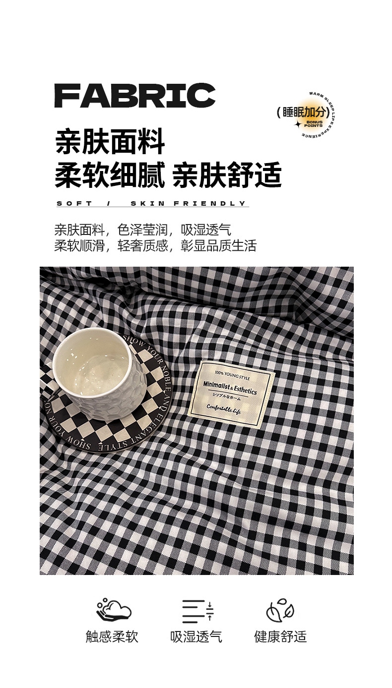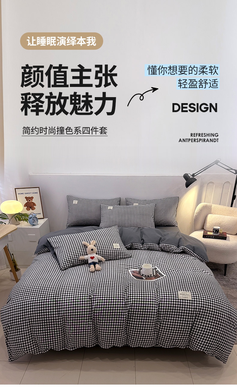 当前位置: 91家纺网 > 商品网购 > 床品套件 > 四件套 > 普通磨毛四件套 > 优纤家纺 2025新款简约亲肤四件套床单床笠学生三件套-格子条纹系列 黑白小格